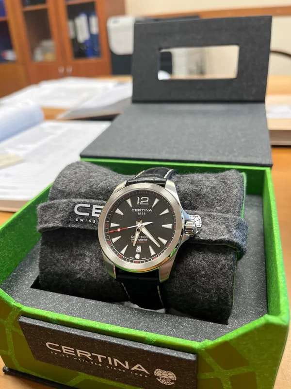 Модель поможет грамотно завершить образ на повседневную прогулку, переговоры с бизнес-партнёрами, на торжественный вечер. Элегантный облик дополнен спортивными деталями, внимание перенимает на себя оригинальная секундная стрелка. Кварцевый швейцарский механизм Precidrive™Precidrive™Инновационный кварцевый механизм Certina. Часы, оснащённые этим швейцарским калибром, приравниваются к точности к сертифицированным хронометрам, точность хода составляет +/-10 секунд в год. измеряет время с высокой точностью хода, часы официально удостоены сертификатом COSCСертификат COSCОфициальный сертификат, подтверждающий то, что часы ходят с особо высокой точностью. Для получения документа часы подвергаются тестовым испытаниям, разработанным швейцарским институтом тестирования хронометров COSC. Допустимая норма для механических часов -4/+6 секунд в день, для кварцевых моделей +/- 0,07 секунд в день.. Система DS ConceptDS ConceptDouble Security Concept, обозначает двойную надёжность и безупречную точность часов Certina. Двойная система защиты подразумевает обеспечение максимальной устойчивости к ударам и высоких показателей водонепроницаемости.. Стекло из сапфира с антибликовой обработкой. Водостойкость до 20 бар. Ремешок из натуральной кожи с тиснёной поверхностью. Корпус из хирургической стали 316L. Заводная головка с защитой. Люминесцентная подсветкаЛюминесцентное покрытиеПозволяет считывать показания времени в темноте. Производители наносят на стрелки, часовые индексы, безель или поверхность циферблата светонакопительный состав, дающий холодное свечение. стрелок и меток. Отображение числа, функция EOLEOLПредставляет собой систему, уведомляющую владельца часов о необходимости замены элемента питания. За 2 недели до полного разряда батарейки секундная стрелка перестаёт ходить чётко и начинает перепрыгивать на 3-4 деления.. Диаметр корпуса: 41,8 мм.