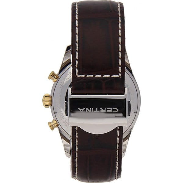 Стальной корпус оснащён алюминиевым безелемБезельВнешний ободок, закрепляющий стекло. В спортивных часах так называется поворотное кольцо с делениями на циферблате, выполняет роль таймера – замеряет отрезки времени на шкале. Неподвижный безель – элемент декора. Однонаправленно вращающийся безель на дайверских часах позволяет фиксировать моменты погружения и выныривания на поверхность.. Швейцарский кварцевый калибр ETA 251.264 Precidrive™Precidrive™Инновационный кварцевый механизм Certina. Часы, оснащённые этим швейцарским калибром, приравниваются к точности к сертифицированным хронометрам, точность хода составляет +/-10 секунд в год., способствует работе секундомера, измеряющего время с точностью до 1/100 секунды. Функции: хронографХронографФункция позволяет измерять отрезки времени с особой точностью: часы, минуты, секунды. Верным признаком хронографа является наличие на циферблате 3 дополнительных окошек-счётчиков., дата, EOLEOLПредставляет собой систему, уведомляющую владельца часов о необходимости замены элемента питания. За 2 недели до полного разряда батарейки секундная стрелка перестаёт ходить чётко и начинает перепрыгивать на 3-4 деления.. Ремешок сделан из натуральной кожи.