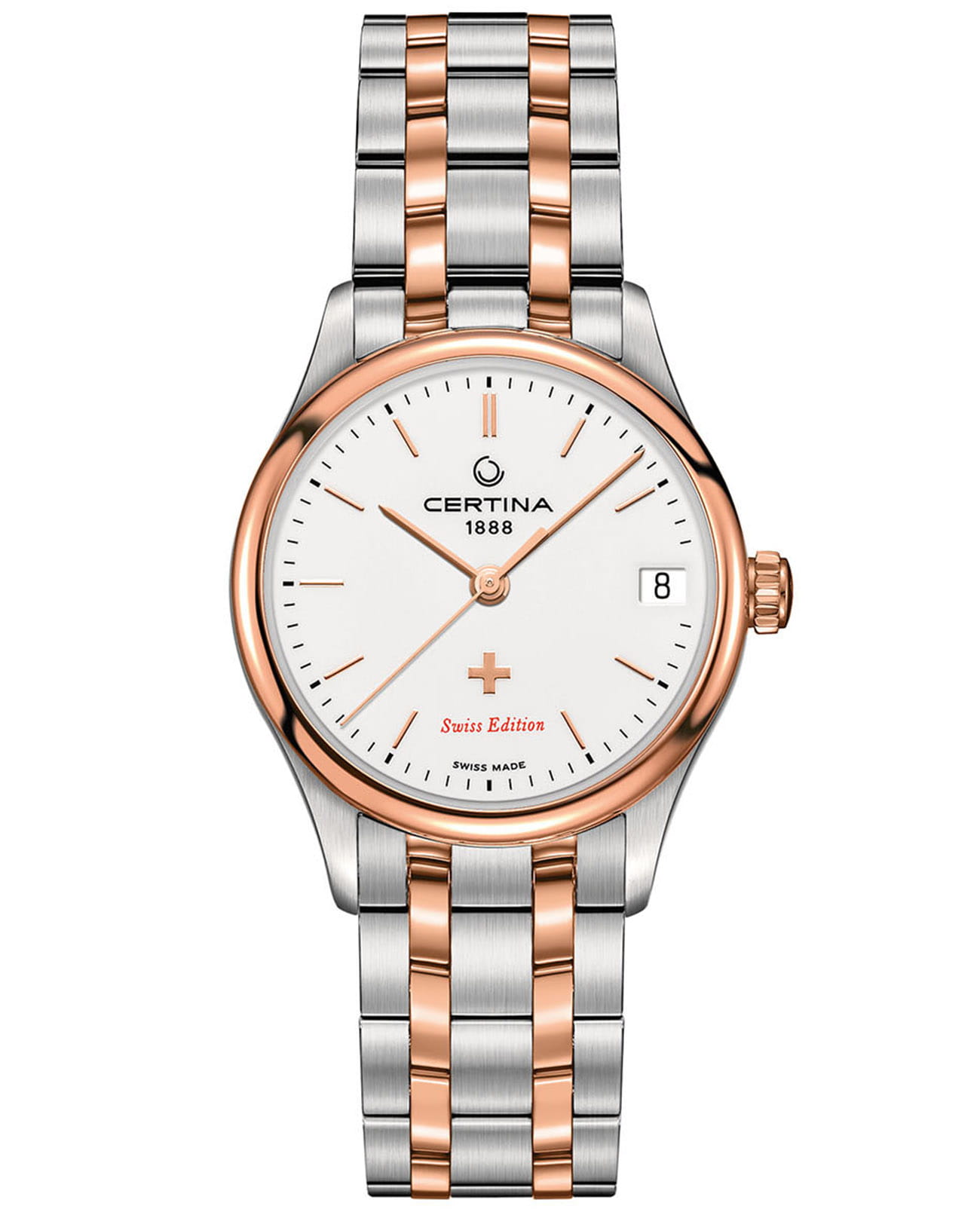 Женские швейцарские наручные часы с сапфировым стекломСапфировое стеклоПрочный и надёжный материал из кристалла сапфира синтетического происхождения, характеризующийся особой твёрдостью и устойчивостью к царапинам и повреждениям. Certina DS-8 Lady Powermatic 80 C033.207.22.011.00, механический механизм (автоматический калибр) с высокой точностью. Сапфировое стеклоСапфировое стеклоПрочный и надёжный материал из кристалла сапфира синтетического происхождения, характеризующийся особой твёрдостью и устойчивостью к царапинам и повреждениям. устойчивое к появлению царапин, обладающее высокой прозрачностью. Класс водозащиты: 100 метров, позволит плавать, нырять и заниматься другими водными видами спорта. Корпус и браслет часов изготовлены из стали с частичным с PVDPVDУльтратонкое покрытие наносится в технике вакуумного напыления, сочетает в себе нитрид титана особой прочности со слоем золота или оксида хрома. Несёт в себе декоративную или защитную функцию. цвета розовое золото. Браслет с застёжкой-бабочкой с кнопкамиЗастёжка "бабочка"Такой вид застёжки дополняется предохранителями, помогающими избежать случайного раскрытия браслета. Обладают изящным исполнением. .