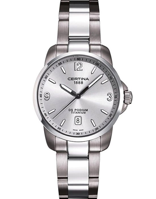 Наручные часы в серебристой расцветке выполнены из титана, материал высоко ценится за антимагнитные свойства. Это позволяет приближать точность хода швейцарского кварцевого механизма ETA F06.111 к идеальной отметке. Сапфировое стекло с антибликовым покрытием. Система DS ConceptDS ConceptDouble Security Concept, обозначает двойную надёжность и безупречную точность часов Certina. Двойная система защиты подразумевает обеспечение максимальной устойчивости к ударам и высоких показателей водонепроницаемости.. Стрелки и индексы с люминесцентным покрытиемЛюминесцентное покрытиеПозволяет считывать показания времени в темноте. Производители наносят на стрелки, часовые индексы, безель или поверхность циферблата светонакопительный состав, дающий холодное свечение.. Водостойкость WR 100. . Отображение текущей даты. Диаметр корпуса: 38 мм.