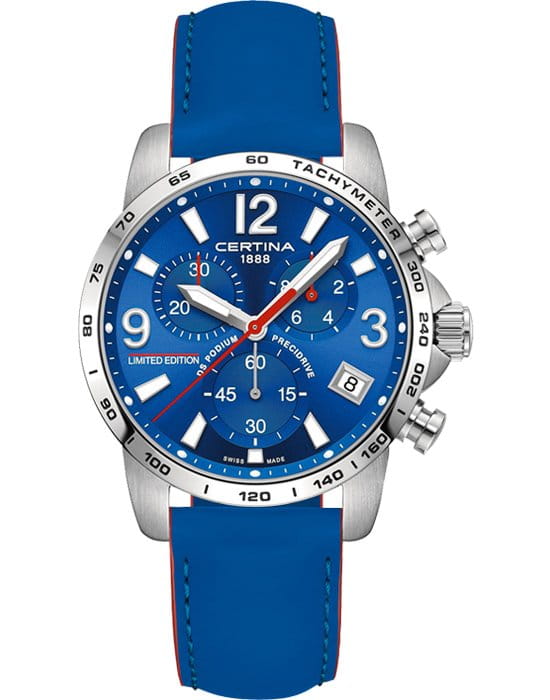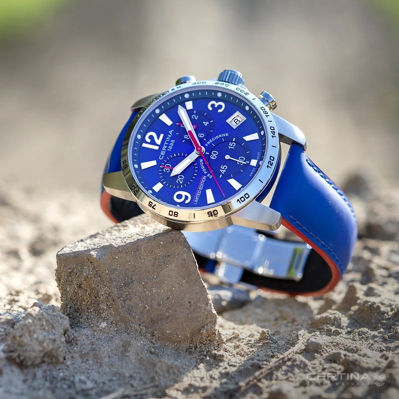 Новые пронумерованные модели DS Podium Chronograph 1/10sec Wilvo Limited Edition доступны в количестве 450 экземпляров Некоторые из моделей уже забронированы – и не без оснований: помимо менеджера команды Луиса Востерса эксклюзивные модели часов из рук президента Certina Адриана Боссара в Фрауэнфельде получат гонщики Wilvo Джереми Сивер, Шон Симпсон и Арно Тонус Разумеется, номера часов будут соответствовать номерам гонщиков: Джереми получит модель номер 91, Шон – 24 и Арно – номер 4 Новые модели переливаются синими бликами в официальном оттенке команды Wilvo Yamaha Official MXGP, дополненном красными стрелками хронографа Корпус из нержавеющей стали диаметром 41 мм скрывает ультрасовременный кварцевый часовой механизм Precidrive™, позволяющий отсчитывать десятые доли секунды в режиме реального времени Динамичное зрелище – как раз в духе MXGP!