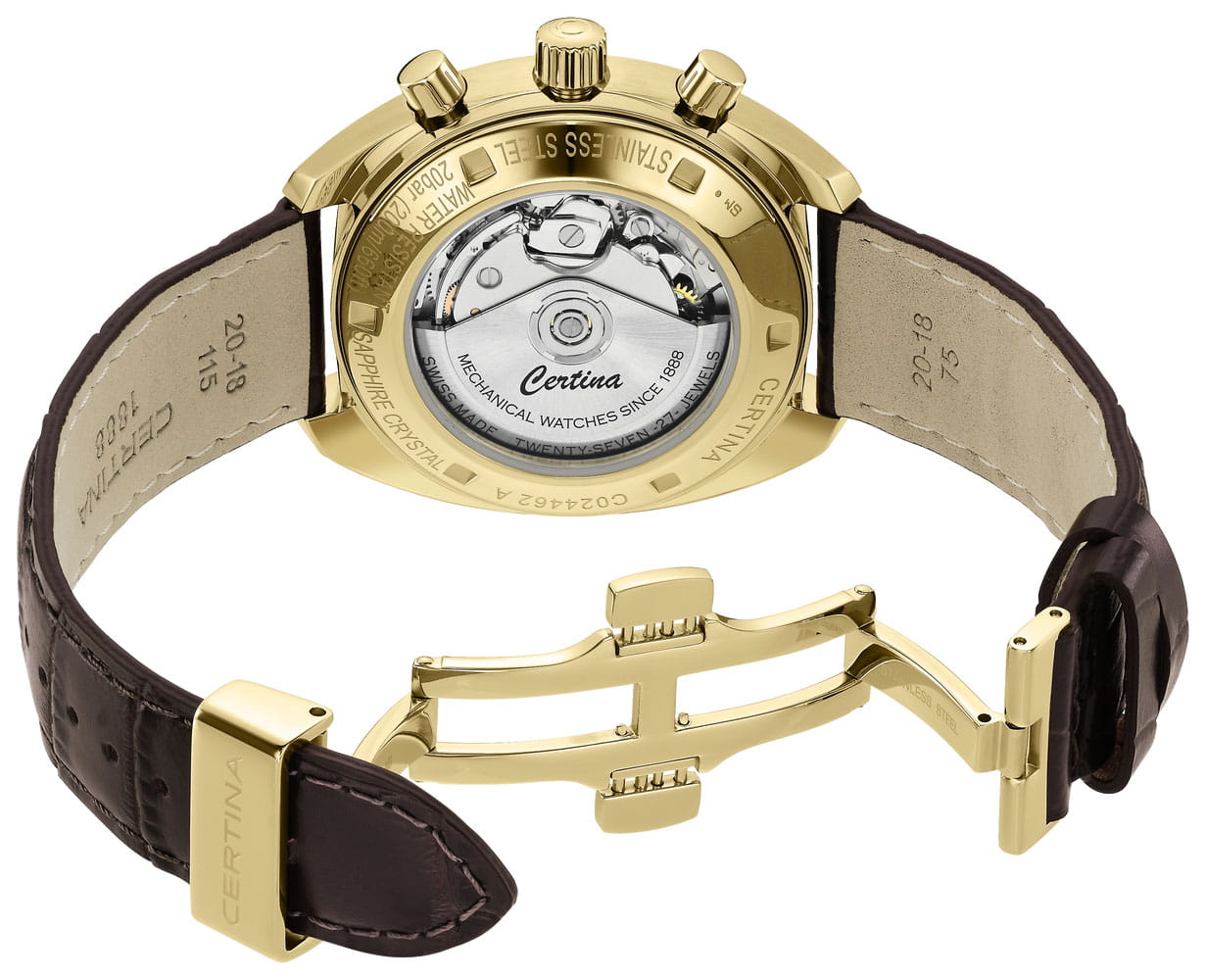 Новый хронографХронографФункция позволяет измерять отрезки времени с особой точностью: часы, минуты, секунды. Верным признаком хронографа является наличие на циферблате 3 дополнительных окошек-счётчиков. от Certina вдохновлен часами, которые были на пике своего времени – буквально! Предшественник модели DS-2 Chronograph Automatic доказал свои исключительные качества во время захватывающей экспедиции на Эверест. Новая модель переносит этот дух приключений в 21 век благодаря спортивно-элегантному винтажному дизайну и кремниевой технологии. Таким образом, традиционное мастерство стильно передается следующему поколению. Циферблат с люминесцентным покрытиемЛюминесцентное покрытиеПозволяет считывать показания времени в темноте. Производители наносят на стрелки, часовые индексы, безель или поверхность циферблата светонакопительный состав, дающий холодное свечение. стрелок и меток, дополнен сапфировым стекломСапфировое стеклоПрочный и надёжный материал из кристалла сапфира синтетического происхождения, характеризующийся особой твёрдостью и устойчивостью к царапинам и повреждениям., устойчивым к появлению царапин и обладающее высокой прозрачностью. Корпус из нержавеющей стали 316L c PVDPVDУльтратонкое покрытие наносится в технике вакуумного напыления, сочетает в себе нитрид титана особой прочности со слоем золота или оксида хрома. Несёт в себе декоративную или защитную функцию. покрытием. Кожаный браслет оснащен надежной и весьма удобной в пользовании застёжкой-бабочкой с кнопкамиЗастёжка "бабочка"Такой вид застёжки дополняется предохранителями, помогающими избежать случайного раскрытия браслета. Обладают изящным исполнением. .