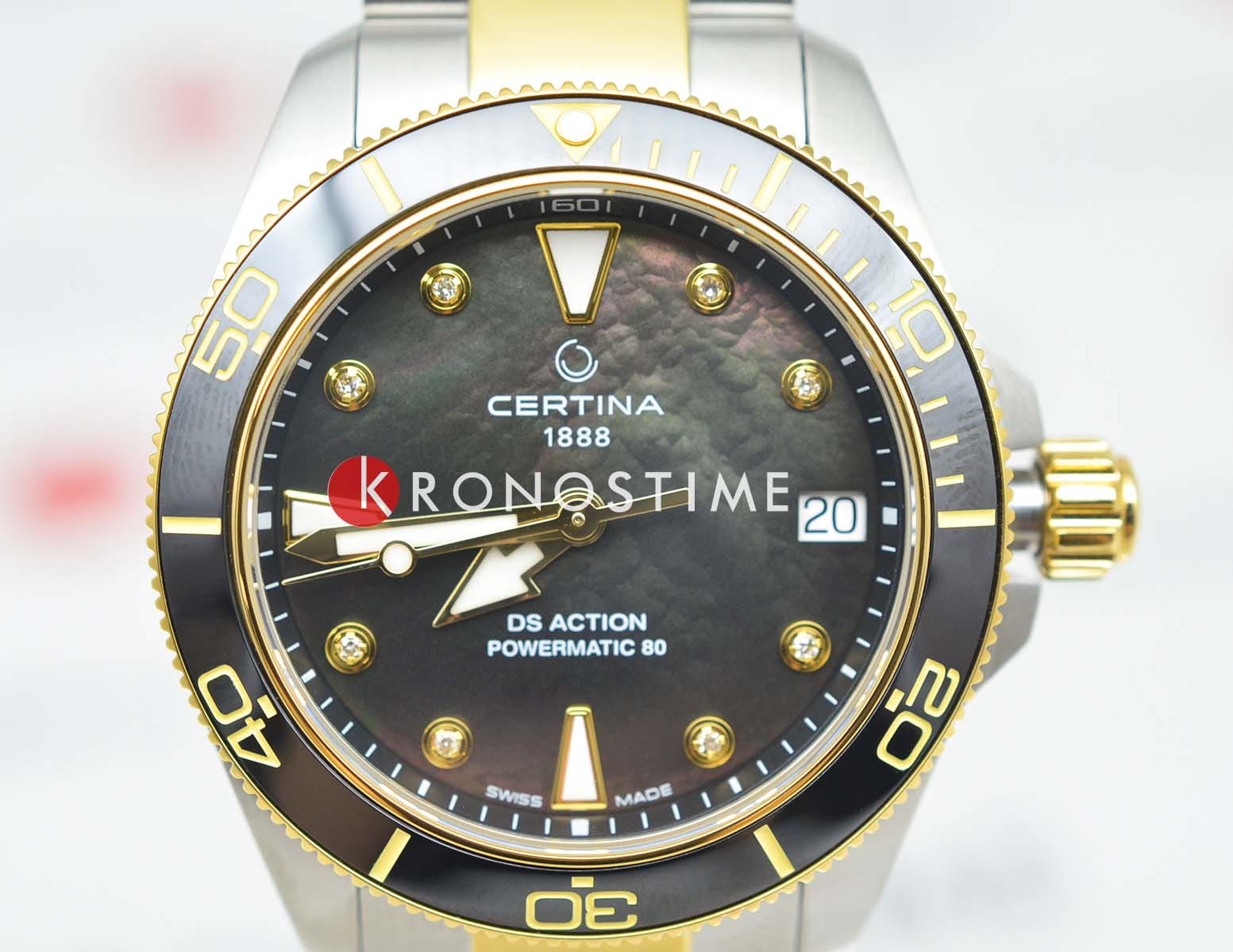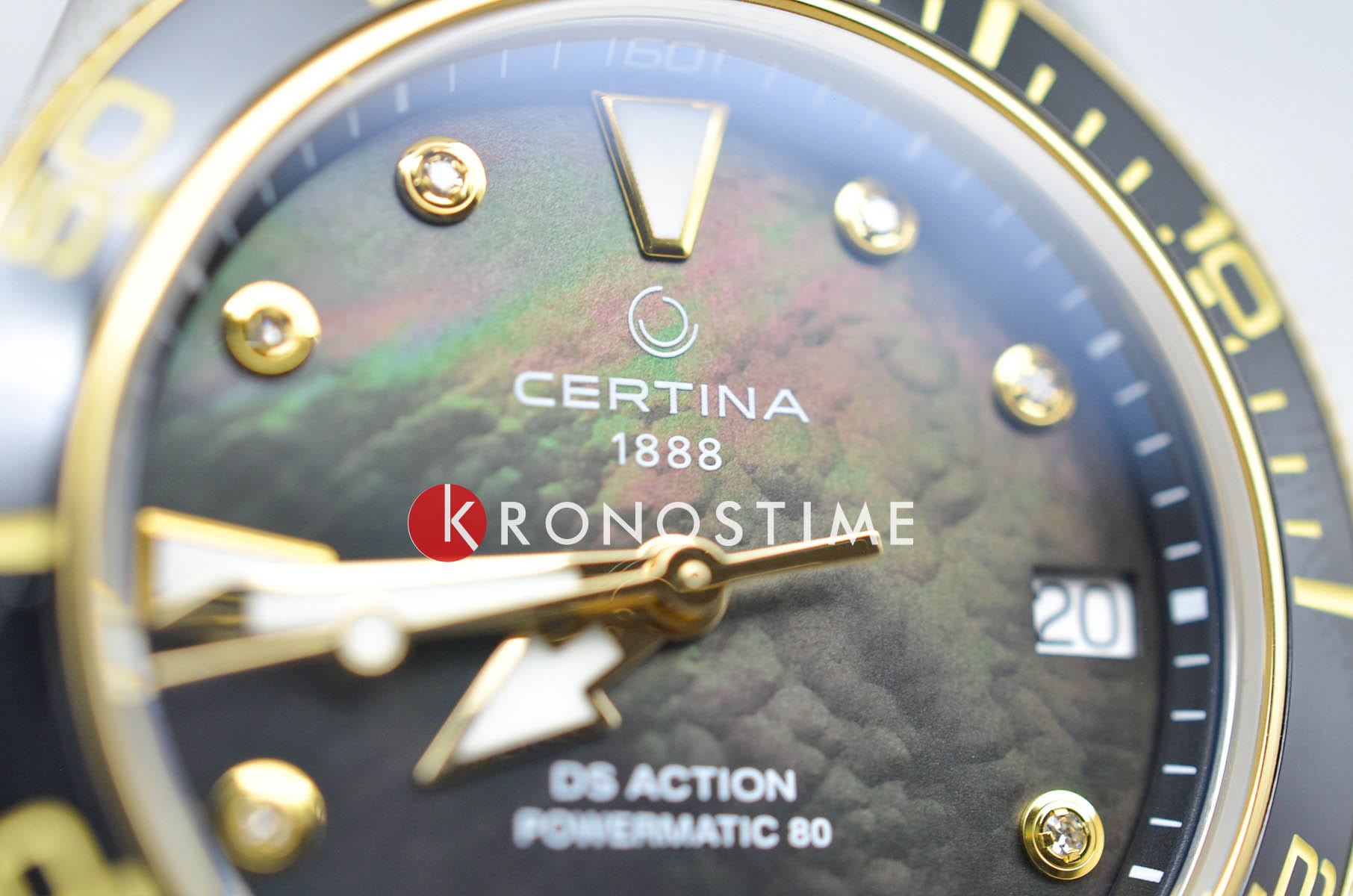 Certina DS Action Lady C032.007.22.126.00 – женские часы для поклонников ярких аксессуаров. И корпус, и браслет изготовлены из высококачественной нержавеющей стали 316L с PVD-покрытиемPVDУльтратонкое покрытие наносится в технике вакуумного напыления, сочетает в себе нитрид титана особой прочности со слоем золота или оксида хрома. Несёт в себе декоративную или защитную функцию.. Под твердым сапфировым стекломСапфировое стеклоПрочный и надёжный материал из кристалла сапфира синтетического происхождения, характеризующийся особой твёрдостью и устойчивостью к царапинам и повреждениям. с антибликовым покрытиемАнтибликовое покрытиеСлой оксида металла в 0,13-0,3 микрон, благодаря которому стекло часов не бликует и не отражает свет. Антибликовое покрытие уменьшает отражение света в 10 раз, обеспечивая отличную читаемость показателей циферблата. находится перламутрово-черный циферблат, украшенный бриллиантам и на котором вы найдете окошко даты в положении 3 часа, а также маркировку, покрытую люминесцентным покрытиемЛюминесцентное покрытиеПозволяет считывать показания времени в темноте. Производители наносят на стрелки, часовые индексы, безель или поверхность циферблата светонакопительный состав, дающий холодное свечение. Super-LumiNova. Керамический безельБезельВнешний ободок, закрепляющий стекло. В спортивных часах так называется поворотное кольцо с делениями на циферблате, выполняет роль таймера – замеряет отрезки времени на шкале. Неподвижный безель – элемент декора. Однонаправленно вращающийся безель на дайверских часах позволяет фиксировать моменты погружения и выныривания на поверхность. с черным PVD-покрытиемPVDУльтратонкое покрытие наносится в технике вакуумного напыления, сочетает в себе нитрид титана особой прочности со слоем золота или оксида хрома. Несёт в себе декоративную или защитную функцию. имеет минутную шкалу и вращается в одном направлении, что позволяет удобно измерять временные отрезки. Все это приводится в действие автоматическим механизмом Powermatic 80Powermatic 80Эксклюзивный калибр от швейцарской компании ETA с увеличенным запасом хода до 80 часов за счёт удлинённой заводной пружины. Характеризуется улучшенной системой спуска со сниженным трением..611 с пружиной Nivachron™Nivachron™Специально разработанный инновационный сплав Nivachron™ повышает устойчивость часов к воздействию магнитных полей.. Класс водозащиты: 300 метров, позволит плавать, нырять и заниматься другими водными видами спорта. Стальной браслет на застёжке-бабочке с кнопкамиЗастёжка "бабочка"Такой вид застёжки дополняется предохранителями, помогающими избежать случайного раскрытия браслета. Обладают изящным исполнением. .