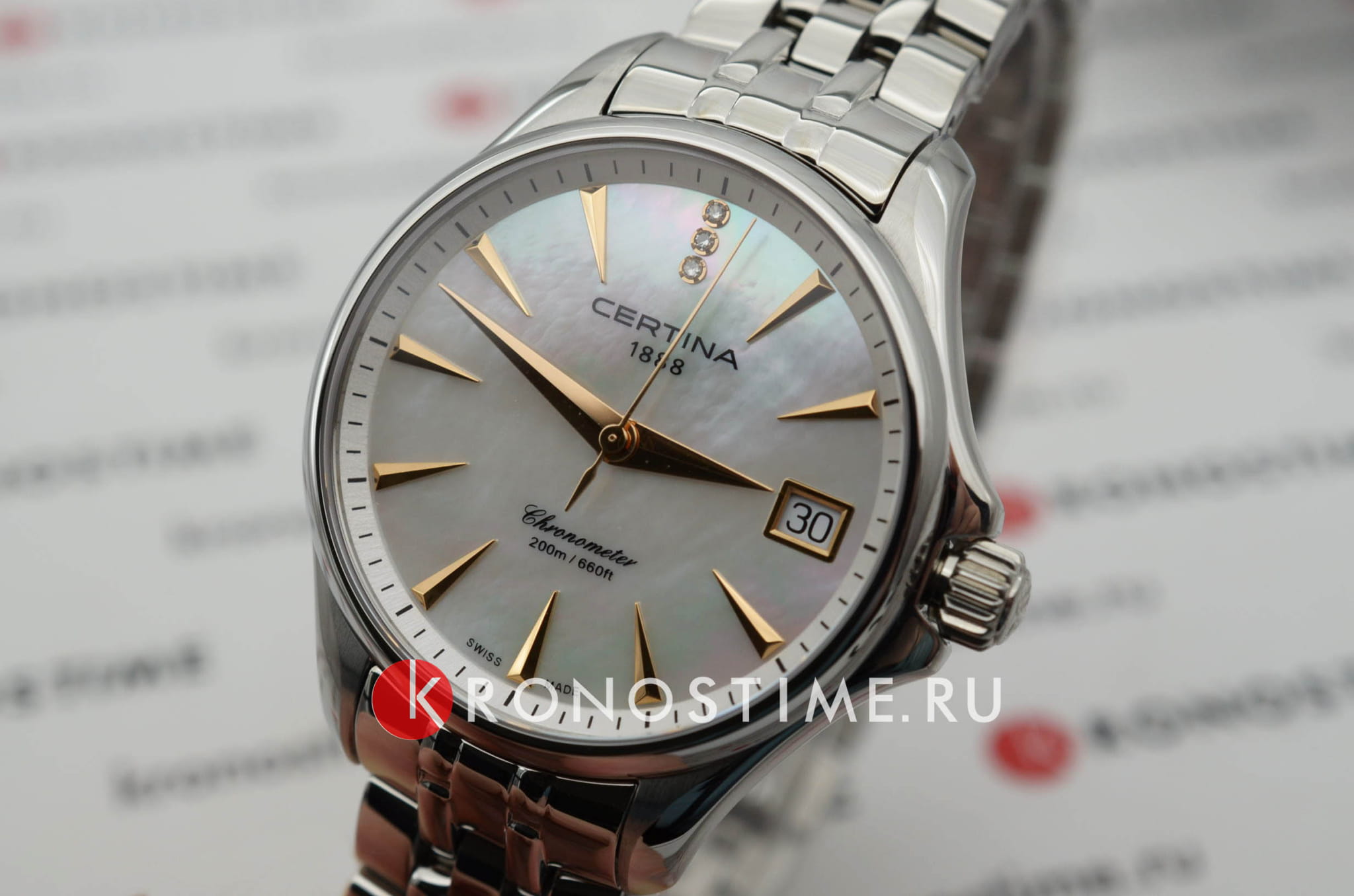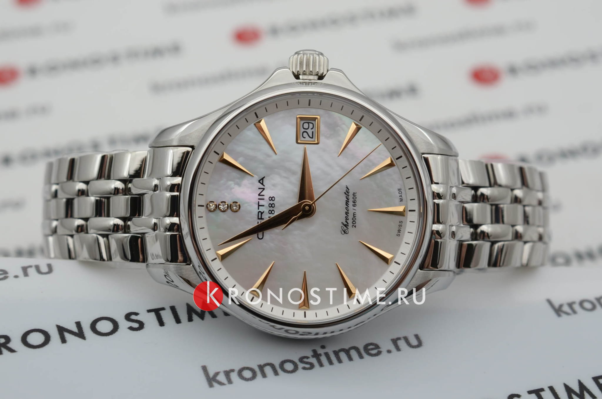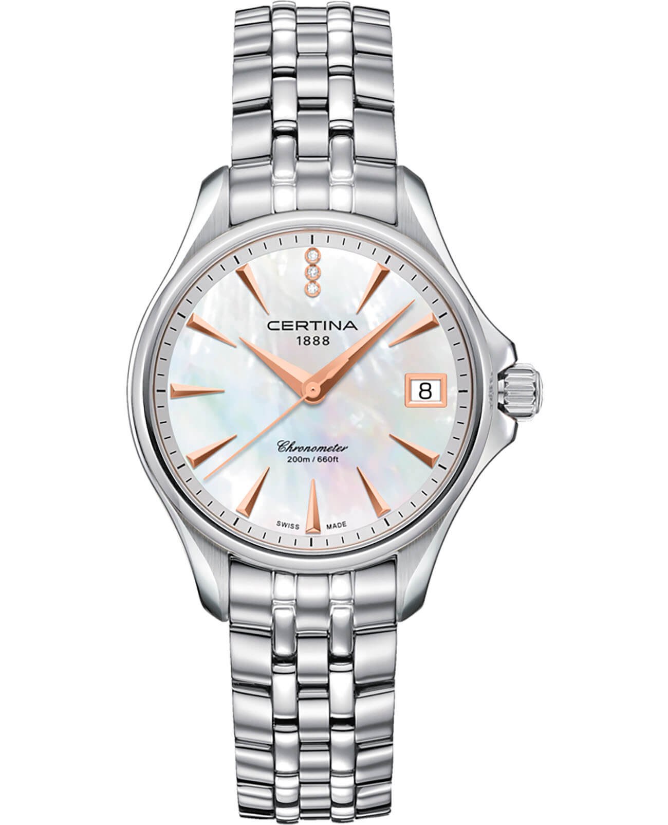 Модель привлекает романтическими элементами оформления. Перламутровый циферблат дополнен контрастными метками, что гарантирует идеальную читаемость показателей даже при беглом взгляде. Вместо метки 12 часов – 3 роскошных бриллианта оттенка Top Wesselton. Часы работают за счёт швейцарского кварцевого механизма ETA F06.411 Precidrive™Precidrive™Инновационный кварцевый механизм Certina. Часы, оснащённые этим швейцарским калибром, приравниваются к точности к сертифицированным хронометрам, точность хода составляет +/-10 секунд в год.. Его точность хода +/-10 секунд в год отмечена сертификатом хронометра COSCСертификат COSCОфициальный сертификат, подтверждающий то, что часы ходят с особо высокой точностью. Для получения документа часы подвергаются тестовым испытаниям, разработанным швейцарским институтом тестирования хронометров COSC. Допустимая норма для механических часов -4/+6 секунд в день, для кварцевых моделей +/- 0,07 секунд в день.. Концепция DS ConceptDS ConceptDouble Security Concept, обозначает двойную надёжность и безупречную точность часов Certina. Двойная система защиты подразумевает обеспечение максимальной устойчивости к ударам и высоких показателей водонепроницаемости. гарантирует повышенную ударопрочность часов. Сохраняется водостойкость при давлении 20 бар. Браслет дополнен . В правой части – апертура даты. Диаметр корпуса: 33,8 мм.