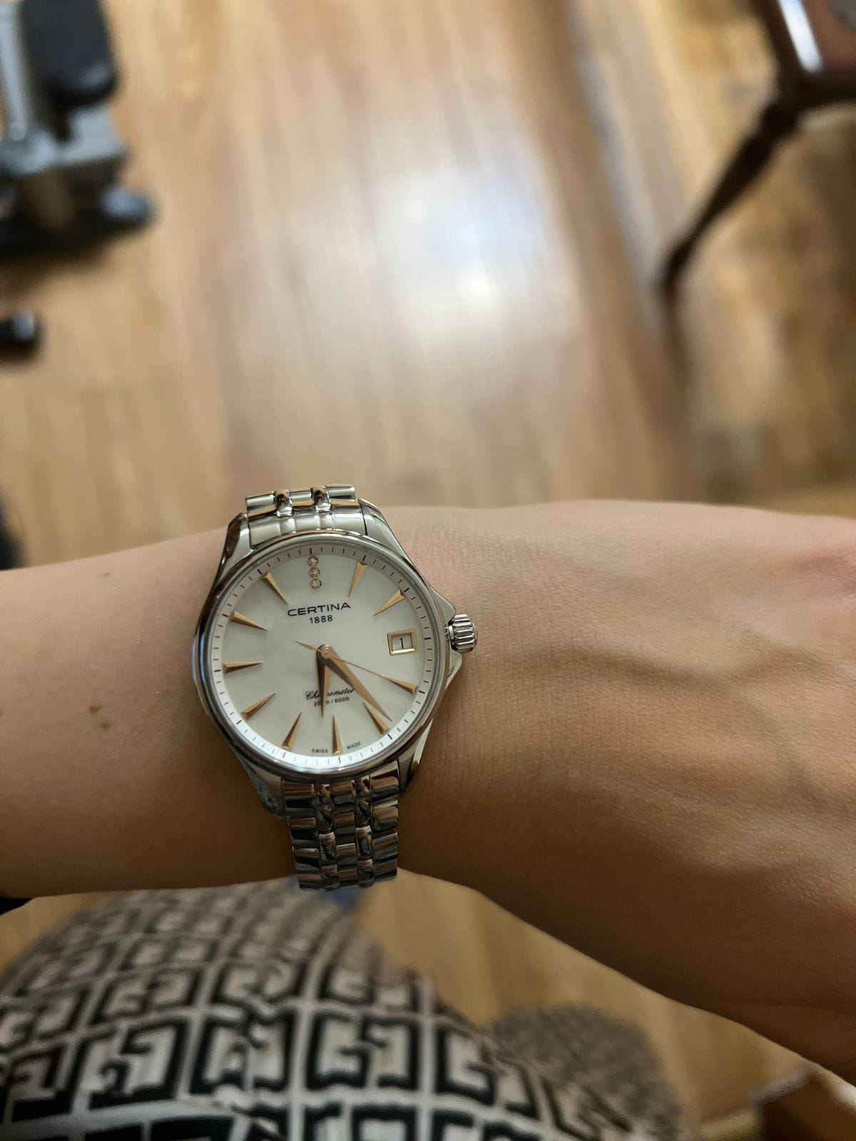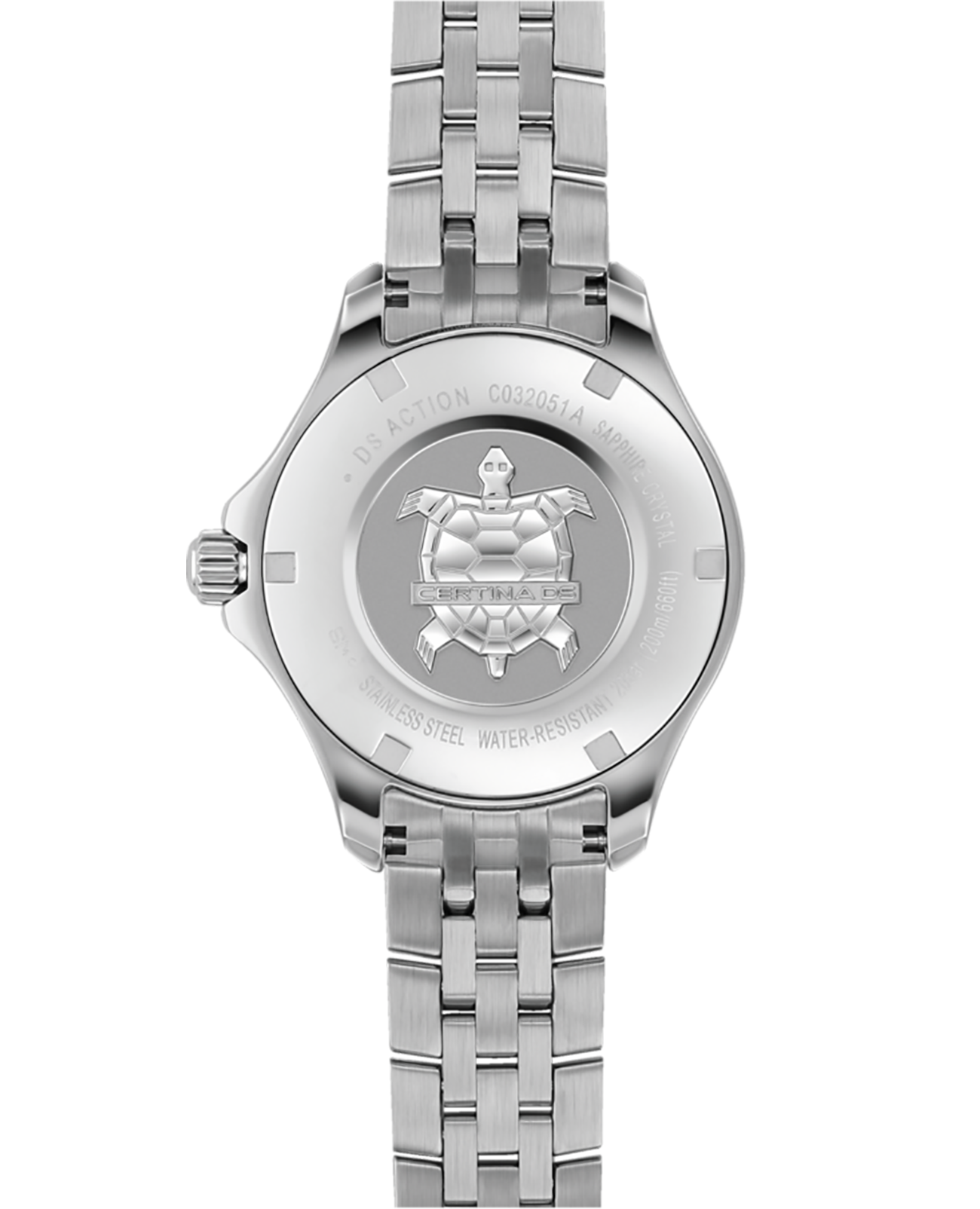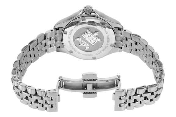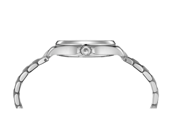 Модель привлекает романтическими элементами оформления. Перламутровый циферблат дополнен контрастными метками, что гарантирует идеальную читаемость показателей даже при беглом взгляде. Вместо метки 12 часов – 3 роскошных бриллианта оттенка Top Wesselton. Часы работают за счёт швейцарского кварцевого механизма ETA F06.411 Precidrive™Precidrive™Инновационный кварцевый механизм Certina. Часы, оснащённые этим швейцарским калибром, приравниваются к точности к сертифицированным хронометрам, точность хода составляет +/-10 секунд в год.. Его точность хода +/-10 секунд в год отмечена сертификатом хронометра COSCСертификат COSCОфициальный сертификат, подтверждающий то, что часы ходят с особо высокой точностью. Для получения документа часы подвергаются тестовым испытаниям, разработанным швейцарским институтом тестирования хронометров COSC. Допустимая норма для механических часов -4/+6 секунд в день, для кварцевых моделей +/- 0,07 секунд в день.. Концепция DS ConceptDS ConceptDouble Security Concept, обозначает двойную надёжность и безупречную точность часов Certina. Двойная система защиты подразумевает обеспечение максимальной устойчивости к ударам и высоких показателей водонепроницаемости. гарантирует повышенную ударопрочность часов. Сохраняется водостойкость при давлении 20 бар. Браслет дополнен . В правой части – апертура даты. Диаметр корпуса: 33,8 мм.