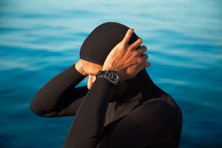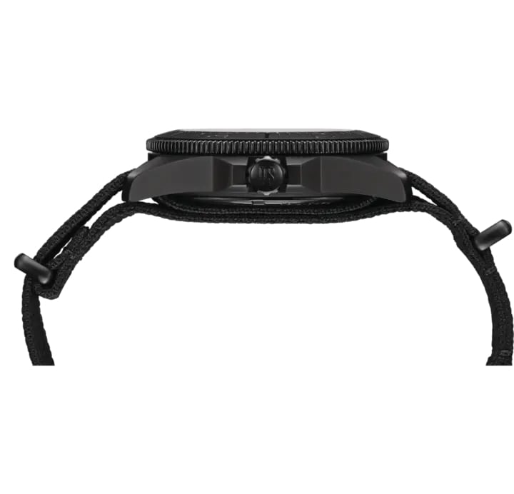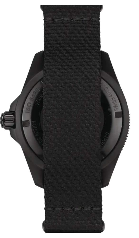 Корпус часов выполнен из нержавеющей стали, а безельБезельВнешний ободок, закрепляющий стекло. В спортивных часах так называется поворотное кольцо с делениями на циферблате, выполняет роль таймера – замеряет отрезки времени на шкале. Неподвижный безель – элемент декора. Однонаправленно вращающийся безель на дайверских часах позволяет фиксировать моменты погружения и выныривания на поверхность. изготовлен из стали с IP-покрытиемIP-покрытиеМетод ионного напыления. Демонстрирует повышенную устойчивость к истиранию, окислению и химическим веществам. Под воздействием высокого давления и температуры около 1500°C молекулы металла надёжно соединяются с частицами корпуса часов. и сапфировым стеклом. Стрелки и метки с люминесцентным покрытиемЛюминесцентное покрытиеПозволяет считывать показания времени в темноте. Производители наносят на стрелки, часовые индексы, безель или поверхность циферблата светонакопительный состав, дающий холодное свечение. придают часам особую привлекательность и читаемость в условиях низкой освещённости. Окошко даты находится в положении 3 часа.