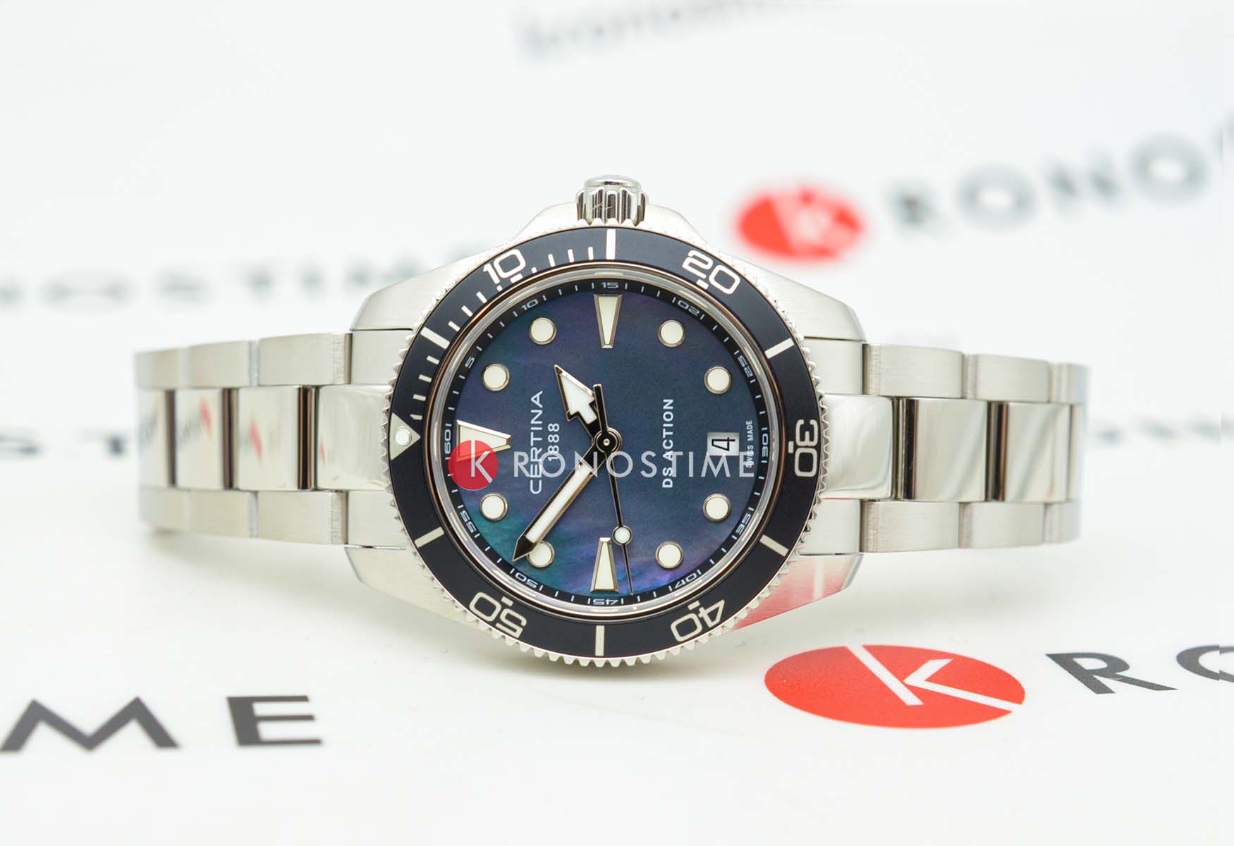 Certina DS Action Lady C048.210.11.121.00 – элегантные женские часы, сочетающие изысканный стиль и высокую функциональность. Корпус диаметром 34,5 мм выполнен из нержавеющей стали 316L и БезельБезельВнешний ободок, закрепляющий стекло. В спортивных часах так называется поворотное кольцо с делениями на циферблате, выполняет роль таймера – замеряет отрезки времени на шкале. Неподвижный безель – элемент декора. Однонаправленно вращающийся безель на дайверских часах позволяет фиксировать моменты погружения и выныривания на поверхность. с PVD-покрытиемPVDУльтратонкое покрытие наносится в технике вакуумного напыления, сочетает в себе нитрид титана особой прочности со слоем золота или оксида хрома. Несёт в себе декоративную или защитную функцию., обеспечивающей прочность и долговечность. Перламутровый циферблат украшен метками с люминесцентным покрытиемЛюминесцентное покрытиеПозволяет считывать показания времени в темноте. Производители наносят на стрелки, часовые индексы, безель или поверхность циферблата светонакопительный состав, дающий холодное свечение., обеспечивающим отличную читаемость в любых условиях, и защищён сапфировым стекломСапфировое стеклоПрочный и надёжный материал из кристалла сапфира синтетического происхождения, характеризующийся особой твёрдостью и устойчивостью к царапинам и повреждениям. с антибликовым покрытиемАнтибликовое покрытиеСлой оксида металла в 0,13-0,3 микрон, благодаря которому стекло часов не бликует и не отражает свет. Антибликовое покрытие уменьшает отражение света в 10 раз, обеспечивая отличную читаемость показателей циферблата., устойчивым к царапинам. Часы оснащены швейцарским кварцевым механизмом ETA F05.412 с технологией Precidrive™Precidrive™Инновационный кварцевый механизм Certina. Часы, оснащённые этим швейцарским калибром, приравниваются к точности к сертифицированным хронометрам, точность хода составляет +/-10 секунд в год., обеспечивающей высокую точность хода. Функция EOLEOLПредставляет собой систему, уведомляющую владельца часов о необходимости замены элемента питания. За 2 недели до полного разряда батарейки секундная стрелка перестаёт ходить чётко и начинает перепрыгивать на 3-4 деления. (индикатор окончания заряда батареи) своевременно предупреждает о необходимости замены элемента питания. Браслет из нержавеющей стали 316L оснащён системой быстрой замены, позволяющей легко менять ремешки без использования инструментов. Водонепроницаемость до 300 метров (30 бар) делает эту модель идеальным выбором для плавания и дайвинга.
