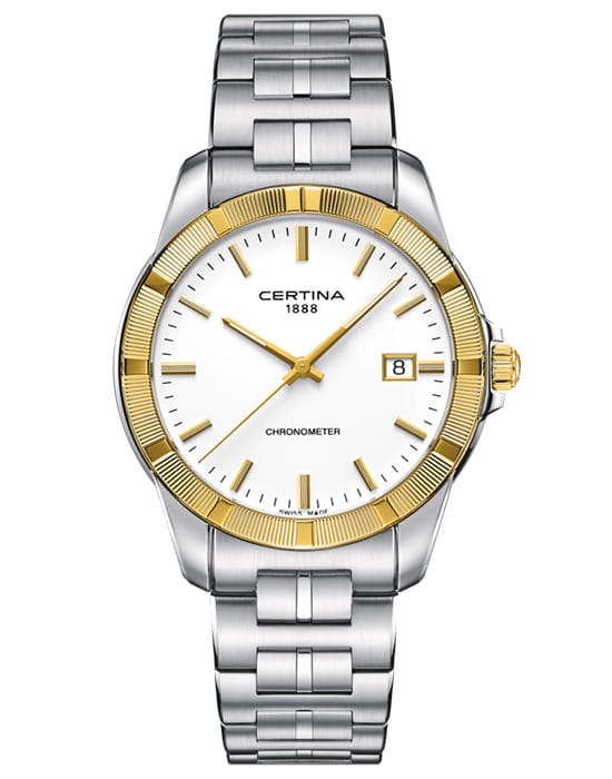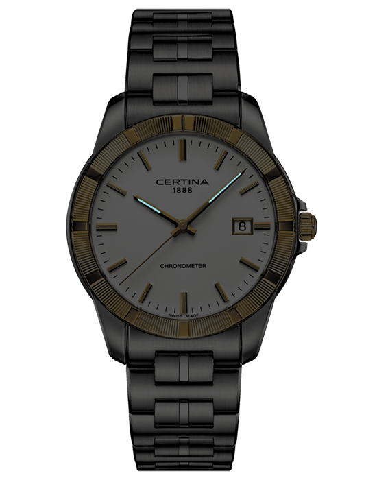 . Швейцарский кварцевый механизм ETA E64.111 Precidrive™Precidrive™Инновационный кварцевый механизм Certina. Часы, оснащённые этим швейцарским калибром, приравниваются к точности к сертифицированным хронометрам, точность хода составляет +/-10 секунд в год. измеряет время с максимальной точностью хода. Благодаря этому часы имеют статус хронометра и наделены сертификатом COSCСертификат COSCОфициальный сертификат, подтверждающий то, что часы ходят с особо высокой точностью. Для получения документа часы подвергаются тестовым испытаниям, разработанным швейцарским институтом тестирования хронометров COSC. Допустимая норма для механических часов -4/+6 секунд в день, для кварцевых моделей +/- 0,07 секунд в день.. Сапфировое стекло имеет одностороннее антибликовое покрытиеАнтибликовое покрытиеСлой оксида металла в 0,13-0,3 микрон, благодаря которому стекло часов не бликует и не отражает свет. Антибликовое покрытие уменьшает отражение света в 10 раз, обеспечивая отличную читаемость показателей циферблата.. Функции: календарь, индикатор EOLEOLПредставляет собой систему, уведомляющую владельца часов о необходимости замены элемента питания. За 2 недели до полного разряда батарейки секундная стрелка перестаёт ходить чётко и начинает перепрыгивать на 3-4 деления..