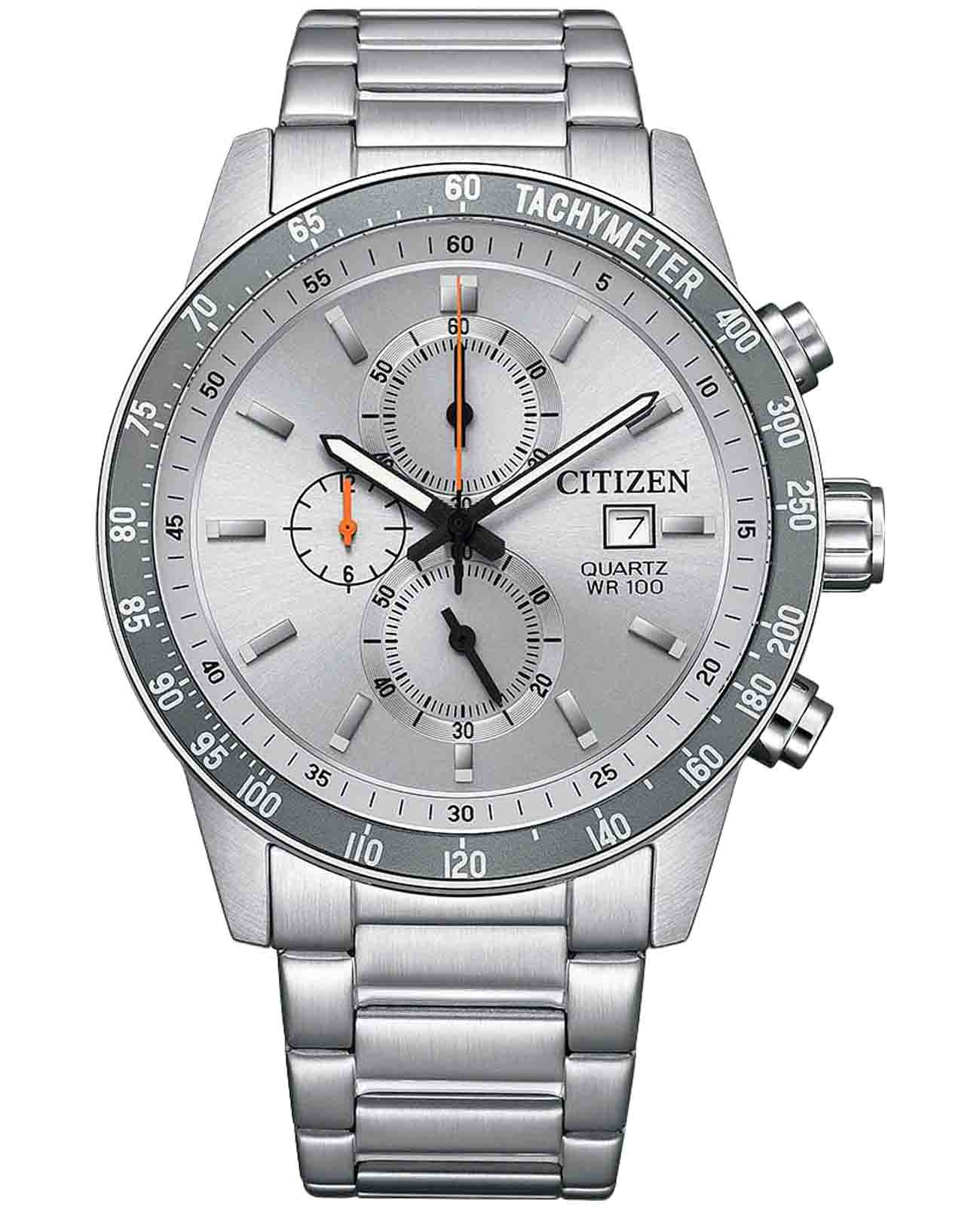 Citizen Chronograph AN3688-58H часы-хронографХронографФункция позволяет измерять отрезки времени с особой точностью: часы, минуты, секунды. Верным признаком хронографа является наличие на циферблате 3 дополнительных окошек-счётчиков. с секундомеромСекундомерСекундоме́р — прибор, способный измерять интервалы времени с точностью до долей секунды. спортивного дизайна с высоким уровнем водозащиты. Корпус из нержавеющей стали диаметром 44 мм идеально сбалансирован. Минеральное стеклоМинеральное стеклоМинеральное стекло представляет собой искусственно выращенный минерал кварца. Такое стекло отличается особой устойчивостью к повреждениям и царапинам. Уступает по некоторым качествам сапфировому стеклу. обеспечивает отличную защиту циферблата от царапин. Часы работают на основе кварцевого механизма. Стальной браслет на раскладной застёжкеРаскладная застёжкаТакой тип застёжки используется только на браслетах из металла. Она никогда не раскрывается полностью, происходит разделение на 2 и более частей. Раскладывающая застёжка снизит вероятность потери часов к минимуму. идеально дополняют дизайн часов, обеспечивая комфортное ношение. Стрелки на циферблате имеют люминесцентное покрытиеЛюминесцентное покрытиеПозволяет считывать показания времени в темноте. Производители наносят на стрелки, часовые индексы, безель или поверхность циферблата светонакопительный состав, дающий холодное свечение. позволяющее легко определять время даже в темноте. БезельБезельВнешний ободок, закрепляющий стекло. В спортивных часах так называется поворотное кольцо с делениями на циферблате, выполняет роль таймера – замеряет отрезки времени на шкале. Неподвижный безель – элемент декора. Однонаправленно вращающийся безель на дайверских часах позволяет фиксировать моменты погружения и выныривания на поверхность. с IP-покрытиемIP-покрытиеМетод ионного напыления. Демонстрирует повышенную устойчивость к истиранию, окислению и химическим веществам. Под воздействием высокого давления и температуры около 1500°C молекулы металла надёжно соединяются с частицами корпуса часов. и шкалой тахиметраТахиметрРазмеченная шкала, располагается на ободке или безеле часов. Тахиметр позволяет рассчитать скорость на определённом участке пути, расстояние измеряется в километрах или милях.. Секундомер с точностью 1с и временем измерения 12ч отображается центральной стрелкой. Циферблат с метками в виде штрихов выполнен по технологии Sunray (солнечные лучи). Окошко даты находится в положении 3 часа. Часы обладают впечатляющей водонепроницаемостью до 100WR, что делает их идеальными для повседневной носки.