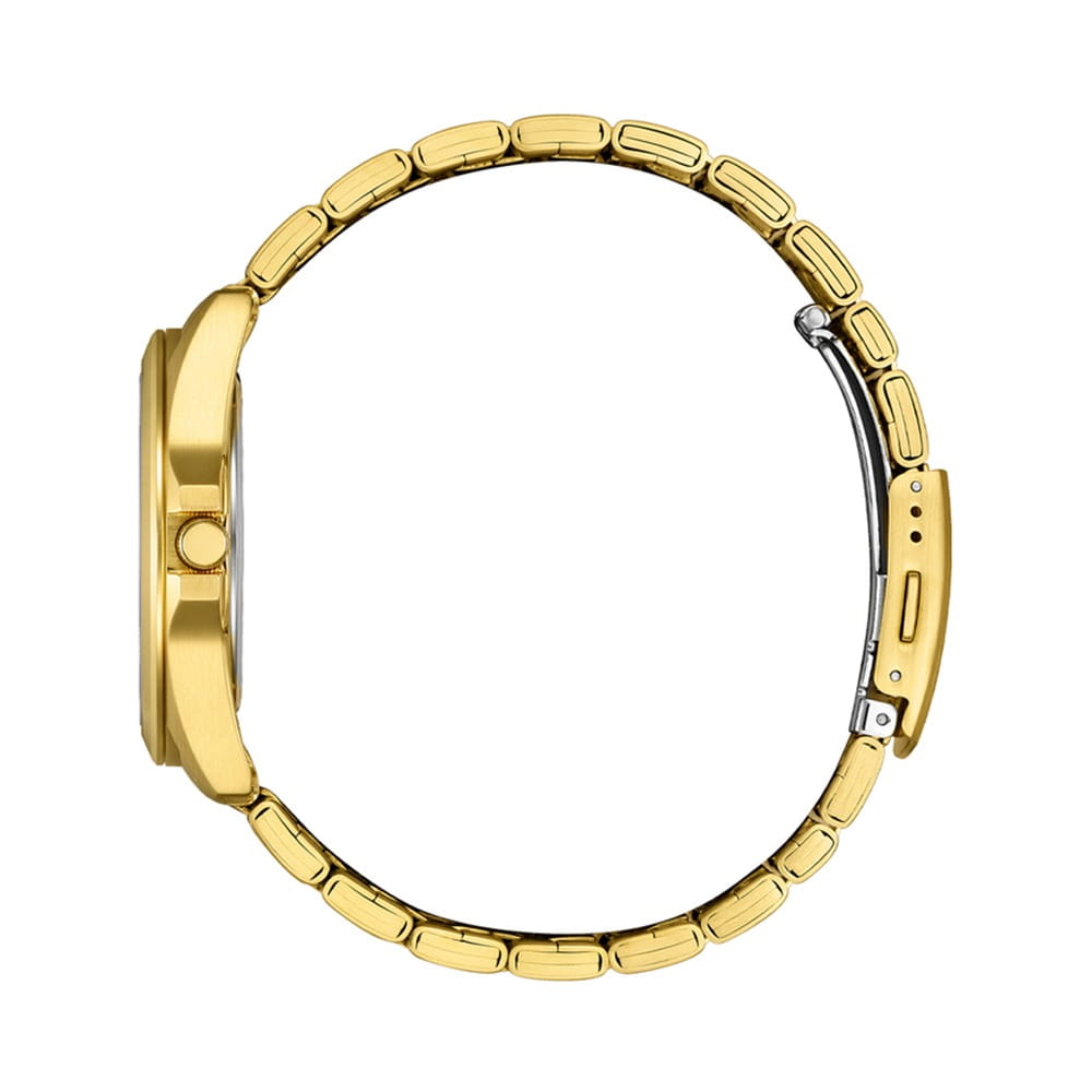 Citizen BF0583-59P — это классические японские часы с кварцевым механизмом, отличающиеся надежностью и стильным внешним видом. Корпус круглой формы выполнен из нержавеющей стали с элегантным золотистым IP-покрытиемIP-покрытиеМетод ионного напыления. Демонстрирует повышенную устойчивость к истиранию, окислению и химическим веществам. Под воздействием высокого давления и температуры около 1500°C молекулы металла надёжно соединяются с частицами корпуса часов. покрытием, диаметр корпуса составляет 39,4 мм, а толщина — 8 мм, что обеспечивает комфортное ношение на запястье. Золотистый циферблат украшен аккуратными индексами и оснащен окошком даты, расположенным в районе трех часов, что делает модель удобной для повседневного использования. Часы оснащены центральными стрелками для отображения часов, минут и секунд. Минеральное стеклоМинеральное стеклоМинеральное стекло представляет собой искусственно выращенный минерал кварца. Такое стекло отличается особой устойчивостью к повреждениям и царапинам. Уступает по некоторым качествам сапфировому стеклу. защищает циферблат от случайных царапин и повреждений, а водозащита уровня WR50 предохраняет механизм от воздействия брызг и дождя. Стрелки с люминесцентным покрытиемЛюминесцентное покрытиеПозволяет считывать показания времени в темноте. Производители наносят на стрелки, часовые индексы, безель или поверхность циферблата светонакопительный состав, дающий холодное свечение. обеспечивают отличную видимость в темноте. Стальной браслет с золотистым IP-покрытиемIP-покрытиеМетод ионного напыления. Демонстрирует повышенную устойчивость к истиранию, окислению и химическим веществам. Под воздействием высокого давления и температуры около 1500°C молекулы металла надёжно соединяются с частицами корпуса часов. и раскладной застёжкойРаскладная застёжкаТакой тип застёжки используется только на браслетах из металла. Она никогда не раскрывается полностью, происходит разделение на 2 и более частей. Раскладывающая застёжка снизит вероятность потери часов к минимуму. на кнопке надежно фиксирует часы на руке и подчеркивает их современный стиль.