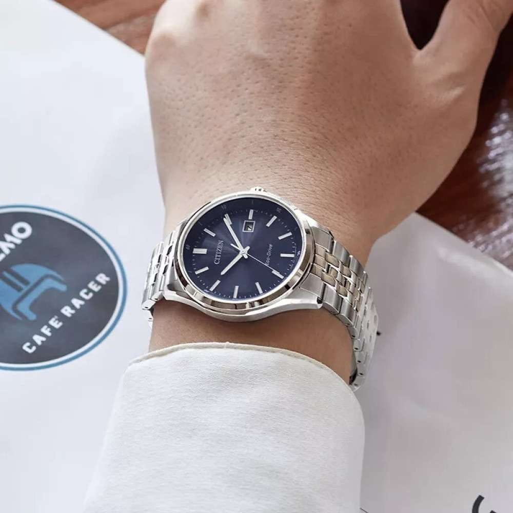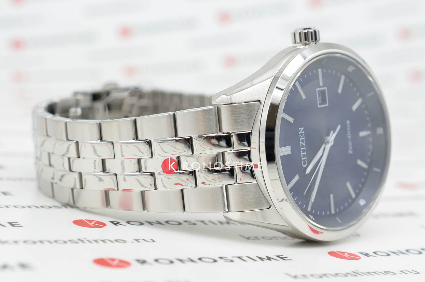 Citizen BM7560-59L — элегантные японские часы с современным дизайном, созданные для ценителей надежности и практичности. Эта модель оснащена высокоточным кварцевым механизмом и инновационной системой Eco-Drive, которая обеспечивает питание от солнечной энергии и избавляет от необходимости замены батарейки, а запас хода достигает 180 дней. Корпус и браслет выполнены из нержавеющей стали, что гарантирует прочность и долговечность изделия. Сапфировое стеклоСапфировое стеклоПрочный и надёжный материал из кристалла сапфира синтетического происхождения, характеризующийся особой твёрдостью и устойчивостью к царапинам и повреждениям. устойчиво к появлению царапин и мелких повреждений, надежно защищая синий циферблат с лаконичными часовыми индексами в виде штрихов. Центральные стрелки показывают часы, минуты и секунды, а функция индикации даты делает использование часов ещё более удобным. Стрелки с люминесцентным покрытиемЛюминесцентное покрытиеПозволяет считывать показания времени в темноте. Производители наносят на стрелки, часовые индексы, безель или поверхность циферблата светонакопительный состав, дающий холодное свечение. удобно подсвечиваются в темноте после зарядки на свету. Браслет из нержавеющей стали оснащен раскладной застёжкойРаскладная застёжкаТакой тип застёжки используется только на браслетах из металла. Она никогда не раскрывается полностью, происходит разделение на 2 и более частей. Раскладывающая застёжка снизит вероятность потери часов к минимуму., обеспечивая надежную фиксацию на руке. Водозащита уровня WR 100 позволяет не снимать часы во время плавания без погружения. Диаметр корпуса составляет 41 мм, толщина — 10 мм, благодаря чему модель отлично смотрится на запястье и подходит для повседневного ношения.