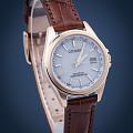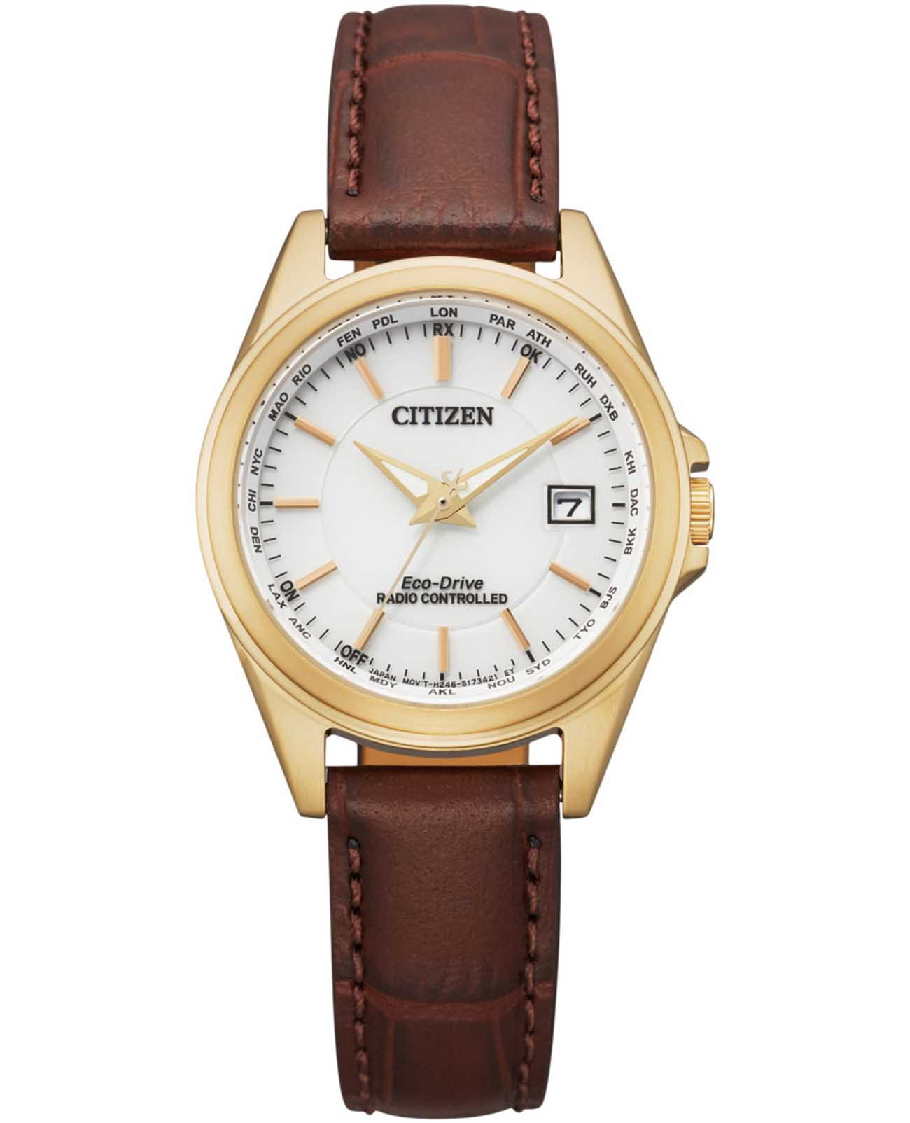 Citizen EC1183-16A — стильные и функциональные часы для современных леди, созданные в Японии. Модель оснащена точным кварцевым механизмом с калибром Citizen H246 и инновационной системой Eco-Drive, которая обеспечивает питание от солнечной энергии и избавляет от необходимости замены батарейки, а запас хода составляет до 180 дней. Для дополнительного удобства предусмотрены функции индикации заряда EOLEOLПредставляет собой систему, уведомляющую владельца часов о необходимости замены элемента питания. За 2 недели до полного разряда батарейки секундная стрелка перестаёт ходить чётко и начинает перепрыгивать на 3-4 деления., сохранения энергии и предотвращения перезарядки, а при включенной функции сохранения энергии часы способны работать до трёх лет. Корпус выполнен из высококачественной нержавеющей стали с золотистым IP-покрытиемIP-покрытиеМетод ионного напыления. Демонстрирует повышенную устойчивость к истиранию, окислению и химическим веществам. Под воздействием высокого давления и температуры около 1500°C молекулы металла надёжно соединяются с частицами корпуса часов., а белый циферблат украшен метками в виде штрихов и защищён сапфировым стекломСапфировое стеклоПрочный и надёжный материал из кристалла сапфира синтетического происхождения, характеризующийся особой твёрдостью и устойчивостью к царапинам и повреждениям. с высокой устойчивостью к царапинам. Стрелки с люминесцентным покрытиемЛюминесцентное покрытиеПозволяет считывать показания времени в темноте. Производители наносят на стрелки, часовые индексы, безель или поверхность циферблата светонакопительный состав, дающий холодное свечение. обеспечивают отличную читаемость времени даже в темное время суток. Окошко даты удобно расположено на отметке 3 часа, а вечный календарьВечный календарьКлассическое часовое усложнение, представляющее собой календарь, рассчитанный на несколько лет вперёд (стандартно – до 2099 года). Определяет текущую дату, день недели, месяц. всегда показывает актуальное число. Часы автоматически принимают сигналы от радиовышек по всему миру и корректируют время с высокой точностью — поддерживается синхронизация в Европе, США, Японии и Китае, а также мировое время для 24 городов и автоматический переход на зимнее и летнее время. Диаметр корпуса составляет 29,3 мм, толщина — 8,4 мм, вес — всего 67 грамм, что делает модель особенно комфортной для повседневного ношения. Заводная головка снабжена защитой, а коричневый кожаный ремешок оборудован удобной классической застежкой. Надёжная водозащита 100WR позволяет использовать часы даже при плавании.