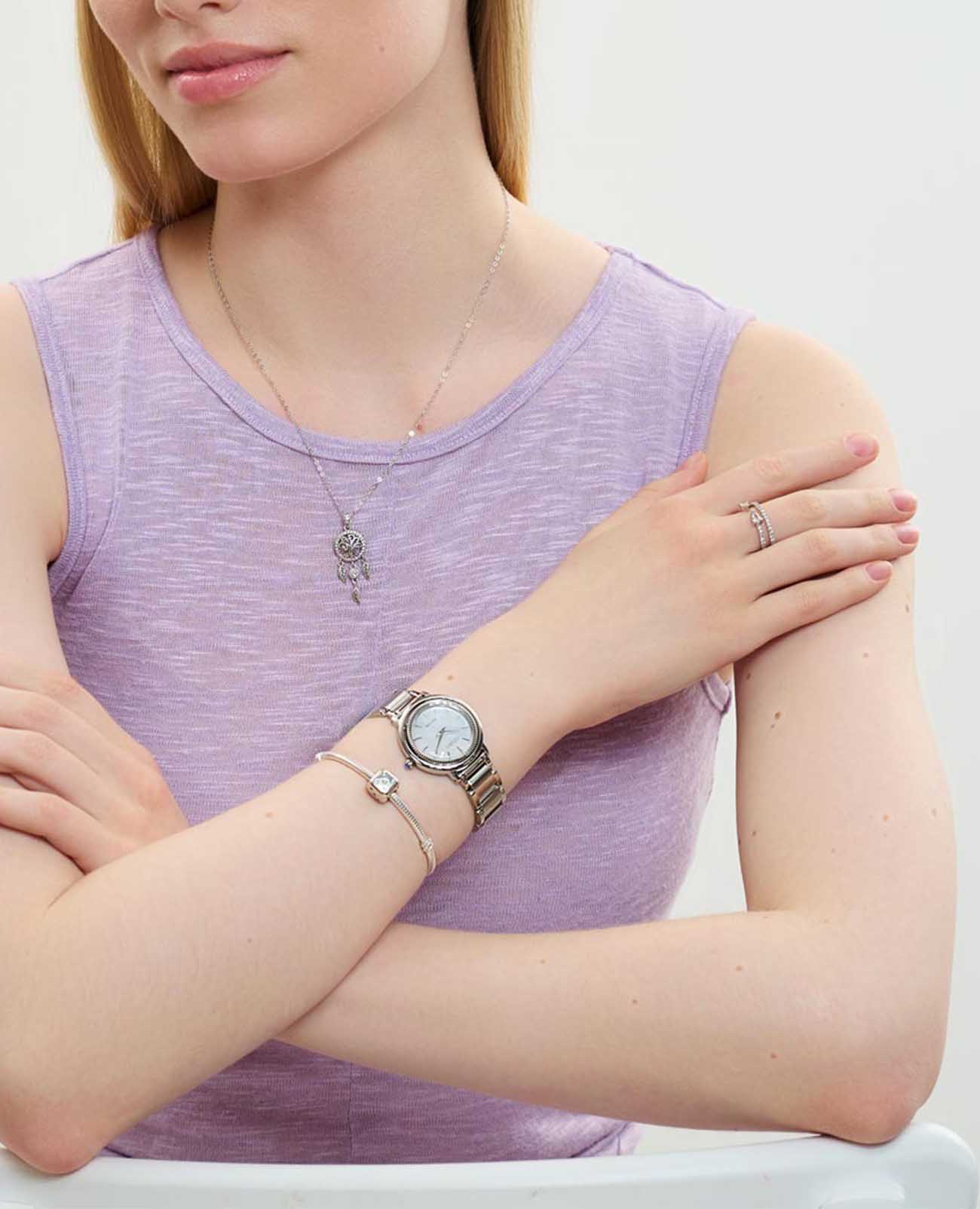 Элегантные часы Citizen EM1100-84D произведены в Японии и оснащены современным кварцевым механизмом Citizen E031 с инновационной системой Eco-Drive, которая использует энергию солнечного света и не требует замены батарейки, обеспечивая до 180 дней работы в автономном режиме. Корпус и браслет выполнены из высококачественной нержавеющей стали, что гарантирует долговечность и износостойкость. Перламутровый голубой циферблат с изящными штриховыми метками защищён выпуклым сапфировым стекломСапфировое стеклоПрочный и надёжный материал из кристалла сапфира синтетического происхождения, характеризующийся особой твёрдостью и устойчивостью к царапинам и повреждениям., устойчивым к царапинам. БезельБезельВнешний ободок, закрепляющий стекло. В спортивных часах так называется поворотное кольцо с делениями на циферблате, выполняет роль таймера – замеряет отрезки времени на шкале. Неподвижный безель – элемент декора. Однонаправленно вращающийся безель на дайверских часах позволяет фиксировать моменты погружения и выныривания на поверхность. часов декорирован алмазной гранью, а заводная головка украшена камнем в форме кабошона, что придаёт модели особый шарм. Задняя крышка закреплена на четырёх винтах, что повышает надёжность конструкции. Часы имеют водозащиту до 50 метров, а также функцию индикации заряда и предотвращения перезарядки. Размер корпуса составляет 31,2 мм в диаметре и 8 мм в толщину, вес — 71 грамм. Застежка «бабочка»Застёжка "бабочка"Такой вид застёжки дополняется предохранителями, помогающими избежать случайного раскрытия браслета. Обладают изящным исполнением. у браслета обеспечивает комфортное и надёжное ношение. Эта модель идеально подчеркнёт изысканный стиль и индивидуальность своей обладательницы.
