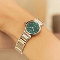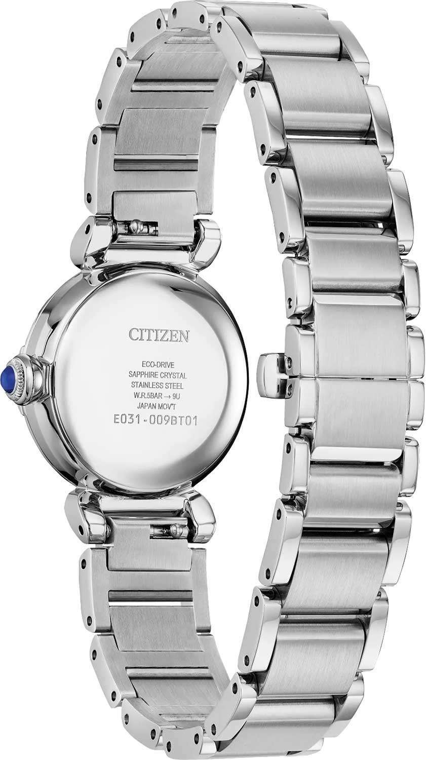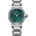 Элегантные японские часы Citizen EM1130-83X сочетают в себе современные технологии и изысканный дизайн. Кварцевый механизм Eco-Drive Caliber E031 обеспечивает высокую точность и не требует замены батареек, получая энергию от любого источника света. Корпус диаметром 26 мм и толщиной 8,1 мм выполнен из прочной нержавеющей стали, вес модели составляет 70 гр. Сапфировое стеклоСапфировое стеклоПрочный и надёжный материал из кристалла сапфира синтетического происхождения, характеризующийся особой твёрдостью и устойчивостью к царапинам и повреждениям. отличается высокой устойчивостью к царапинам и мелким повреждениям. Зеленый циферблат украшен арабскими цифрами и аккуратными метками в виде точек. Центральные часовая, минутная и секундная стрелки обеспечивают удобное считывание времени. Стальной браслет оснащён надёжной застежкой «бабочка»Застёжка "бабочка"Такой вид застёжки дополняется предохранителями, помогающими избежать случайного раскрытия браслета. Обладают изящным исполнением. . Водонепроницаемость на уровне WR 50 позволяет не снимать часы во время мытья рук или прогулок под дождём.