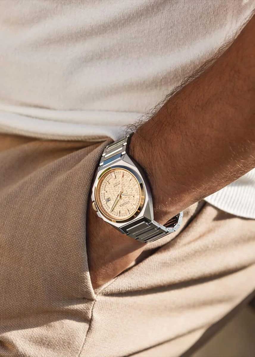 Citizen SERIES 8 NB6059-57P мужские механические часы с автоподзаводом. Корпус из нержавеющей стали диаметром 40,1 мм идеально сбалансирован. Сапфировое стеклоСапфировое стеклоПрочный и надёжный материал из кристалла сапфира синтетического происхождения, характеризующийся особой твёрдостью и устойчивостью к царапинам и повреждениям. с антибликовым покрытиемАнтибликовое покрытиеСлой оксида металла в 0,13-0,3 микрон, благодаря которому стекло часов не бликует и не отражает свет. Антибликовое покрытие уменьшает отражение света в 10 раз, обеспечивая отличную читаемость показателей циферблата. обеспечивает отличную защиту циферблата от царапин. Стальной браслет на раскладной застёжкеРаскладная застёжкаТакой тип застёжки используется только на браслетах из металла. Она никогда не раскрывается полностью, происходит разделение на 2 и более частей. Раскладывающая застёжка снизит вероятность потери часов к минимуму. идеально дополняют дизайн часов, обеспечивая комфортное ношение. Стрелки и метки на циферблате имеют люминесцентное покрытиеЛюминесцентное покрытиеПозволяет считывать показания времени в темноте. Производители наносят на стрелки, часовые индексы, безель или поверхность циферблата светонакопительный состав, дающий холодное свечение. позволяющее легко определять время даже в темноте. Окошко даты находится в положении 3 часа. Магнитоустойчивость 16000 а/м. Запас хода около 42 часов. Неподвижный безельБезельВнешний ободок, закрепляющий стекло. В спортивных часах так называется поворотное кольцо с делениями на циферблате, выполняет роль таймера – замеряет отрезки времени на шкале. Неподвижный безель – элемент декора. Однонаправленно вращающийся безель на дайверских часах позволяет фиксировать моменты погружения и выныривания на поверхность. с IP-покрытиемIP-покрытиеМетод ионного напыления. Демонстрирует повышенную устойчивость к истиранию, окислению и химическим веществам. Под воздействием высокого давления и температуры около 1500°C молекулы металла надёжно соединяются с частицами корпуса часов. золотистого цвета. Геометрически текстурированный циферблат. Часы обладают впечатляющей водонепроницаемостью до 100WR, что делает их идеальными для повседневной носки. Прозрачная задняя крышка.