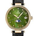 Женские часы Cover Moon CO196.06 - это аксессуар для истинных леди из коллекции Fly Me To The Moon. Часы работают на кварцевом калибре ETA. Циферблат выполнен в зеленом перламутровом исполнении, создавая игру света при каждом движении запястья, и украшен 11 кристаллами Swarovski, которые служат часовым индикатором, добавляя блики света и роскоши. Кроме того, модель имеет окно фаз Луны на «6 часах» и апертуру даты на «3 часах», что делает ее функциональной для ценителей астрономических усложнений. Часы имеют 32-миллиметровый корпус из нержавеющей стали с PVD-покрытиемPVDУльтратонкое покрытие наносится в технике вакуумного напыления, сочетает в себе нитрид титана особой прочности со слоем золота или оксида хрома. Несёт в себе декоративную или защитную функцию. цвета желтого золота. Водонепроницаемость часов достигает 5 атмосфер (WR 50), что позволяет использовать их в повседневной жизни, однако не рекомендуется для контакта с водой во время плавания или дайвинга. Маркировка «Swiss Made». Кожаный ремешок на классической застежке.