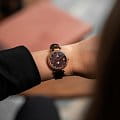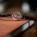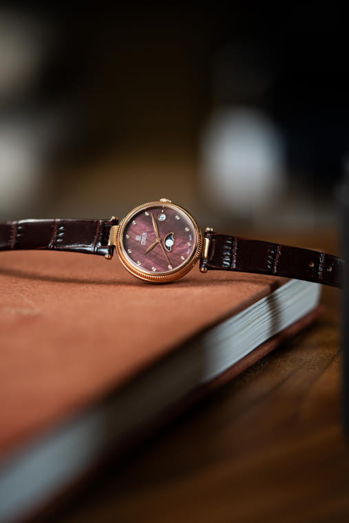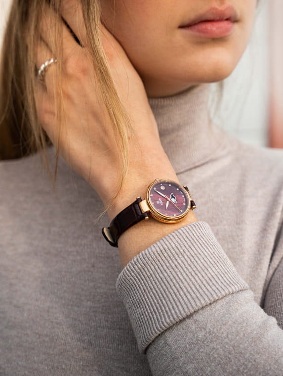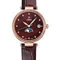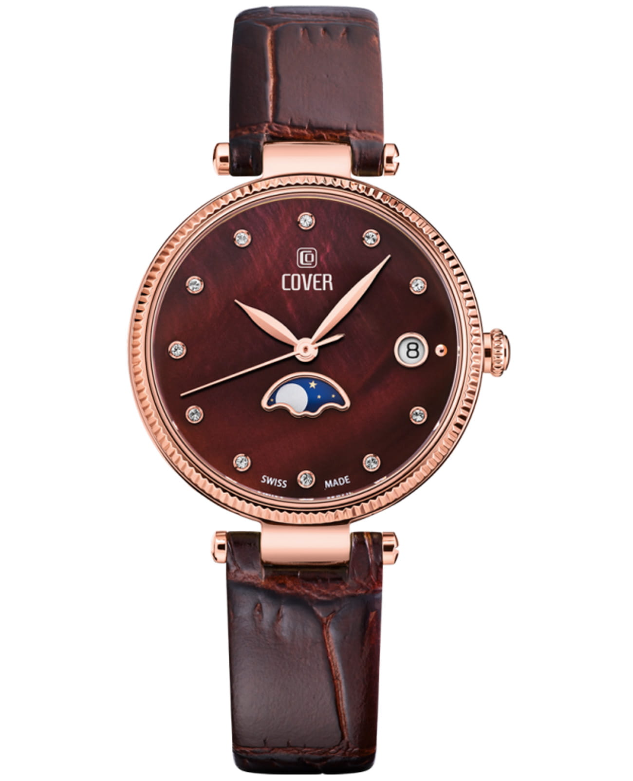 Женские часы Cover Moon CO196.07  - это аксессуар для истинных леди из коллекции Fly Me To The Moon. Часы работают на кварцевом калибре ETA. Циферблат выполнен в коричневом перламутровом исполнении, создавая игру света при каждом движении запястья, и украшен 11 кристаллами Swarovski, которые служат часовым индикатором, добавляя блики света и роскоши. Кроме того, модель имеет окно фаз Луны на «6 часах» и апертуру даты на «3 часах», что делает ее функциональной для ценителей астрономических усложнений. Часы имеют 32-миллиметровый корпус из нержавеющей стали с PVD-покрытиемPVDУльтратонкое покрытие наносится в технике вакуумного напыления, сочетает в себе нитрид титана особой прочности со слоем золота или оксида хрома. Несёт в себе декоративную или защитную функцию. цвета розового золота.  Водонепроницаемость часов достигает 5 атмосфер (WR 50), что позволяет использовать их в повседневной жизни, однако не рекомендуется для контакта с водой во время плавания или дайвинга. Маркировка «Swiss Made». Кожаный ремешок на классической застежке.