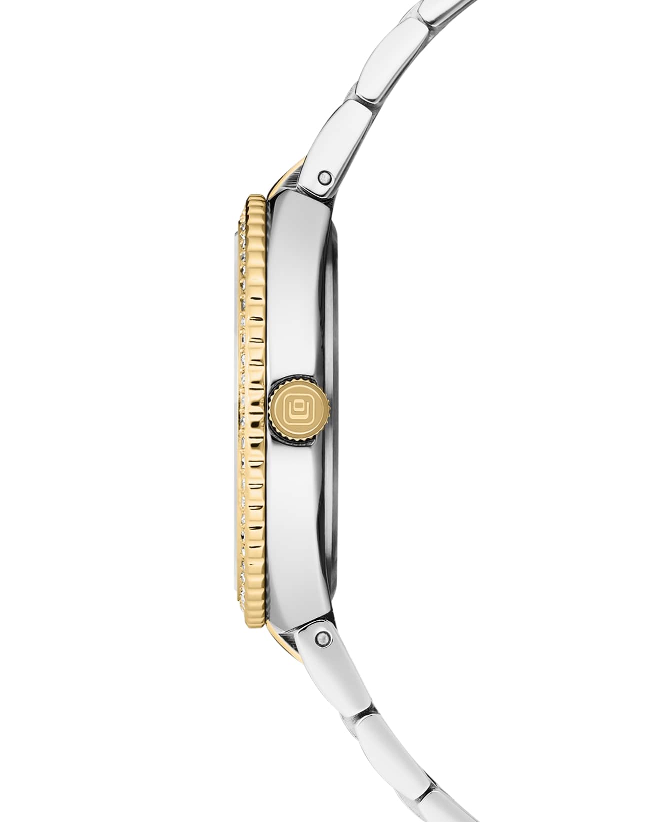 Cover Jumeira CO218.03 – элегантные женские часы, сочетающие современный дизайн и швейцарское качество. Корпус диаметром 36 мм выполнен из нержавеющей стали 316L, что придаёт модели роскошный вид и обеспечивает долговечность. БезельБезельВнешний ободок, закрепляющий стекло. В спортивных часах так называется поворотное кольцо с делениями на циферблате, выполняет роль таймера – замеряет отрезки времени на шкале. Неподвижный безель – элемент декора. Однонаправленно вращающийся безель на дайверских часах позволяет фиксировать моменты погружения и выныривания на поверхность. с PVD-покрытиемPVDУльтратонкое покрытие наносится в технике вакуумного напыления, сочетает в себе нитрид титана особой прочности со слоем золота или оксида хрома. Несёт в себе декоративную или защитную функцию. украшен кристаллами, добавляя изысканности и блеска, а поверхность циферблата защищена сапфировым стекломСапфировое стеклоПрочный и надёжный материал из кристалла сапфира синтетического происхождения, характеризующийся особой твёрдостью и устойчивостью к царапинам и повреждениям., устойчивым к царапинам. Часы оснащены швейцарским кварцевым механизмом, обеспечивающим точный ход и надёжность. Функциональность дополняется окошком даты, расположенным на позиции «3 часа». Браслет из нержавеющей стали с PVD-покрытиемPVDУльтратонкое покрытие наносится в технике вакуумного напыления, сочетает в себе нитрид титана особой прочности со слоем золота или оксида хрома. Несёт в себе декоративную или защитную функцию. оснащён раскладной застёжкойРаскладная застёжкаТакой тип застёжки используется только на браслетах из металла. Она никогда не раскрывается полностью, происходит разделение на 2 и более частей. Раскладывающая застёжка снизит вероятность потери часов к минимуму., обеспечивающей удобную и надёжную фиксацию на запястье. Водонепроницаемость 50 метров (5 ATM) позволяет использовать часы в повседневной жизни, защищая их от случайных брызг и дождя.