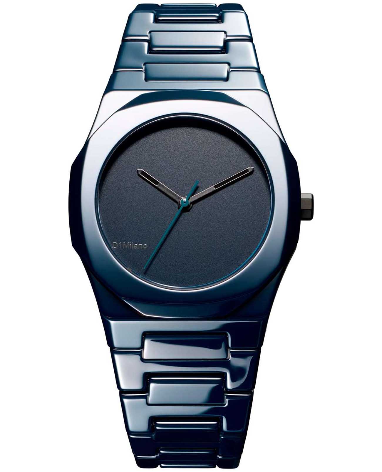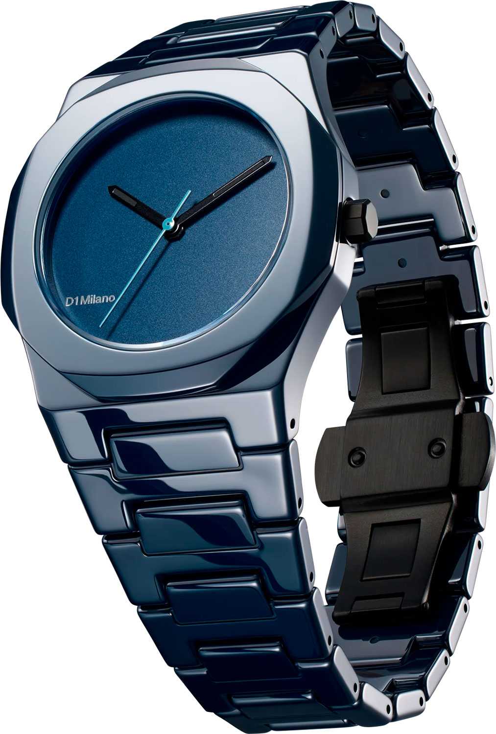 Часы D1 Milano Ceramic CEBU03 Pure Blue – роскошный аксессуар для современных женщин и мужчин. Кварцевые часы с корпусом из синей керамики. Циферблат лаконичный, без индексов, с надписью бренда. Стрелки из латуни с люминесцентным покрытиемЛюминесцентное покрытиеПозволяет считывать показания времени в темноте. Производители наносят на стрелки, часовые индексы, безель или поверхность циферблата светонакопительный состав, дающий холодное свечение.. Стальная задняя крышка с PVD-покрытиемPVDУльтратонкое покрытие наносится в технике вакуумного напыления, сочетает в себе нитрид титана особой прочности со слоем золота или оксида хрома. Несёт в себе декоративную или защитную функцию. закреплена на 4 винтах, что обеспечивает надежность конструкции. Керамический браслет с застёжкой «бабочка» с кнопкамиЗастёжка "бабочка"Такой вид застёжки дополняется предохранителями, помогающими избежать случайного раскрытия браслета. Обладают изящным исполнением. . Часы сочетают в себе классический дизайн и современные технологии производства.