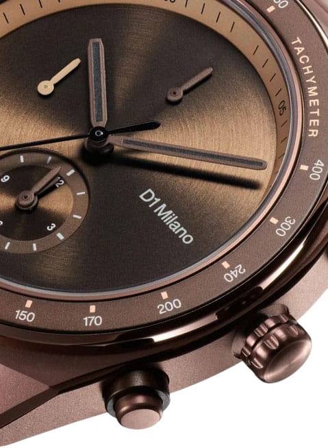 Элегантный хронограф D1 Milano Cronografo Essential Brown CHBJ22 - идеальное воплощение мужественности и стиля. Этот многофункциональный аксессуар оснащен секундомером, тахиметромТахиметрРазмеченная шкала, располагается на ободке или безеле часов. Тахиметр позволяет рассчитать скорость на определённом участке пути, расстояние измеряется в километрах или милях.. что делает его незаменимым компаньоном в повседневной жизни. Изысканный корпус и браслет выполнены из стали с PVD-покрытиемPVDУльтратонкое покрытие наносится в технике вакуумного напыления, сочетает в себе нитрид титана особой прочности со слоем золота или оксида хрома. Несёт в себе декоративную или защитную функцию.. Минималистичный дизайн циферблата, защищенный прочным сапфировым стекломСапфировое стеклоПрочный и надёжный материал из кристалла сапфира синтетического происхождения, характеризующийся особой твёрдостью и устойчивостью к царапинам и повреждениям. с антибликовым покрытиемАнтибликовое покрытиеСлой оксида металла в 0,13-0,3 микрон, благодаря которому стекло часов не бликует и не отражает свет. Антибликовое покрытие уменьшает отражение света в 10 раз, обеспечивая отличную читаемость показателей циферблата., привлекает внимание своей сдержанной красотой. Стрелки с люминесцентным покрытиемЛюминесцентное покрытиеПозволяет считывать показания времени в темноте. Производители наносят на стрелки, часовые индексы, безель или поверхность циферблата светонакопительный состав, дающий холодное свечение., обеспечивающим хорошую читаемость в темноте. Надежная конструкция с задней крышкой на 8 винтах и стильный браслет с удобной застёжкой «бабочка» с кнопкамиЗастёжка "бабочка"Такой вид застёжки дополняется предохранителями, помогающими избежать случайного раскрытия браслета. Обладают изящным исполнением. обеспечивают комфорт при ношении. Водозащита 50 метров защищает часы от брызг и дождя, делая их подходящими для повседневного использования. Это не просто часы, а статусный аксессуар, подчеркивающий безупречный вкус и внимание к деталям своего владельца.