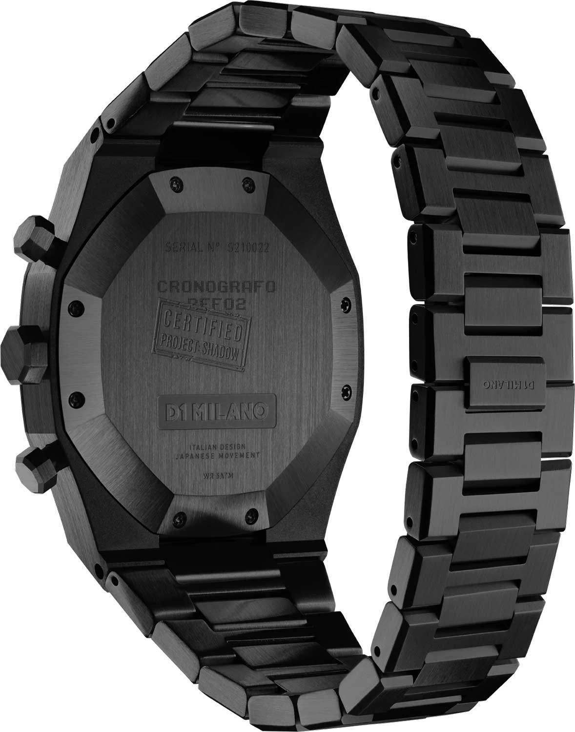 Элегантный хронограф D1 Milano Cronografo CHBJSH Shadow - идеальное воплощение мужественности и стиля. Этот многофункциональный аксессуар оснащен секундомером,тахиметромТахиметрРазмеченная шкала, располагается на ободке или безеле часов. Тахиметр позволяет рассчитать скорость на определённом участке пути, расстояние измеряется в километрах или милях. и двойным форматом времени, что делает его незаменимым компаньоном в повседневной жизни. Корпус и браслет выполнены из стали с PVD-покрытиемPVDУльтратонкое покрытие наносится в технике вакуумного напыления, сочетает в себе нитрид титана особой прочности со слоем золота или оксида хрома. Несёт в себе декоративную или защитную функцию.. Минималистичный дизайн циферблата с штриховыми метками, защищенный прочным сапфировым стекломСапфировое стеклоПрочный и надёжный материал из кристалла сапфира синтетического происхождения, характеризующийся особой твёрдостью и устойчивостью к царапинам и повреждениям., привлекает внимание своей сдержанной красотой. Надежная конструкция с задней крышкой на 8 винтах и стильный браслет с удобной застежкой обеспечивают комфорт при ношении. Каждый экземпляр уникален благодаря индивидуальному серийному номеру. Shadow- это не просто часы, а статусный аксессуар, подчеркивающий безупречный вкус и внимание к деталям своего владельца.