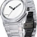 Часы D1 Milano Nylon NYBJ01 – модный и стильный аксессуар-унисекс лаконичного дизайна. Корпус выполнен из прозрачного нейлона. Белый матовый циферблат без индексов. Стрелки-скелетон из латуни. Задняя крышка из стали с черным PVD-покрытиемPVDУльтратонкое покрытие наносится в технике вакуумного напыления, сочетает в себе нитрид титана особой прочности со слоем золота или оксида хрома. Несёт в себе декоративную или защитную функцию. закреплена на 4 винтах. Ремешок из прозрачного нейлона имеет застёжку «бабочка» с кнопкамиЗастёжка "бабочка"Такой вид застёжки дополняется предохранителями, помогающими избежать случайного раскрытия браслета. Обладают изящным исполнением. .