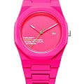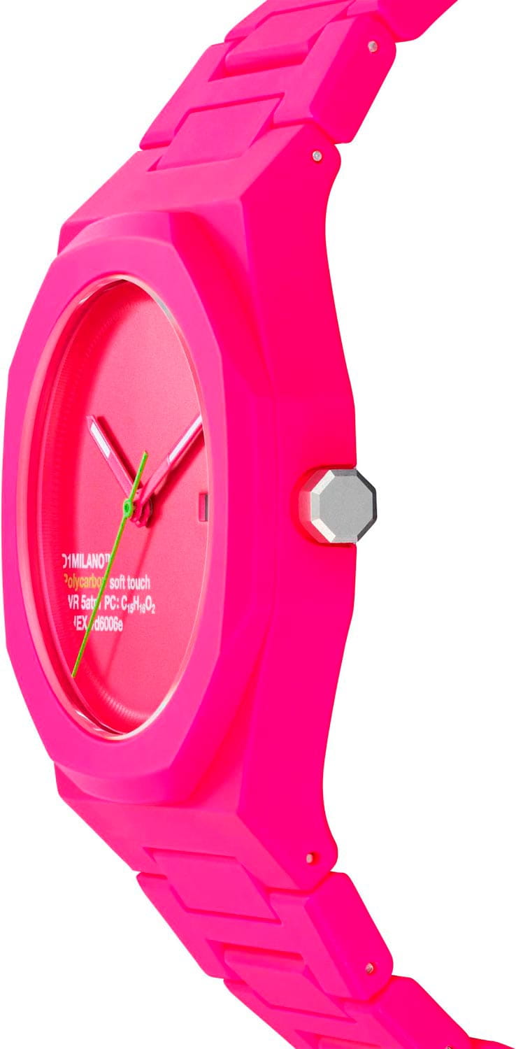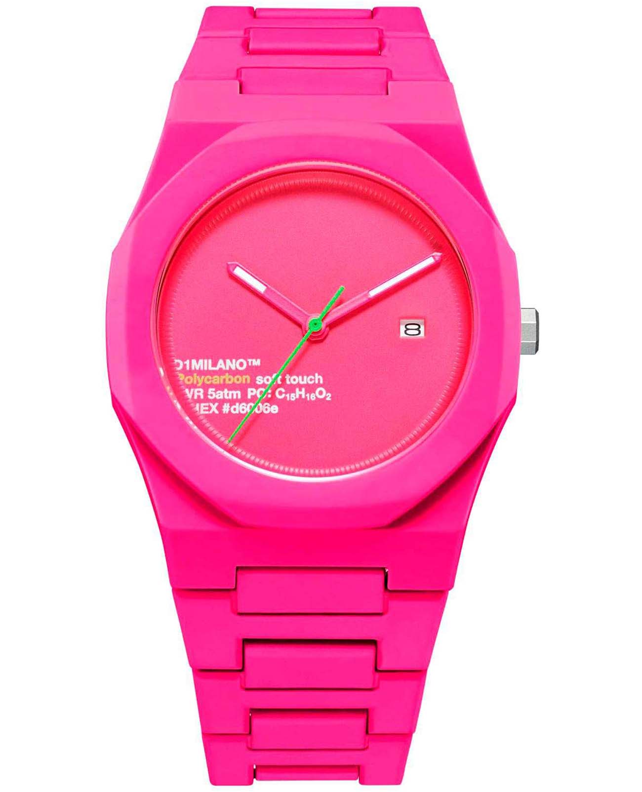 Часы D1 Milano Polycarbon PCBJ32 – молодежные часы в стиле унисекс для повседневных образов. Кварцевые часы с калибром Seiko VJ32B. Модель Hot Pink Polycarbon  имеет розовый корпус из поликарбоната с покрытием Софт-Тач. Циферблат лаконичный без индексов, защищен минеральным стекломМинеральное стеклоМинеральное стекло представляет собой искусственно выращенный минерал кварца. Такое стекло отличается особой устойчивостью к повреждениям и царапинам. Уступает по некоторым качествам сапфировому стеклу. с антибликовым покрытием. Стрелки с люминесцентным покрытиемЛюминесцентное покрытиеПозволяет считывать показания времени в темноте. Производители наносят на стрелки, часовые индексы, безель или поверхность циферблата светонакопительный состав, дающий холодное свечение.. Окошко даты находится в положении 3 часов. Контрастная секундная стрелка дополняет стильный образ. Стальная задняя крышка на 4 винтах. Пластиковый браслет с раскладной застёжкойРаскладная застёжкаТакой тип застёжки используется только на браслетах из металла. Она никогда не раскрывается полностью, происходит разделение на 2 и более частей. Раскладывающая застёжка снизит вероятность потери часов к минимуму..