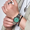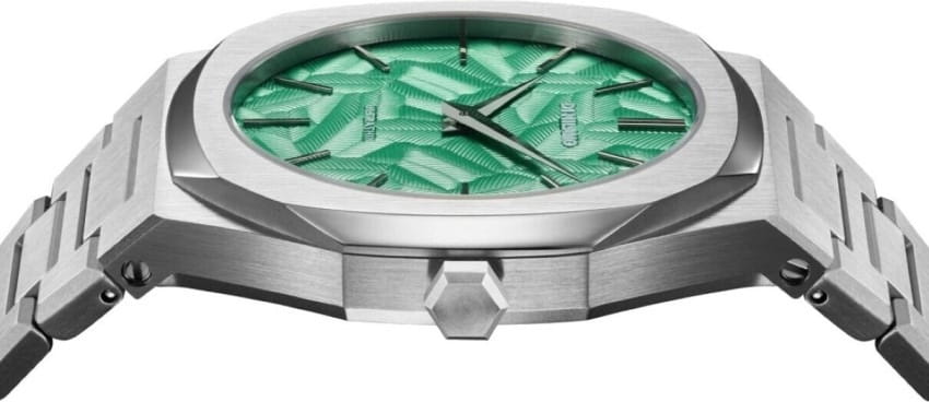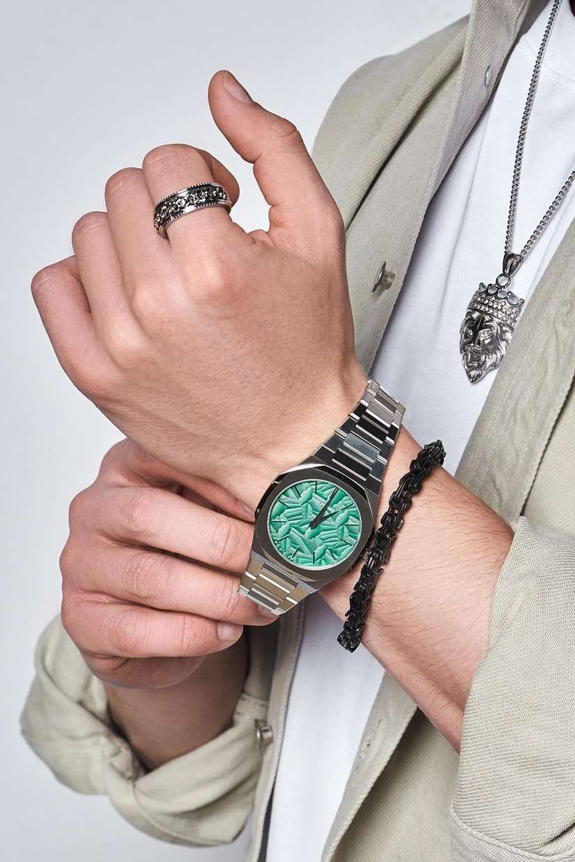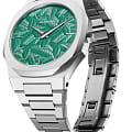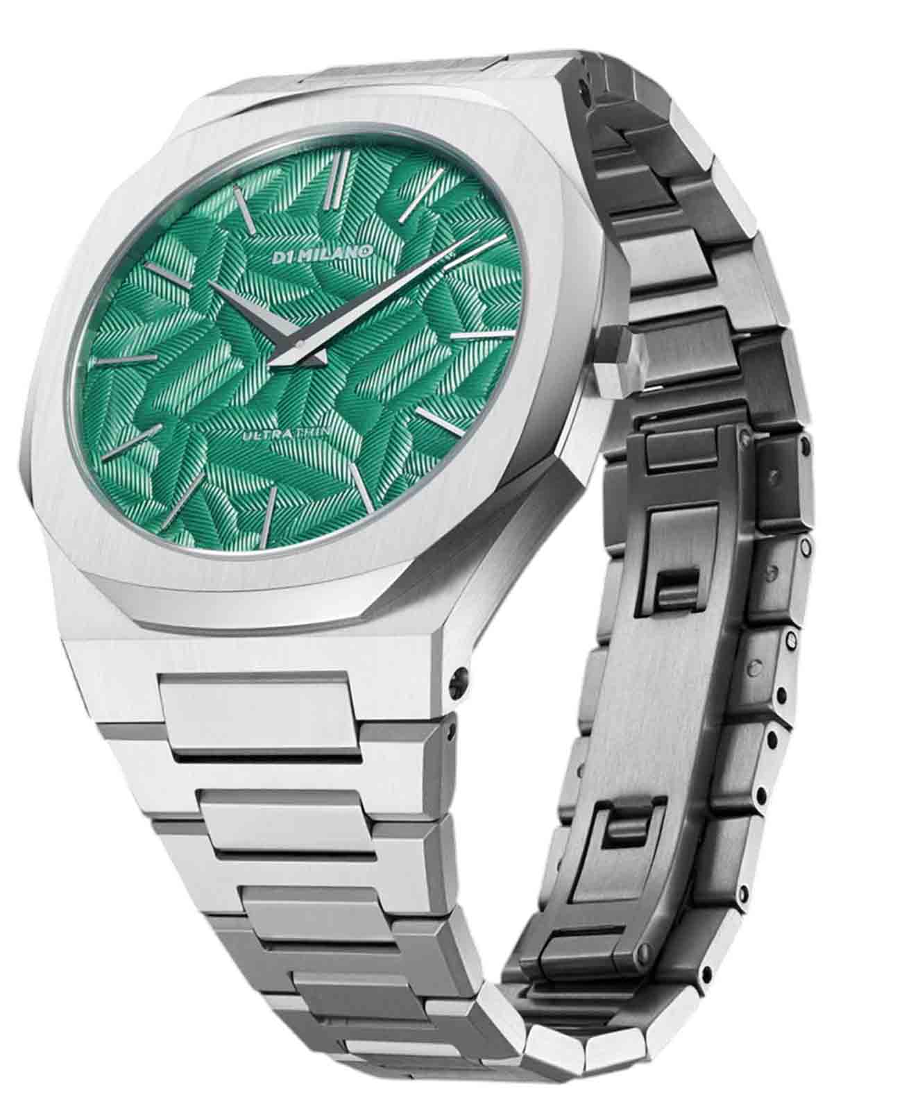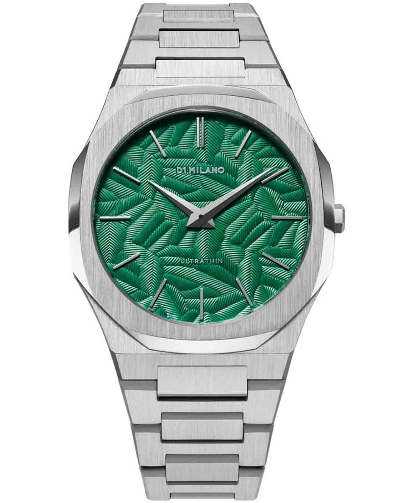 Часы D1 Milano UTBJ34 — это уникальные кварцевые часы, которые подчеркнут ваш изысканный стиль. Эти наручные часы из коллекции Ultra Thin с эффектным монохромным дизайном станут выразительным акцентом вашего образа. Корпус диаметром 40 мм из нержавеющей стали придает часам современный и утонченный вид. Циферблат зеленого цвета выполнен в виде фигурного узора, напоминающего листья, а серебристые хроматические стрелки и индексы создают стильный контраст, подчёркивая элегантность модели. Задняя крышка из нержавеющей стали закреплена на 8-х винтах и дополнена индивидуальным серийным номером, что подчеркивает уникальность каждого экземпляра. Стальной браслет с раскладной застёжкойРаскладная застёжкаТакой тип застёжки используется только на браслетах из металла. Она никогда не раскрывается полностью, происходит разделение на 2 и более частей. Раскладывающая застёжка снизит вероятность потери часов к минимуму. обеспечивает надежность и комфорт в повседневном использовании. Сапфировое стеклоСапфировое стеклоПрочный и надёжный материал из кристалла сапфира синтетического происхождения, характеризующийся особой твёрдостью и устойчивостью к царапинам и повреждениям. с антибликовым покрытием защищает циферблат, а водозащита до 50WR делает эти часы практичным выбором для любых условий. Благодаря калибру Miyota GL24, они отличаются точностью и надежностью. Эти итальянские часы представляют собой идеальное сочетание традиционного мастерства и инновационного подхода, воплощая в себе новый взгляд на классическую элегантность.