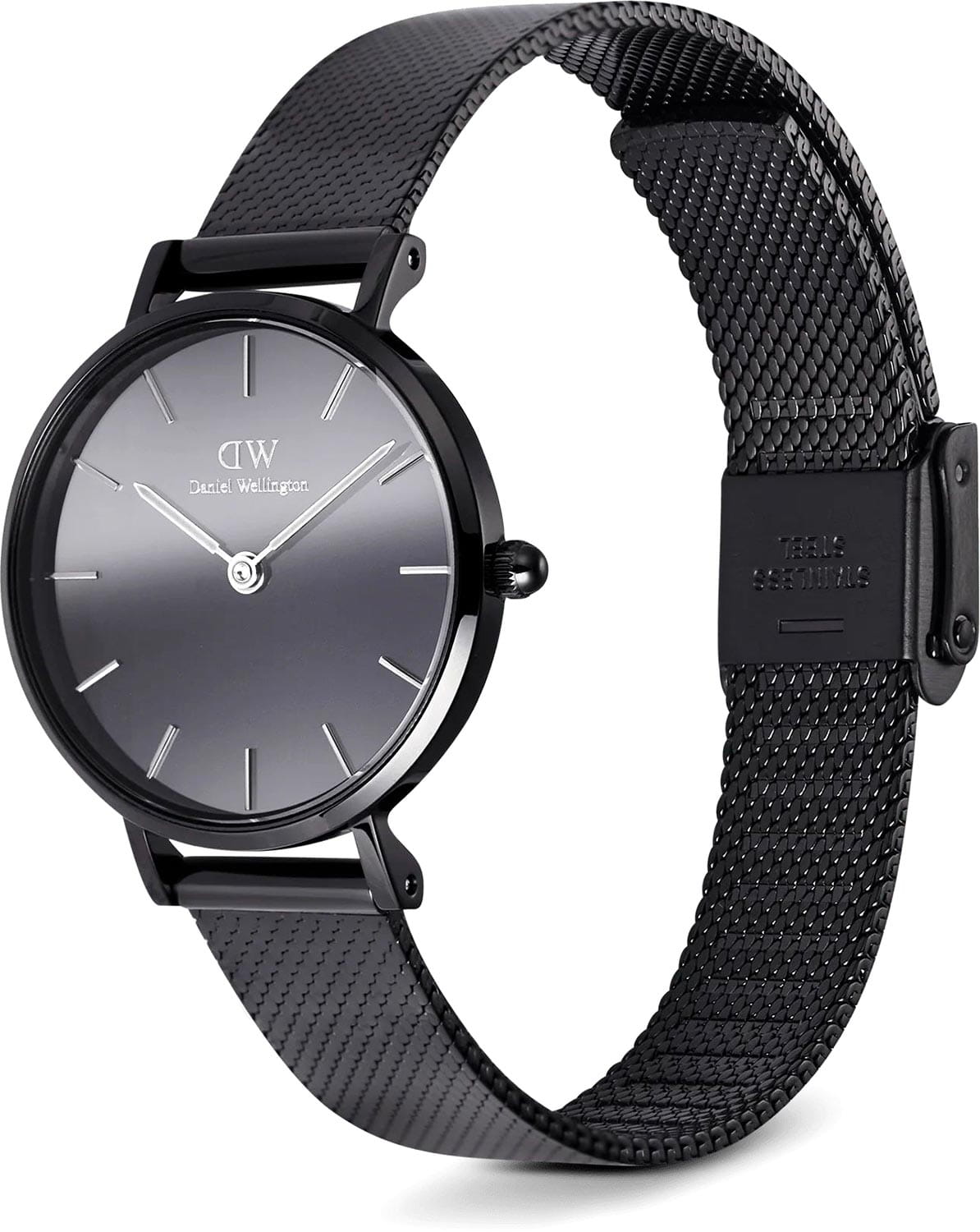 Daniel Wellington — женские часы, которые воплощают утончённый минимализм. Круглый корпус диаметром 28 мм выполнен из нержавеющей стали с глубоким чёрным PVDPVDУльтратонкое покрытие наносится в технике вакуумного напыления, сочетает в себе нитрид титана особой прочности со слоем золота или оксида хрома. Несёт в себе декоративную или защитную функцию.-покрытием, что придаёт образу современную строгость и элегантность.