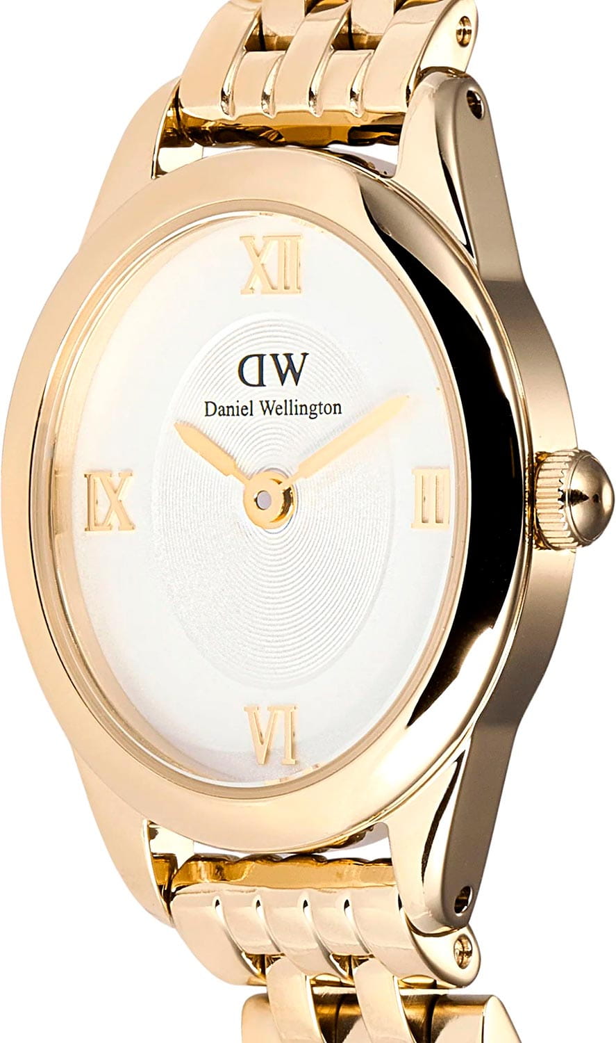 Daniel Wellington Ophelia — женственные часы с овальным корпусом 22 мм из нержавеющей стали с изящным PVDPVDУльтратонкое покрытие наносится в технике вакуумного напыления, сочетает в себе нитрид титана особой прочности со слоем золота или оксида хрома. Несёт в себе декоративную или защитную функцию.-покрытием в цвете золота. Глубокий циферблат с радиальным переливом украшен римскими индексами, что придаёт образу классическую элегантность.