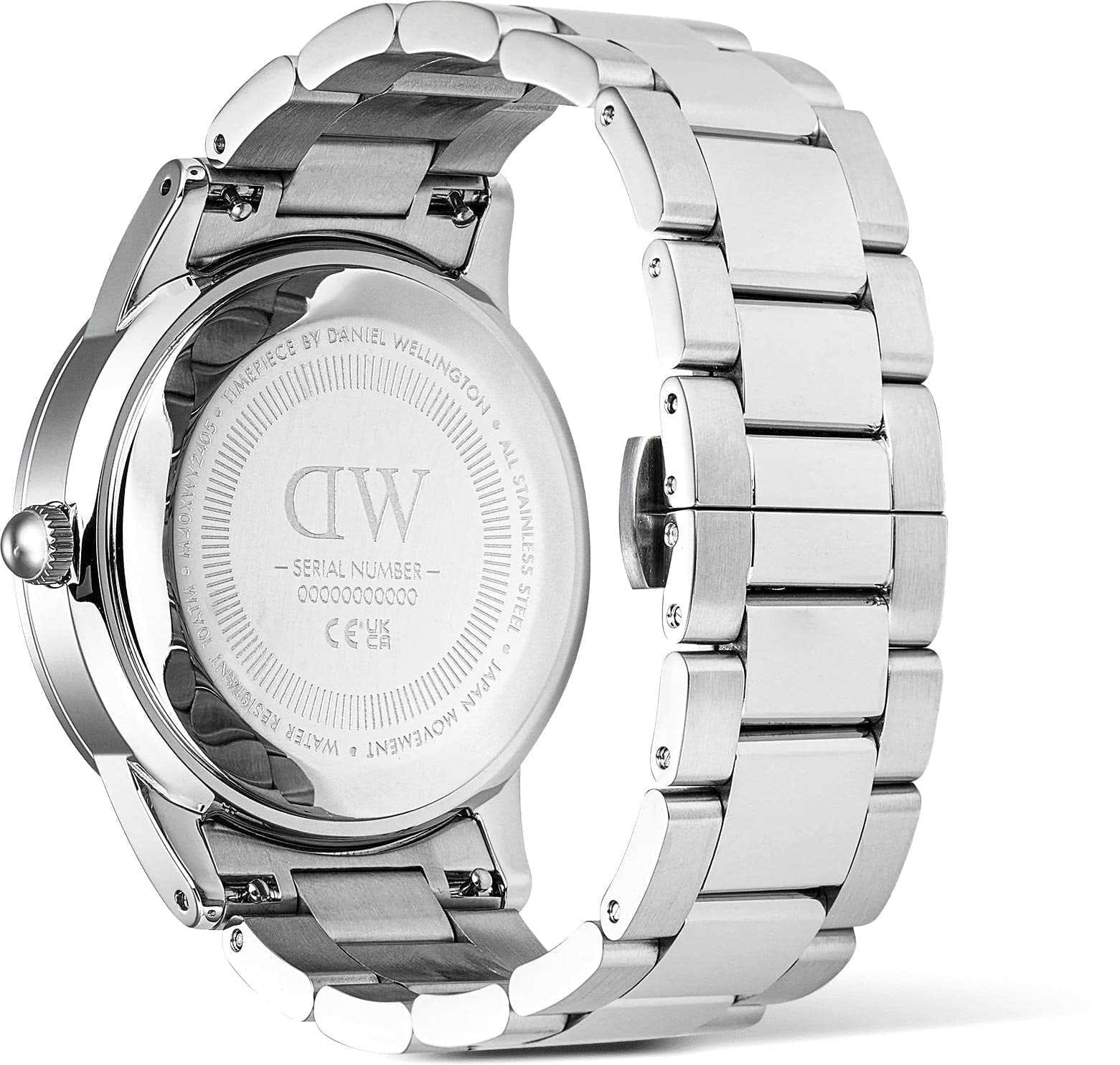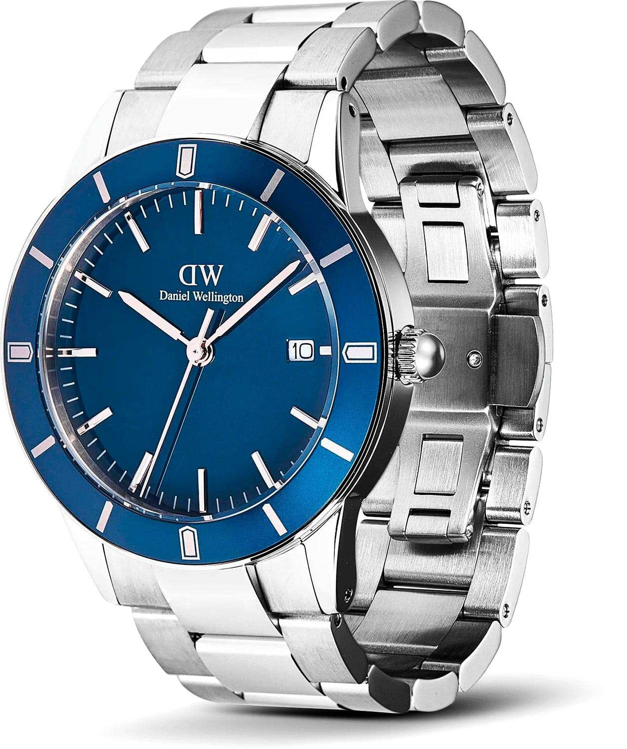 Daniel Wellington — мужские часы в современном спортивно-элегантном стиле. Круглый корпус диаметром 40 мм изготовлен из нержавеющей стали и дополнен синим безелемБезельВнешний ободок, закрепляющий стекло. В спортивных часах так называется поворотное кольцо с делениями на циферблате, выполняет роль таймера – замеряет отрезки времени на шкале. Неподвижный безель – элемент декора. Однонаправленно вращающийся безель на дайверских часах позволяет фиксировать моменты погружения и выныривания на поверхность. из анодированного алюминия, которое придаёт модели выразительный характер.