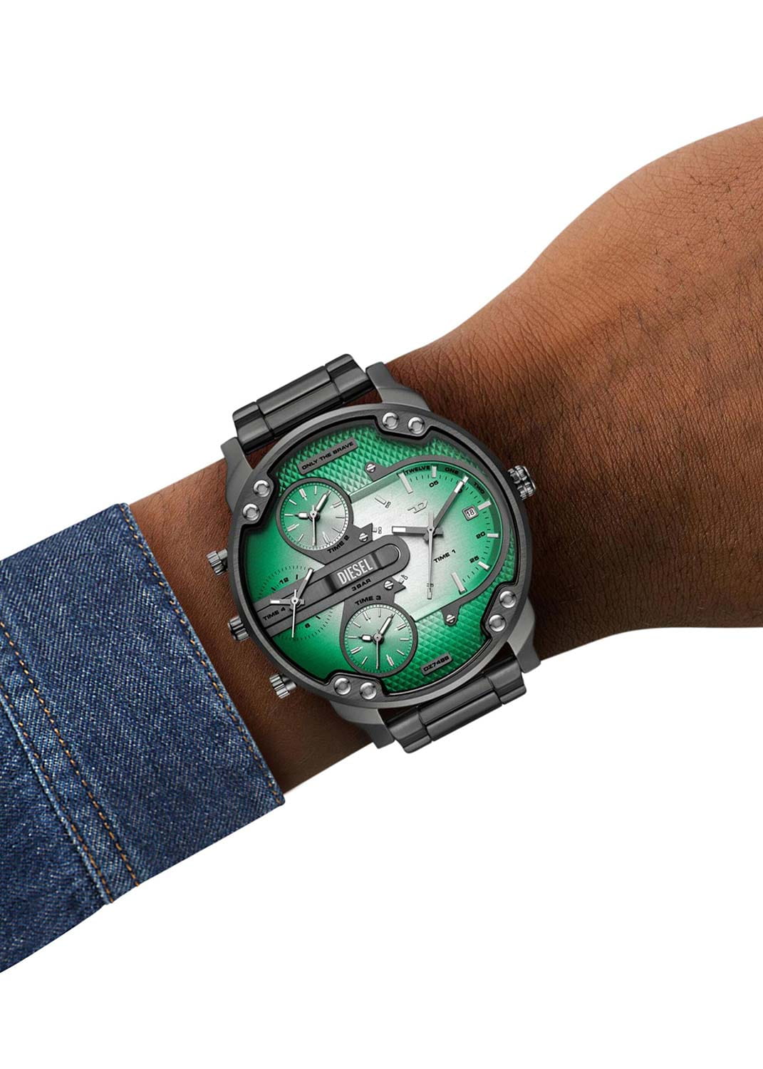 Мужские кварцевые часы Diesel Mr. Daddy 2.0 DZ7488 — это многофункциональный аксессуар, сочетающий в себе стиль и технические возможности. Модель оснащена хронографомХронографФункция позволяет измерять отрезки времени с особой точностью: часы, минуты, секунды. Верным признаком хронографа является наличие на циферблате 3 дополнительных окошек-счётчиков. с секундомеромСекундомерСекундоме́р — прибор, способный измерять интервалы времени с точностью до долей секунды., что делает её удобной для измерения времени с высокой точностью. Циферблат зеленого цвета, а его дизайн включает штриховые метки, а также окошко даты в положении 3 часов. Защиту циферблата обеспечивает Минеральное стеклоМинеральное стеклоМинеральное стекло представляет собой искусственно выращенный минерал кварца. Такое стекло отличается особой устойчивостью к повреждениям и царапинам. Уступает по некоторым качествам сапфировому стеклу., устойчивое к мелким повреждениям. Корпус диаметром 54 мм выполнен из стали с чёрным PVD-покрытиемPVDУльтратонкое покрытие наносится в технике вакуумного напыления, сочетает в себе нитрид титана особой прочности со слоем золота или оксида хрома. Несёт в себе декоративную или защитную функцию., включающим матовые и полированные детали. Стальной браслет с чёрным PVD-покрытиемPVDУльтратонкое покрытие наносится в технике вакуумного напыления, сочетает в себе нитрид титана особой прочности со слоем золота или оксида хрома. Несёт в себе декоративную или защитную функцию. оснащён раскладной застёжкойРаскладная застёжкаТакой тип застёжки используется только на браслетах из металла. Она никогда не раскрывается полностью, происходит разделение на 2 и более частей. Раскладывающая застёжка снизит вероятность потери часов к минимуму. с двумя кнопками, обеспечивающей комфорт и надёжную фиксацию на запястье. Водонепроницаемость 30WR позволяет использовать модель при мытье рук или под лёгким дождём. Эти часы станут универсальным аксессуаром для тех, кто ценит сочетание функциональности, эстетики и надёжности — идеальный выбор для повседневного использования и активного образа жизни.