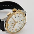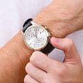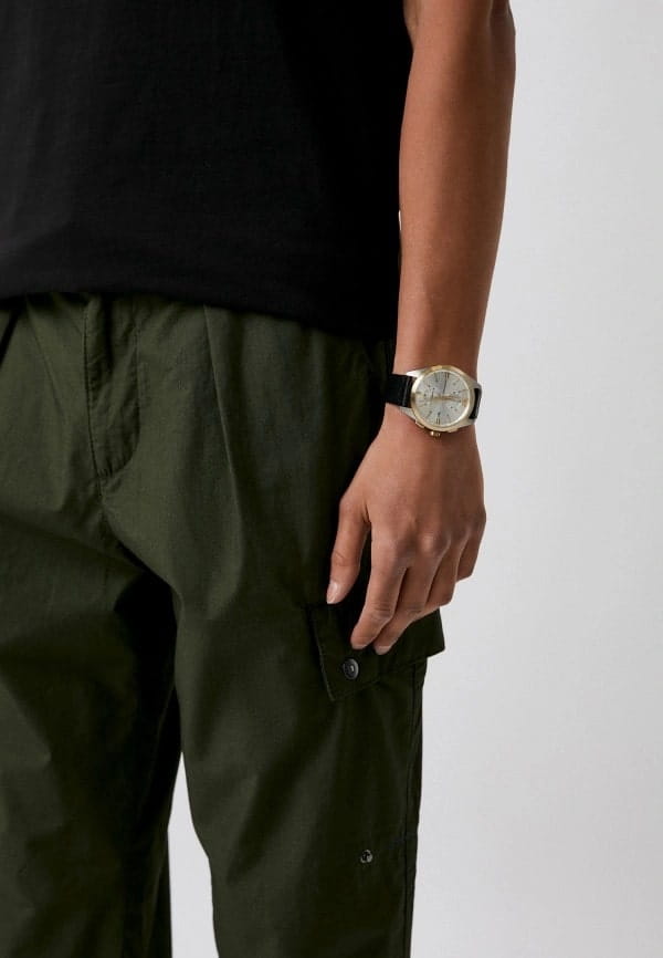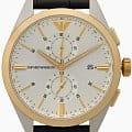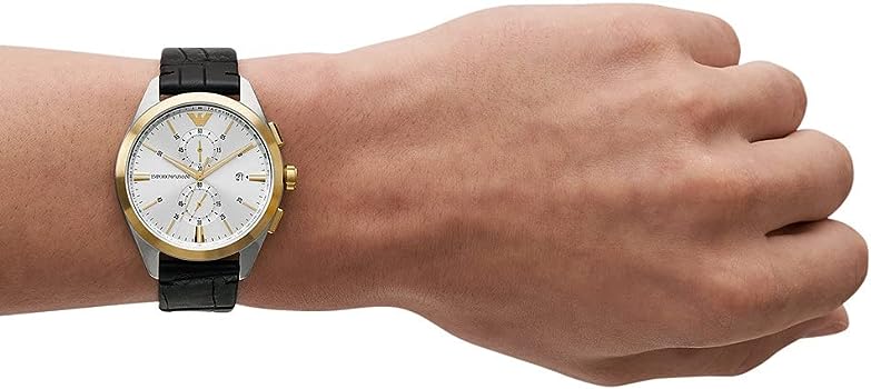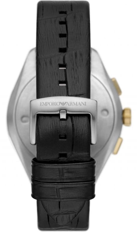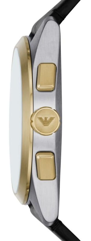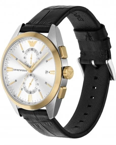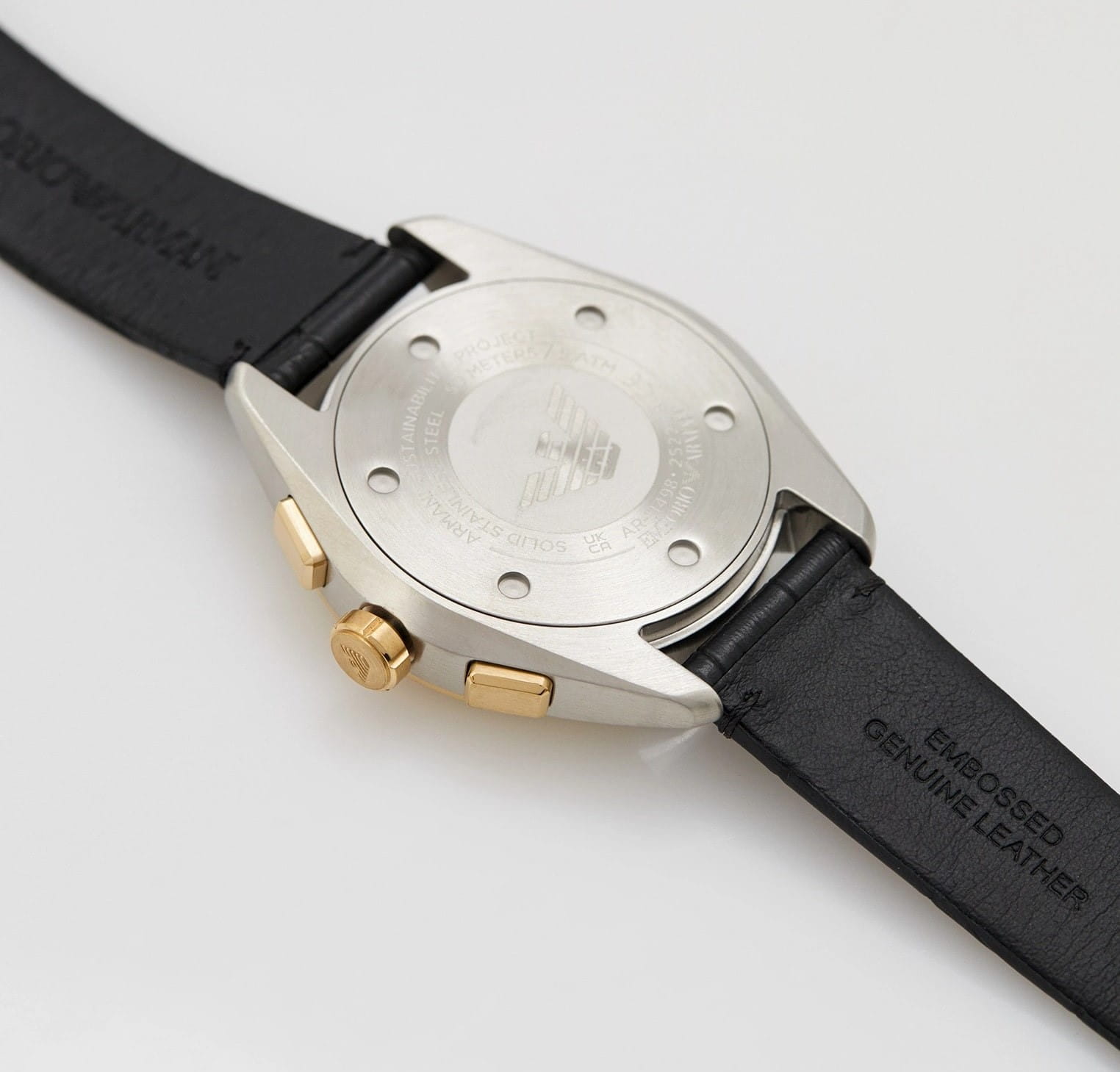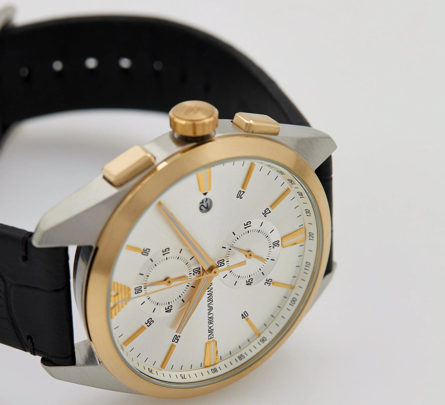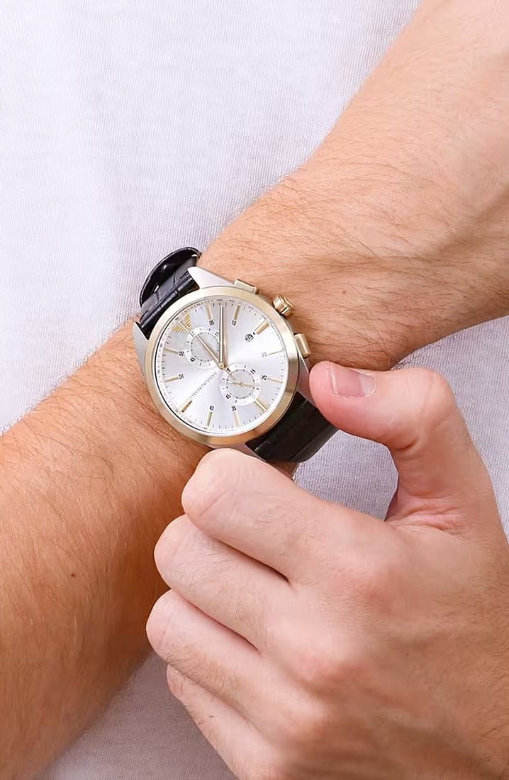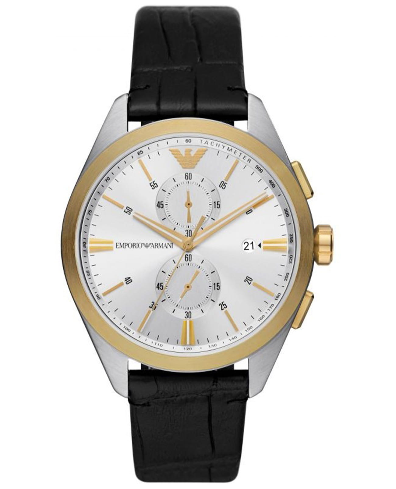 Мужские наручные часы-хронографХронографФункция позволяет измерять отрезки времени с особой точностью: часы, минуты, секунды. Верным признаком хронографа является наличие на циферблате 3 дополнительных окошек-счётчиков. с секундомеромСекундомерСекундоме́р — прибор, способный измерять интервалы времени с точностью до долей секунды. и минеральным стекломМинеральное стеклоМинеральное стекло представляет собой искусственно выращенный минерал кварца. Такое стекло отличается особой устойчивостью к повреждениям и царапинам. Уступает по некоторым качествам сапфировому стеклу. Emporio Armani Claudio AR11498, кварцевый механизм с высокой точностью. Класс водозащиты: 50 метров, позволит защитить корпус от случайных брызг или капель дождя. Корпус часов изготовлен из стали с PVD-покрытиемPVDУльтратонкое покрытие наносится в технике вакуумного напыления, сочетает в себе нитрид титана особой прочности со слоем золота или оксида хрома. Несёт в себе декоративную или защитную функцию.. Кожаный ремешок на стандартной застёжке. БезельБезельВнешний ободок, закрепляющий стекло. В спортивных часах так называется поворотное кольцо с делениями на циферблате, выполняет роль таймера – замеряет отрезки времени на шкале. Неподвижный безель – элемент декора. Однонаправленно вращающийся безель на дайверских часах позволяет фиксировать моменты погружения и выныривания на поверхность. с PVD-покрытиемPVDУльтратонкое покрытие наносится в технике вакуумного напыления, сочетает в себе нитрид титана особой прочности со слоем золота или оксида хрома. Несёт в себе декоративную или защитную функцию.. Окошко даты находится в положении 3 часа. Шкала тахиметраТахиметрРазмеченная шкала, располагается на ободке или безеле часов. Тахиметр позволяет рассчитать скорость на определённом участке пути, расстояние измеряется в километрах или милях. на циферблате. Стрелки и метки с люминесцентным покрытиемЛюминесцентное покрытиеПозволяет считывать показания времени в темноте. Производители наносят на стрелки, часовые индексы, безель или поверхность циферблата светонакопительный состав, дающий холодное свечение..