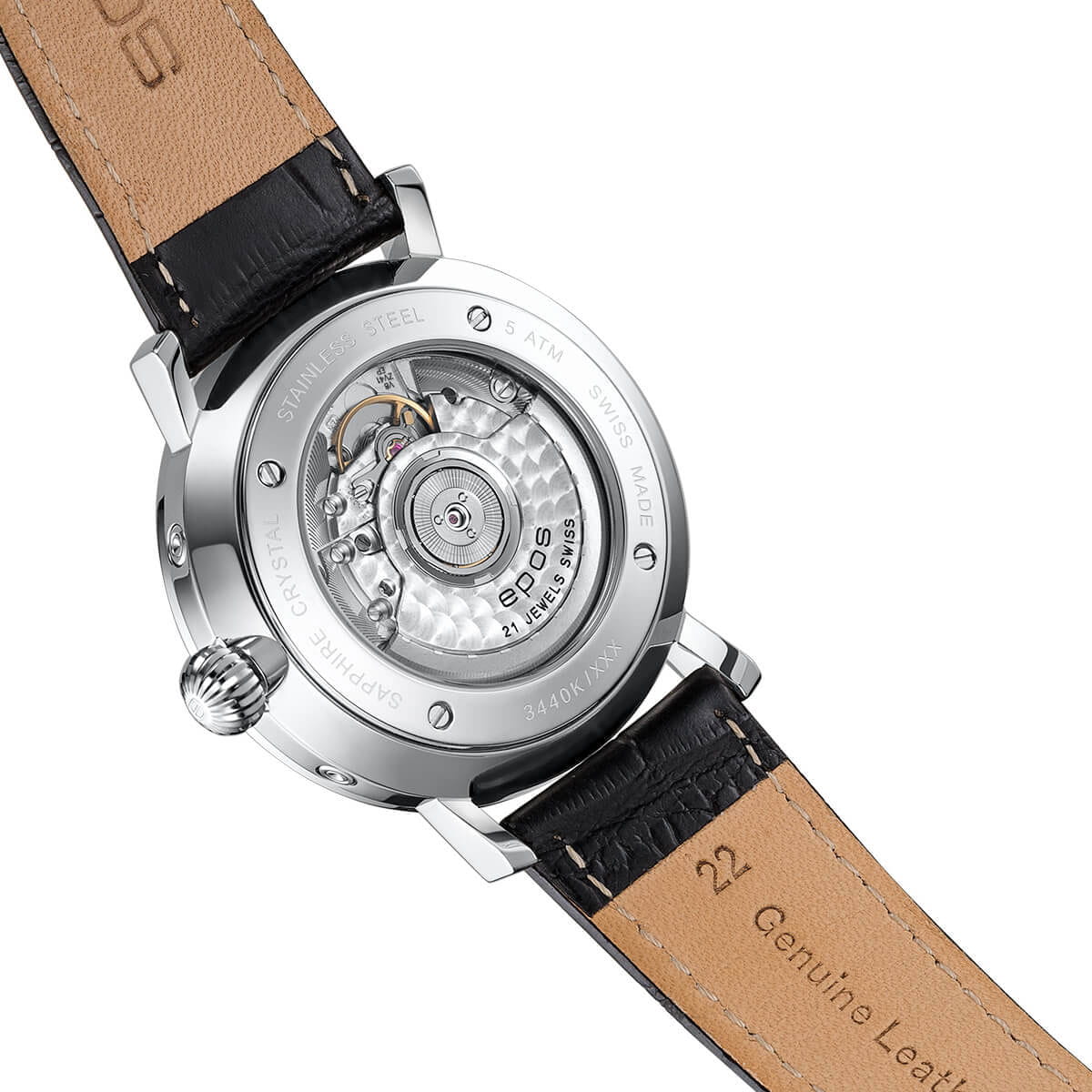 Мужские швейцарские механические часы с автоподзаводом Epos Big Moon 3440.322.20.16.25. Сапфировое стеклоСапфировое стеклоПрочный и надёжный материал из кристалла сапфира синтетического происхождения, характеризующийся особой твёрдостью и устойчивостью к царапинам и повреждениям. устойчивое к появлению царапин, обладающее высокой прозрачностью. Корпус часов изготовлен из нержавеющей стали. Стрелки и метки с люминесцентной подсветкойЛюминесцентное покрытиеПозволяет считывать показания времени в темноте. Производители наносят на стрелки, часовые индексы, безель или поверхность циферблата светонакопительный состав, дающий холодное свечение.. Циферблат с метками в виде точек. Дата отображается центральной стрелкой. Окошки для дня недели и месяца, индикатор фазы Луны. Часовой механизм декорирован жемчужной фактурной шлифовкой (Le Perlage). Прозрачная задняя крышка. Класс водозащиты: 50 метров, позволит защитить корпус от случайных брызг или капель дождя. Кожаный ремешок на стандартной застёжке.