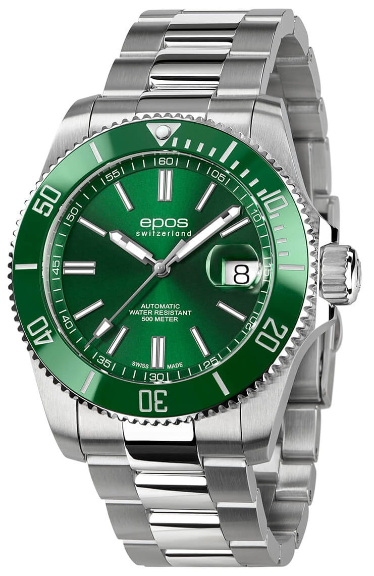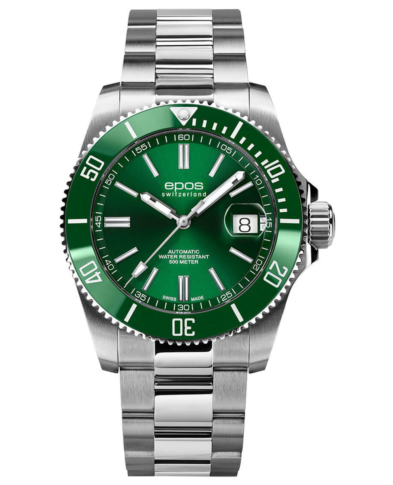 Мужские швейцарские механические часы с автоподзаводом Epos  Diver 3504.131.93.13.30. Сапфировое стеклоСапфировое стеклоПрочный и надёжный материал из кристалла сапфира синтетического происхождения, характеризующийся особой твёрдостью и устойчивостью к царапинам и повреждениям. устойчивое к появлению царапин, обладающее высокой прозрачностью. Корпус и браслет часов изготовлен из нержавеющей стали. Врачающийся в одном направлении безельБезельВнешний ободок, закрепляющий стекло. В спортивных часах так называется поворотное кольцо с делениями на циферблате, выполняет роль таймера – замеряет отрезки времени на шкале. Неподвижный безель – элемент декора. Однонаправленно вращающийся безель на дайверских часах позволяет фиксировать моменты погружения и выныривания на поверхность. из нержавеющей стали с PVDPVDУльтратонкое покрытие наносится в технике вакуумного напыления, сочетает в себе нитрид титана особой прочности со слоем золота или оксида хрома. Несёт в себе декоративную или защитную функцию. покрытием. Лупа над окошком даты. Прозрачная задняя крышка. Завинчивающаяся заводная головка. Класс водозащиты: 500 метров, позволит плавать, нырять и заниматься другими водными видами спорта. Стальной браслет на раскладной застёжкеРаскладная застёжкаТакой тип застёжки используется только на браслетах из металла. Она никогда не раскрывается полностью, происходит разделение на 2 и более частей. Раскладывающая застёжка снизит вероятность потери часов к минимуму..
