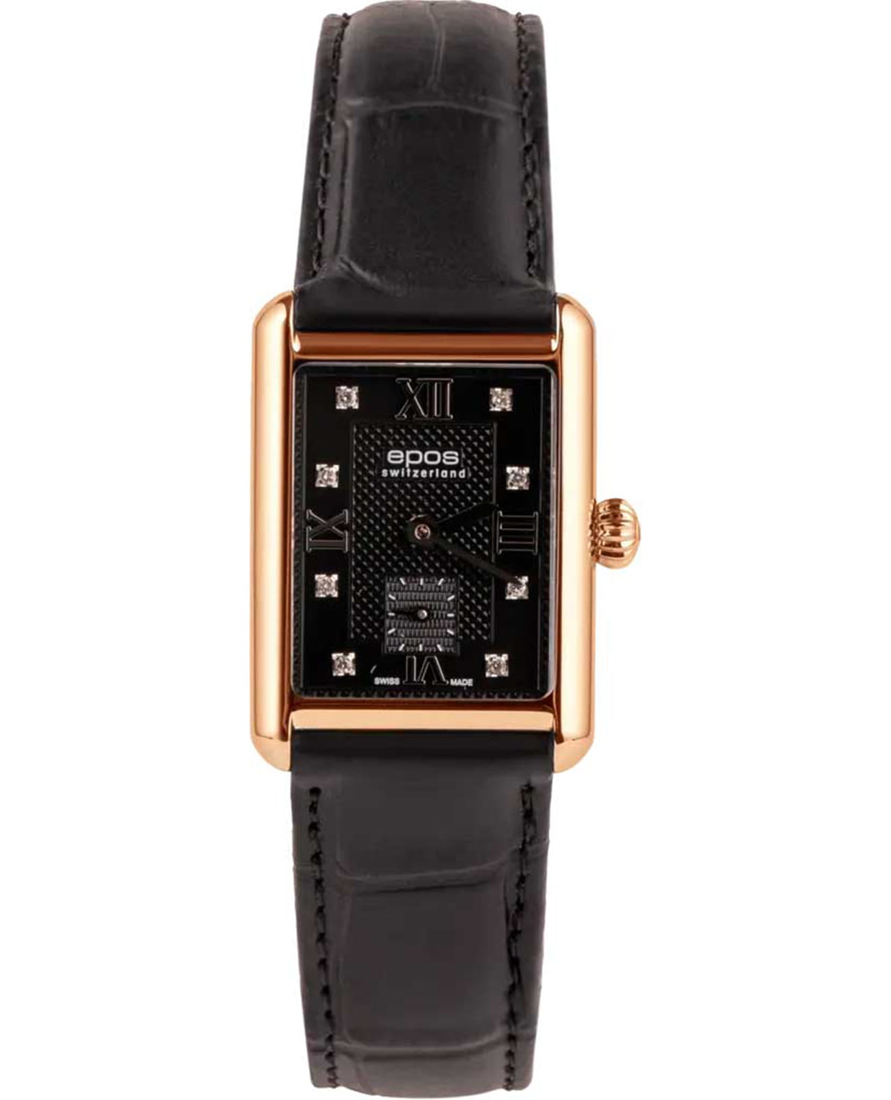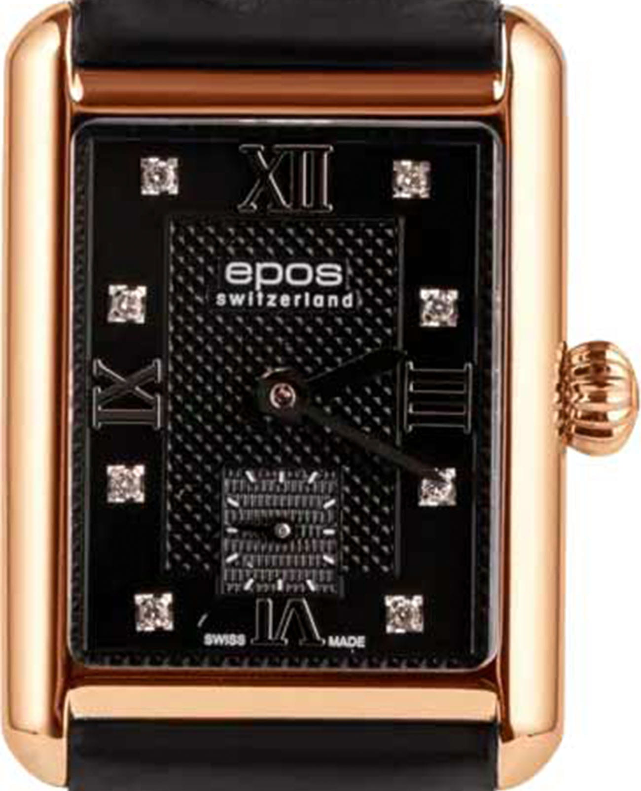 Женские кварцевые часы Epos — это элегантный аксессуар с прямоугольным корпусом размером 21×24 мм и толщиной 7 мм, выполненным из нержавеющей стали 316L с PVD-покрытиемPVDУльтратонкое покрытие наносится в технике вакуумного напыления, сочетает в себе нитрид титана особой прочности со слоем золота или оксида хрома. Несёт в себе декоративную или защитную функцию. розового золота. Циферблат чёрного цвета оформлен римскими цифрами и точками, инкрустированными 8 синтетическими бриллиантами. Секундная стрелка вынесена на отдельный субциферблат, что придаёт дизайну изысканности. Циферблат защищён сапфировым стекломСапфировое стеклоПрочный и надёжный материал из кристалла сапфира синтетического происхождения, характеризующийся особой твёрдостью и устойчивостью к царапинам и повреждениям., устойчивым к царапинам. Механизм — кварцевый калибр Ronda 1064. Часы оснащены кожаным ремешком с классической пряжкой. Водонепроницаемость 30 м позволяет использовать часы в повседневных условиях. Гарантия — 24 месяца. Идеальный выбор для тех, кто ценит швейцарское качество, классический стиль и изящество.