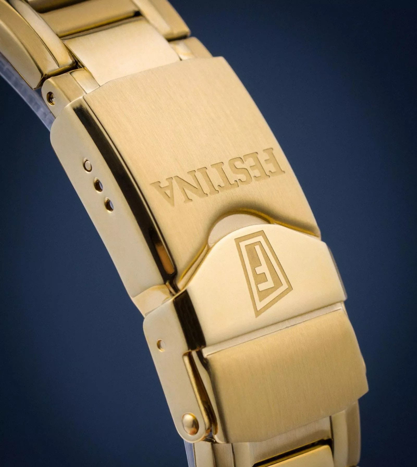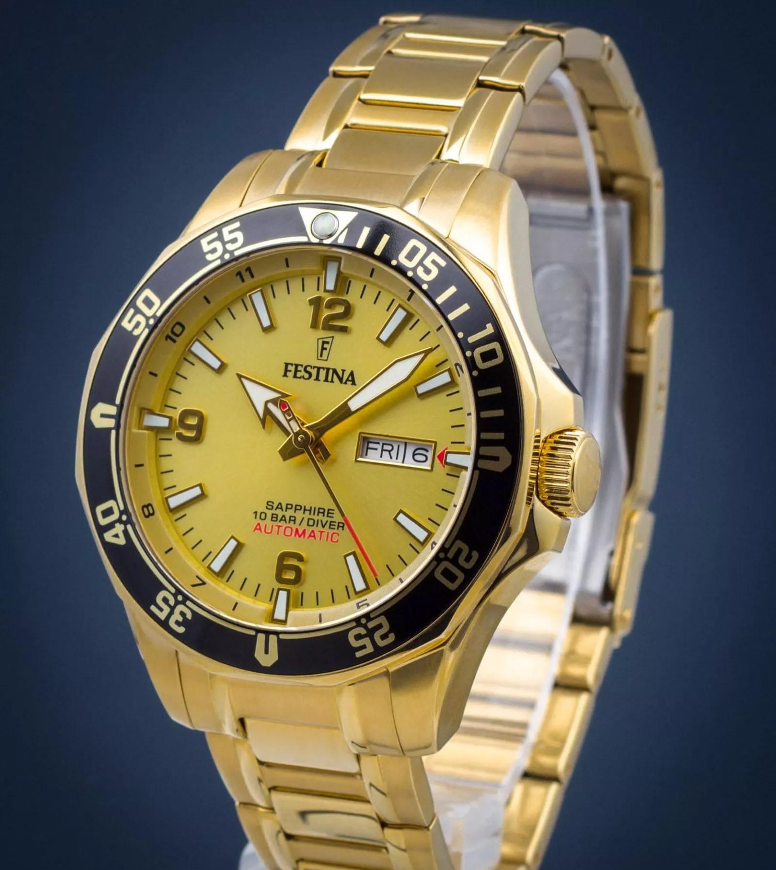 Мужские механические часы Festina Automatic F20479/1, механический механизм (автоматический калибр) с высокой точностью. Сапфировое стеклоСапфировое стеклоПрочный и надёжный материал из кристалла сапфира синтетического происхождения, характеризующийся особой твёрдостью и устойчивостью к царапинам и повреждениям. устойчивое к появлению царапин, обладающее высокой прозрачностью. Класс водозащиты: 100 метров, позволит плавать, нырять и заниматься другими водными видами спорта. Корпус часов изготовлен из стали с IP-покрытиемIP-покрытиеМетод ионного напыления. Демонстрирует повышенную устойчивость к истиранию, окислению и химическим веществам. Под воздействием высокого давления и температуры около 1500°C молекулы металла надёжно соединяются с частицами корпуса часов.. Стальной браслет на раскладной застёжкеРаскладная застёжкаТакой тип застёжки используется только на браслетах из металла. Она никогда не раскрывается полностью, происходит разделение на 2 и более частей. Раскладывающая застёжка снизит вероятность потери часов к минимуму. с IP-покрытиемIP-покрытиеМетод ионного напыления. Демонстрирует повышенную устойчивость к истиранию, окислению и химическим веществам. Под воздействием высокого давления и температуры около 1500°C молекулы металла надёжно соединяются с частицами корпуса часов.. Окошки дня недели и даты находятся в положении 3 часа. БезельБезельВнешний ободок, закрепляющий стекло. В спортивных часах так называется поворотное кольцо с делениями на циферблате, выполняет роль таймера – замеряет отрезки времени на шкале. Неподвижный безель – элемент декора. Однонаправленно вращающийся безель на дайверских часах позволяет фиксировать моменты погружения и выныривания на поверхность. с IP-покрытиемIP-покрытиеМетод ионного напыления. Демонстрирует повышенную устойчивость к истиранию, окислению и химическим веществам. Под воздействием высокого давления и температуры около 1500°C молекулы металла надёжно соединяются с частицами корпуса часов.. Стрелки и метки с люминесцентным покрытиемЛюминесцентное покрытиеПозволяет считывать показания времени в темноте. Производители наносят на стрелки, часовые индексы, безель или поверхность циферблата светонакопительный состав, дающий холодное свечение..