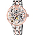 Женские механические часы-скелетоны Festina Automatic F20615/1, механический механизм (автоматический калибр) с высокой точностью. Сапфировое стеклоСапфировое стеклоПрочный и надёжный материал из кристалла сапфира синтетического происхождения, характеризующийся особой твёрдостью и устойчивостью к царапинам и повреждениям. устойчивое к появлению царапин, обладающее высокой прозрачностью. Класс водозащиты: 50 метров, позволит защитить корпус от случайных брызг или капель дождя. Корпус часов изготовлен из стали с PVD-покрытиемPVDУльтратонкое покрытие наносится в технике вакуумного напыления, сочетает в себе нитрид титана особой прочности со слоем золота или оксида хрома. Несёт в себе декоративную или защитную функцию.. Стальной браслет на раскладной застёжкеРаскладная застёжкаТакой тип застёжки используется только на браслетах из металла. Она никогда не раскрывается полностью, происходит разделение на 2 и более частей. Раскладывающая застёжка снизит вероятность потери часов к минимуму. с PVD-покрытиемPVDУльтратонкое покрытие наносится в технике вакуумного напыления, сочетает в себе нитрид титана особой прочности со слоем золота или оксида хрома. Несёт в себе декоративную или защитную функцию.. БезельБезельВнешний ободок, закрепляющий стекло. В спортивных часах так называется поворотное кольцо с делениями на циферблате, выполняет роль таймера – замеряет отрезки времени на шкале. Неподвижный безель – элемент декора. Однонаправленно вращающийся безель на дайверских часах позволяет фиксировать моменты погружения и выныривания на поверхность. с PVD-покрытиемPVDУльтратонкое покрытие наносится в технике вакуумного напыления, сочетает в себе нитрид титана особой прочности со слоем золота или оксида хрома. Несёт в себе декоративную или защитную функцию.. Циферблат с метками в виде штрихов и арабских цифр. Рифленая заводная головка.