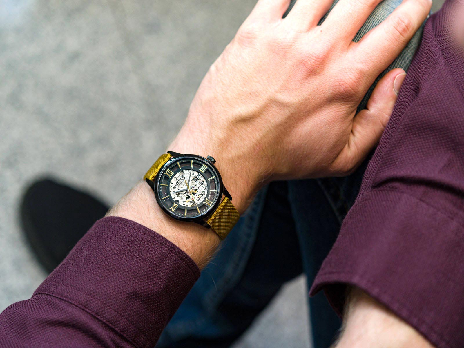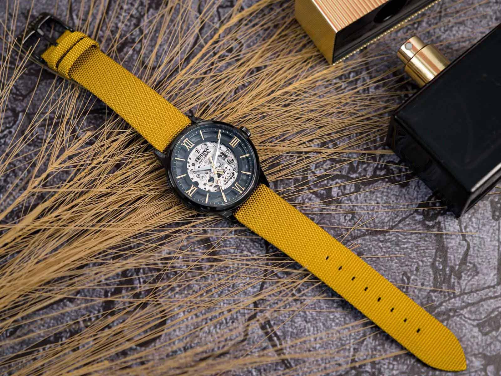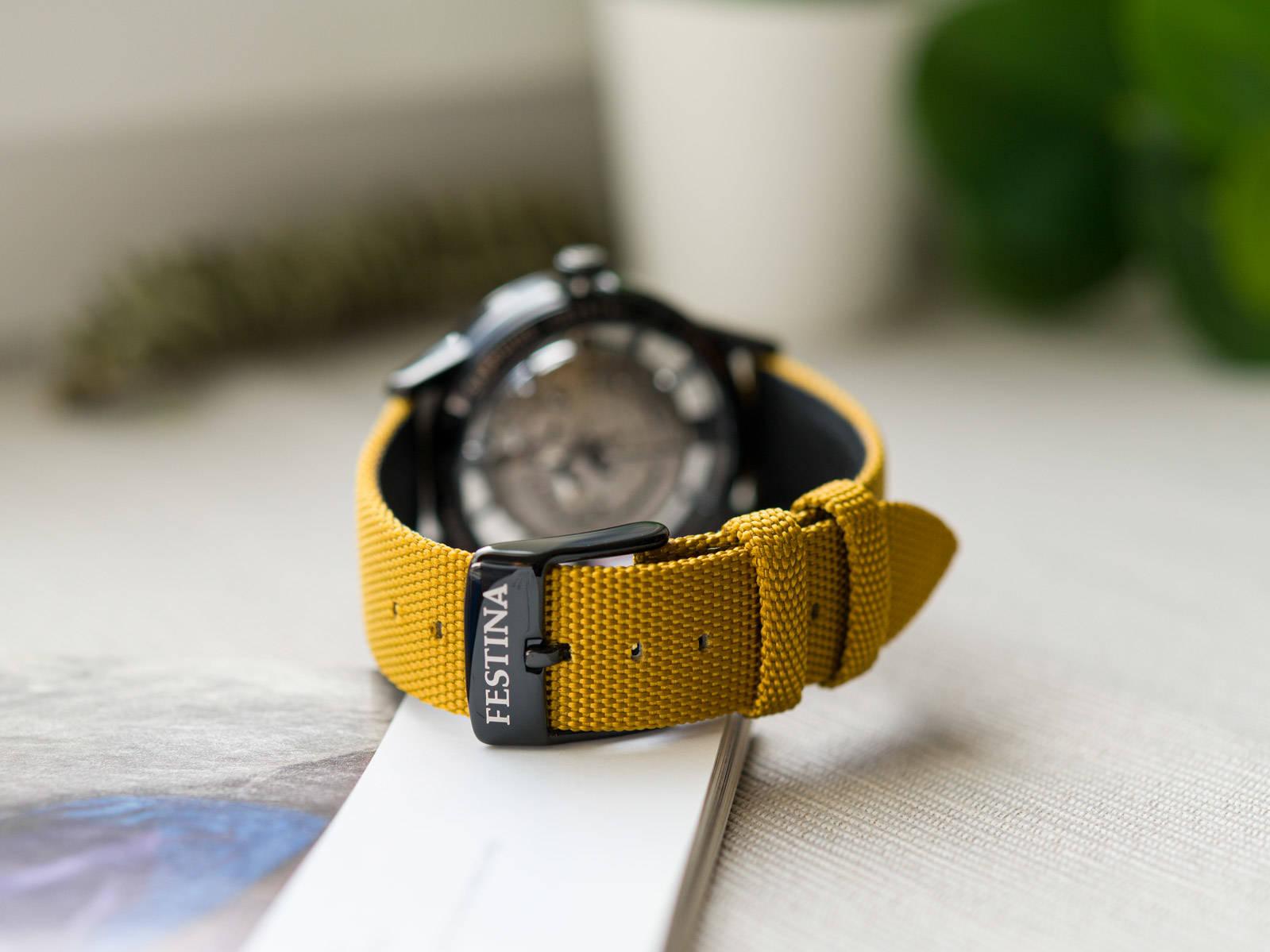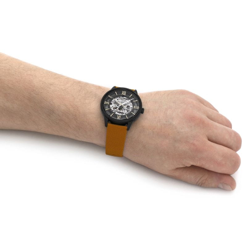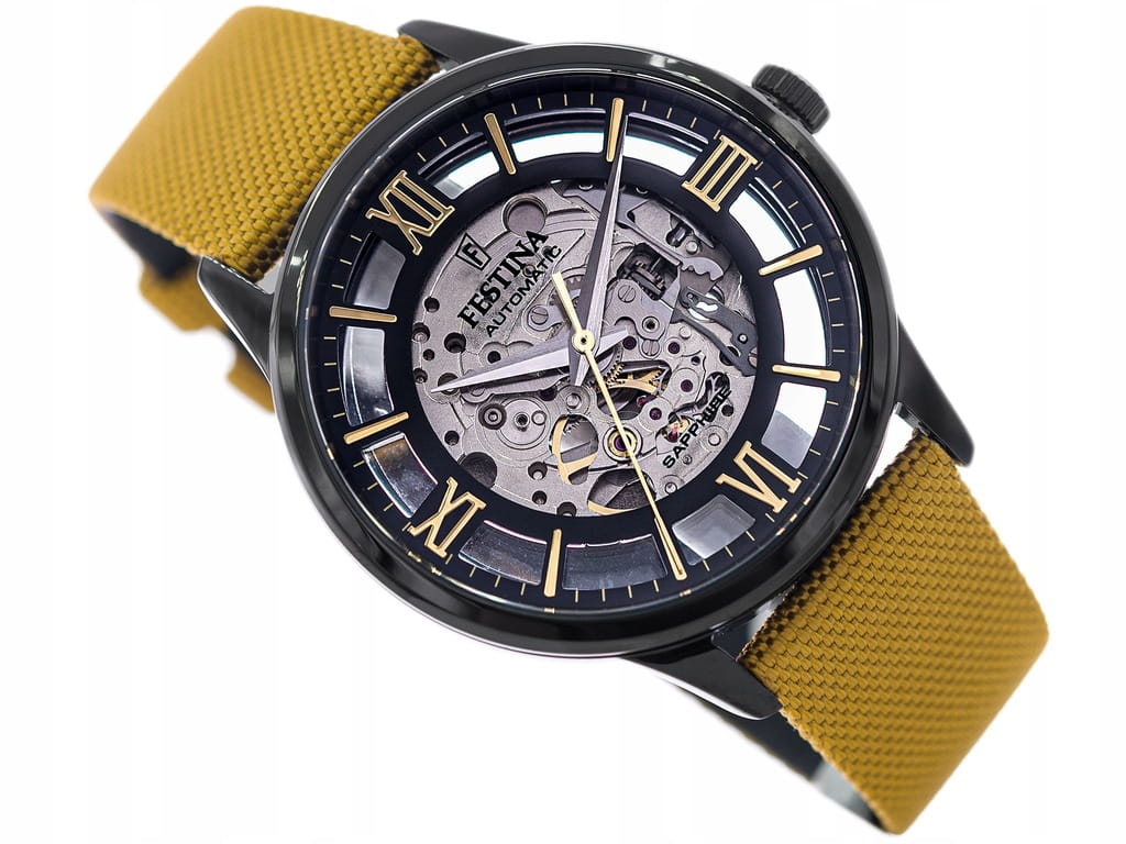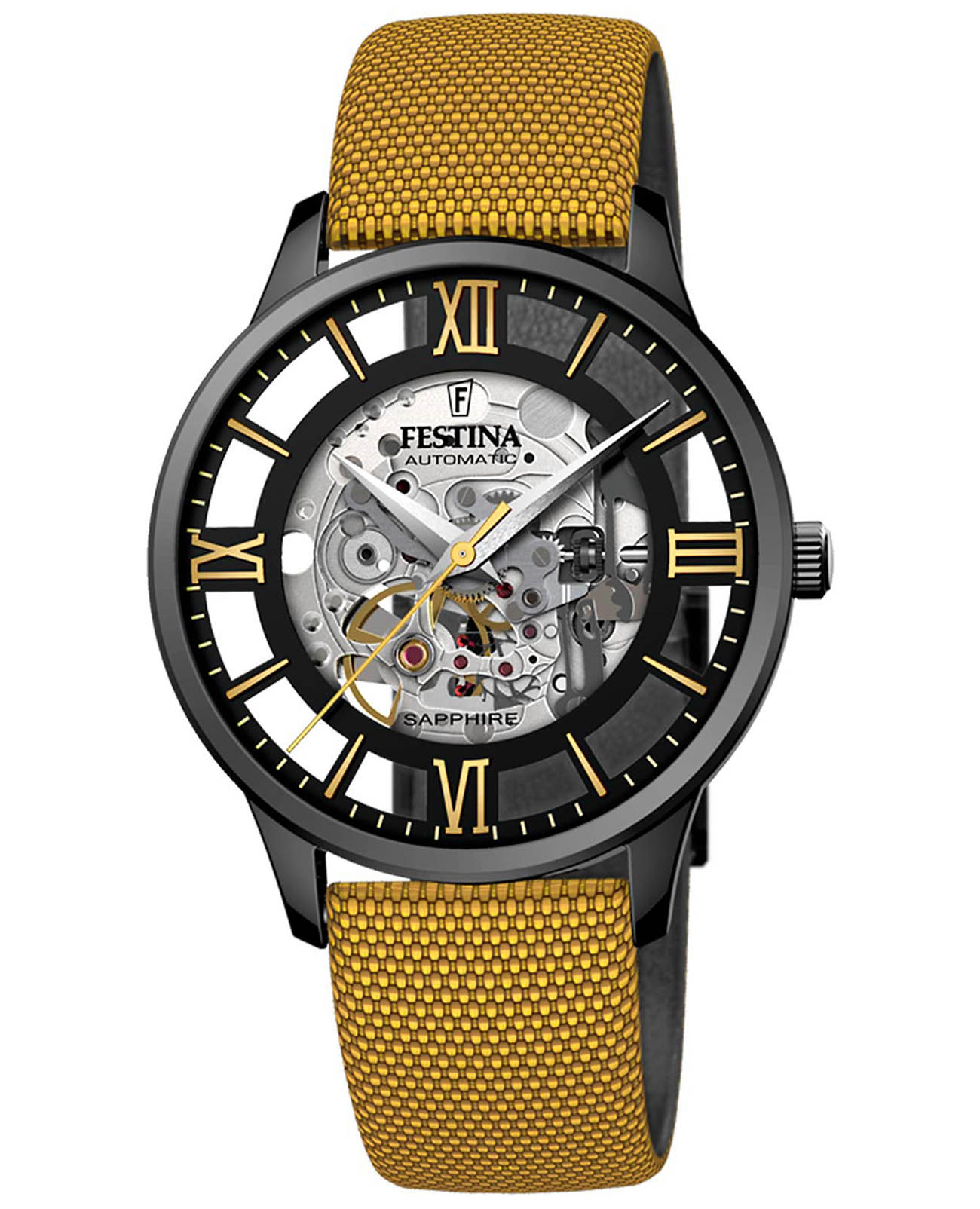 Мужские механические часы-скелетоны Festina Automatic F20621/2, механический механизм (автоматический калибр) с высокой точностью. Сапфировое стеклоСапфировое стеклоПрочный и надёжный материал из кристалла сапфира синтетического происхождения, характеризующийся особой твёрдостью и устойчивостью к царапинам и повреждениям. устойчивое к появлению царапин, обладающее высокой прозрачностью. Класс водозащиты: 50 метров, позволит защитить корпус от случайных брызг или капель дождя. Корпус часов изготовлен из стали с PVD-покрытиемPVDУльтратонкое покрытие наносится в технике вакуумного напыления, сочетает в себе нитрид титана особой прочности со слоем золота или оксида хрома. Несёт в себе декоративную или защитную функцию.. БезельБезельВнешний ободок, закрепляющий стекло. В спортивных часах так называется поворотное кольцо с делениями на циферблате, выполняет роль таймера – замеряет отрезки времени на шкале. Неподвижный безель – элемент декора. Однонаправленно вращающийся безель на дайверских часах позволяет фиксировать моменты погружения и выныривания на поверхность. с PVD-покрытиемPVDУльтратонкое покрытие наносится в технике вакуумного напыления, сочетает в себе нитрид титана особой прочности со слоем золота или оксида хрома. Несёт в себе декоративную или защитную функцию.. Тканевый ремешок на кожаной подкладке. В механизме 21 камень. Циферблат с метками в виде штрихов и римских цифр. Рифленая заводная головка.