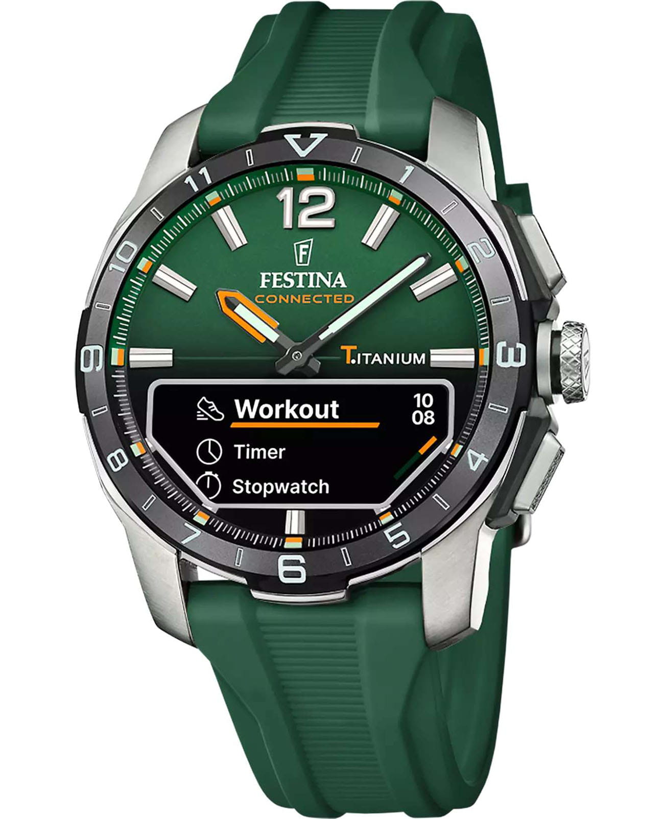 Мужские гибридные умные часы Festina Connected D — это современный аксессуар, сочетающий классический аналоговый дизайн и передовые технологии. Корпус диаметром 44 мм выполнен из лёгкого титана. БезельБезельВнешний ободок, закрепляющий стекло. В спортивных часах так называется поворотное кольцо с делениями на циферблате, выполняет роль таймера – замеряет отрезки времени на шкале. Неподвижный безель – элемент декора. Однонаправленно вращающийся безель на дайверских часах позволяет фиксировать моменты погружения и выныривания на поверхность. с IP-покрытиемIP-покрытиеМетод ионного напыления. Демонстрирует повышенную устойчивость к истиранию, окислению и химическим веществам. Под воздействием высокого давления и температуры около 1500°C молекулы металла надёжно соединяются с частицами корпуса часов.. Циферблат зелёного цвета оформлен штрихами и стрелками. В центре циферблата расположен небольшой OLED-дисплей для отображения цифровой информации. Циферблат защищён сапфировым стекломСапфировое стеклоПрочный и надёжный материал из кристалла сапфира синтетического происхождения, характеризующийся особой твёрдостью и устойчивостью к царапинам и повреждениям.. Часы оснащены функциями BluetoothBluetoothСовременная технология, позволяющая синхронизировать часы с телефоном и переносить данные. Часы с Bluetooth расширяют возможности вашего смартфона и делают его использование ещё более удобным., мирового времениМировое время Полезное часовое усложнение, отображающее время в основных городах и известных областях по всему миру, оно связано с часовыми поясами, удобно для путешественников и бизнесменов. , будильника, таймера обратного отсчёта, секундомера, а также уведомлений о звонках, сообщениях и напоминаниях. Стрелки и метки с люминесцентным покрытиемЛюминесцентное покрытиеПозволяет считывать показания времени в темноте. Производители наносят на стрелки, часовые индексы, безель или поверхность циферблата светонакопительный состав, дающий холодное свечение. обеспечивают читаемость в темноте. Часы оснащены силиконовым ремешком зелёного цвета на стандартной пряжке. Водонепроницаемость 30 м позволяет использовать часы в повседневных условиях. Идеальный выбор для тех, кто ценит стиль, точность и интеллектуальные функции.