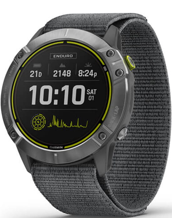 Умные многофункциональные мужские часы Garmin Enduro 010-02408-00, электронный механизм с высокой точностью. Класс водозащиты: 100 метров, позволит плавать, нырять и заниматься другими водными видами спорта. Стальной корпус. Циферблат с сапфировым стекломСапфировое стеклоПрочный и надёжный материал из кристалла сапфира синтетического происхождения, характеризующийся особой твёрдостью и устойчивостью к царапинам и повреждениям.. Экран с светодиодной подсветкойСветодиодная подсветкаСветодиодная или LED-подсветка обеспечивает появление яркого холодного свечения за счёт LED-элементов - маленьких лампочек. Они потребляют минимальное количество энергии, чаще всего можно встретить 1 светодиод, в нижней части циферблата.. Нейлоновый ремешок.