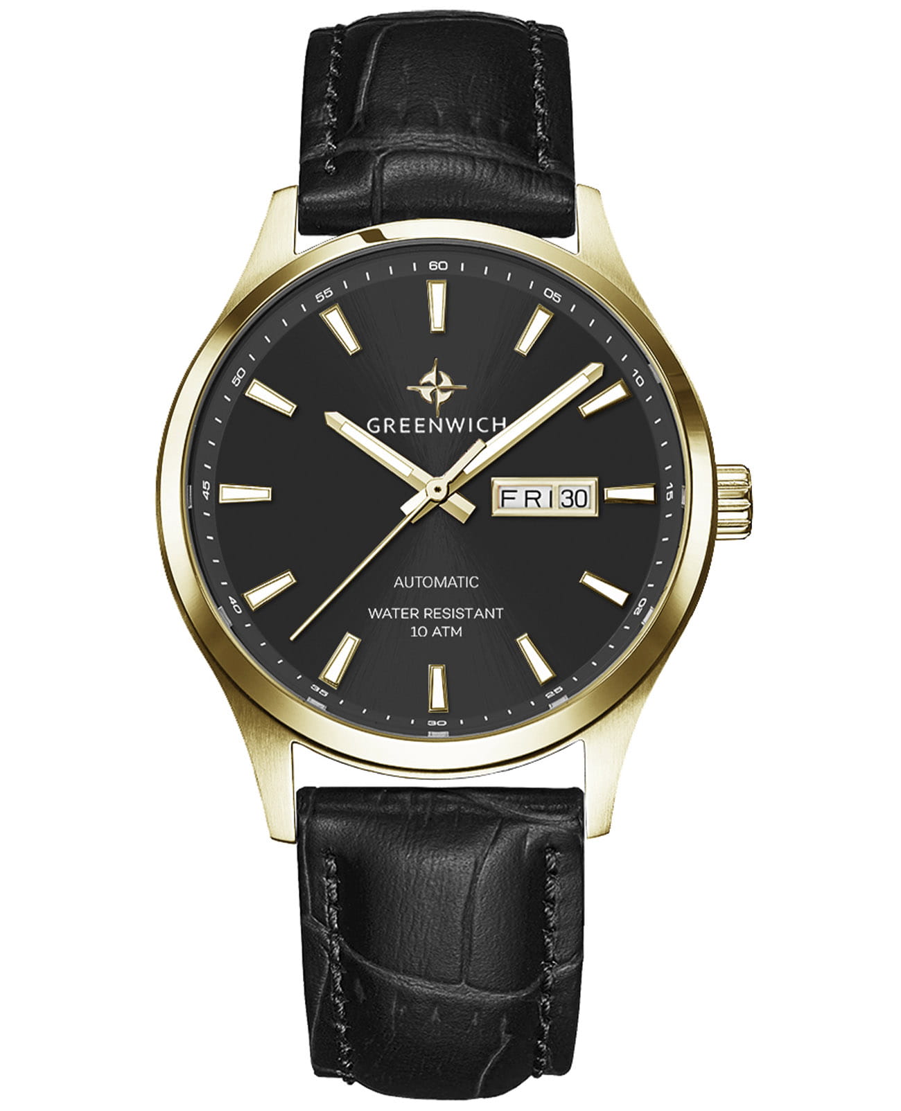 Мужские часы Greenwich Good Luck GW 054.21.31, механический механизм (автоматический калибр) с высокой точностью. Классический круглый стальной корпус с PVD-покрытиемPVDУльтратонкое покрытие наносится в технике вакуумного напыления, сочетает в себе нитрид титана особой прочности со слоем золота или оксида хрома. Несёт в себе декоративную или защитную функцию., защищенный минеральным стекломМинеральное стеклоМинеральное стекло представляет собой искусственно выращенный минерал кварца. Такое стекло отличается особой устойчивостью к повреждениям и царапинам. Уступает по некоторым качествам сапфировому стеклу.. Стрелки и метки с люминесцентным покрытиемЛюминесцентное покрытиеПозволяет считывать показания времени в темноте. Производители наносят на стрелки, часовые индексы, безель или поверхность циферблата светонакопительный состав, дающий холодное свечение.. Кожаный ремешок на стандартной застёжке. Класс водозащиты: 100 метров, позволит плавать, нырять и заниматься другими водными видами спорта. Окошко даты и дня недели находится в положении 3 часа.