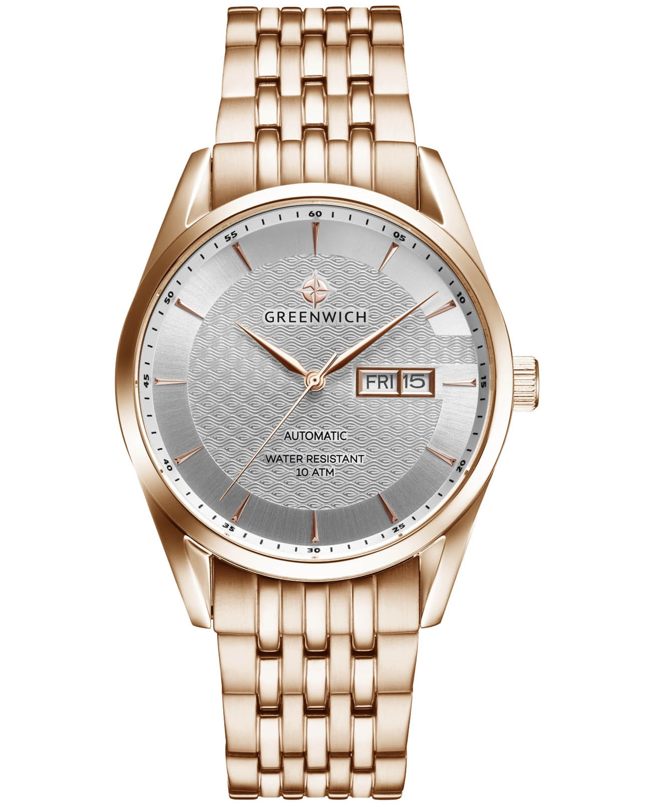 Мужские часы с минеральным стекломМинеральное стеклоМинеральное стекло представляет собой искусственно выращенный минерал кварца. Такое стекло отличается особой устойчивостью к повреждениям и царапинам. Уступает по некоторым качествам сапфировому стеклу. Greenwich Good Luck Classic GW 074.40.33, представляют собой классический вариант для повседневной носки. В центральной части циферблата — отличительная черта моделей этой серии: гильоше, объемные линии которого напоминают волны. Обратите внимание на форму пластины, где крепятся накладные риски: она сделана в форме латинской буквы G, первой буквы в названии бренда. Часы характеризуются традиционными формами, лаконичным исполнением, что делает модель элегантным дополнением к деловому костюму. Сквозь прозрачную заднюю крышку вы увидите детали механизма TMI с декорированным ротором: на нем выгравировано изображение символа английских моряков — парусника. Корпус, браслет и раскладная застёжкаРаскладная застёжкаТакой тип застёжки используется только на браслетах из металла. Она никогда не раскрывается полностью, происходит разделение на 2 и более частей. Раскладывающая застёжка снизит вероятность потери часов к минимуму. выполнены из гипоаллергенной нержавеющей стали с PVD-покрытиемPVDУльтратонкое покрытие наносится в технике вакуумного напыления, сочетает в себе нитрид титана особой прочности со слоем золота или оксида хрома. Несёт в себе декоративную или защитную функцию.. Дизайн, актуальный для любого современного образа, и надежность используемых материалов делают автоматические часы Greenwich удобным и стильным аксессуаром на каждый день. Окошко даты и дня недели находится в положении 3 часа. Класс водозащиты: 100 метров, позволит плавать, нырять и заниматься другими водными видами спорта.