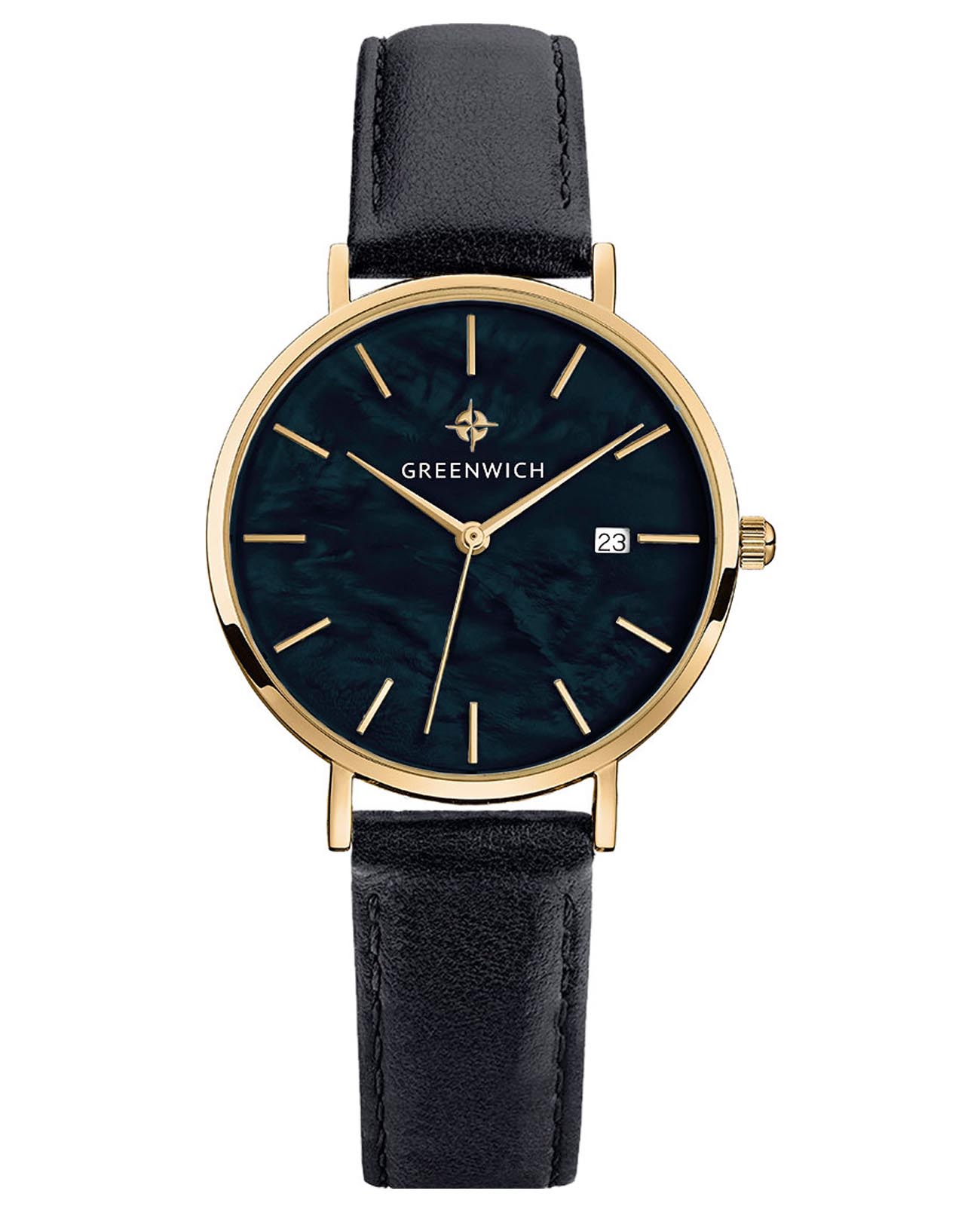 Женские наручные часы Greenwich GW 301.21.51 помогут дополнить образ элегантной особы, модель в лаконичном исполнении подойдёт для повседневной носки. Корпус часов изготовлен из нержавеющей гипоаллергенной стали, которая дополнена PVDPVDУльтратонкое покрытие наносится в технике вакуумного напыления, сочетает в себе нитрид титана особой прочности со слоем золота или оксида хрома. Несёт в себе декоративную или защитную функцию. покрытием из желтого золота. Нижняя часть корпуса заужена. Он выглядит тонким и изящно смотрится на руке. Размер корпуса 35 мм. В часах используется японский кварцевый механизм. Циферблат часов выполнен из натурального перламутра черного цвета, поэтому каждая модель уникальна и неповторима. Перламутр – это камень органического происхождения, получаемый из раковин моллюсков. Рисунок каждой раковины прекрасен и индивидуален. В процессе производства часть раковины срезается и наклеивается на латунную часть циферблата. На циферблате расположены часовая, минутная, секундная стрелки и индикатор даты. Индексы часов изготовлены вручную и закреплены на двух штифтах. Циферблат надежно защищен минеральным стеклом. На часах установлен черный ремешок из натуральной кожи. Логотип марки – изображение «розы ветров» - символизирует удачу и новые открытия. Он расположен на циферблате, заводной головке и внутренней части ремешка. Задняя крышка часов украшена изображениями «розы ветров» и корабля, который является символом марки Greenwich