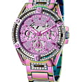 Женские наручные часы-скелетоны Guess Queen GW0464L4 с минеральным стекломМинеральное стеклоМинеральное стекло представляет собой искусственно выращенный минерал кварца. Такое стекло отличается особой устойчивостью к повреждениям и царапинам. Уступает по некоторым качествам сапфировому стеклу., кварцевый механизм с высокой точностью. Класс водозащиты: 30 метров, позволит защитить корпус от случайных брызг или капель дождя. Корпус часов изготовлен из стали с IP-покрытиемIP-покрытиеМетод ионного напыления. Демонстрирует повышенную устойчивость к истиранию, окислению и химическим веществам. Под воздействием высокого давления и температуры около 1500°C молекулы металла надёжно соединяются с частицами корпуса часов.. Браслет с раскладной застёжкойРаскладная застёжкаТакой тип застёжки используется только на браслетах из металла. Она никогда не раскрывается полностью, происходит разделение на 2 и более частей. Раскладывающая застёжка снизит вероятность потери часов к минимуму. с IP-покрытиемIP-покрытиеМетод ионного напыления. Демонстрирует повышенную устойчивость к истиранию, окислению и химическим веществам. Под воздействием высокого давления и температуры около 1500°C молекулы металла надёжно соединяются с частицами корпуса часов.. 12-ти и 24-х часовой формат времени, дата и день недели вынесены на отдельные циферблаты. Метки в виде штрихов. Рифленая заводная головка с защитой. Стрелки с люминесцентным покрытиемЛюминесцентное покрытиеПозволяет считывать показания времени в темноте. Производители наносят на стрелки, часовые индексы, безель или поверхность циферблата светонакопительный состав, дающий холодное свечение..