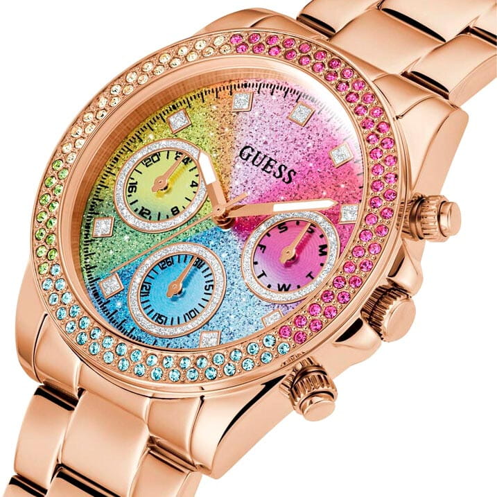 Безукоризненный функциональный аксессуар, сотканный из стали и разноцветных кристаллов, покорит ваше сердце с первого взгляда. Блистательные женские часы Sol. Круглый стальной корпус с IP-покрытиемIP-покрытиеМетод ионного напыления. Демонстрирует повышенную устойчивость к истиранию, окислению и химическим веществам. Под воздействием высокого давления и температуры около 1500°C молекулы металла надёжно соединяются с частицами корпуса часов. украшенный кристаллами. Глиттерный циферблат с метками в виде точек из кристаллов, защинен минеральным стекломМинеральное стеклоМинеральное стекло представляет собой искусственно выращенный минерал кварца. Такое стекло отличается особой устойчивостью к повреждениям и царапинам. Уступает по некоторым качествам сапфировому стеклу., устойчивым к мелким механическим повреждениям. Стрелки и метки с люминесцентным покрытиемЛюминесцентное покрытиеПозволяет считывать показания времени в темноте. Производители наносят на стрелки, часовые индексы, безель или поверхность циферблата светонакопительный состав, дающий холодное свечение..12-ти и 24-х часовой формат времени. Дата и день недели вынесены на отдельные циферблаты. Рифленая заводная головка с защитой. Стальной браслет с раскладной застёжкойРаскладная застёжкаТакой тип застёжки используется только на браслетах из металла. Она никогда не раскрывается полностью, происходит разделение на 2 и более частей. Раскладывающая застёжка снизит вероятность потери часов к минимуму.