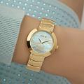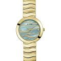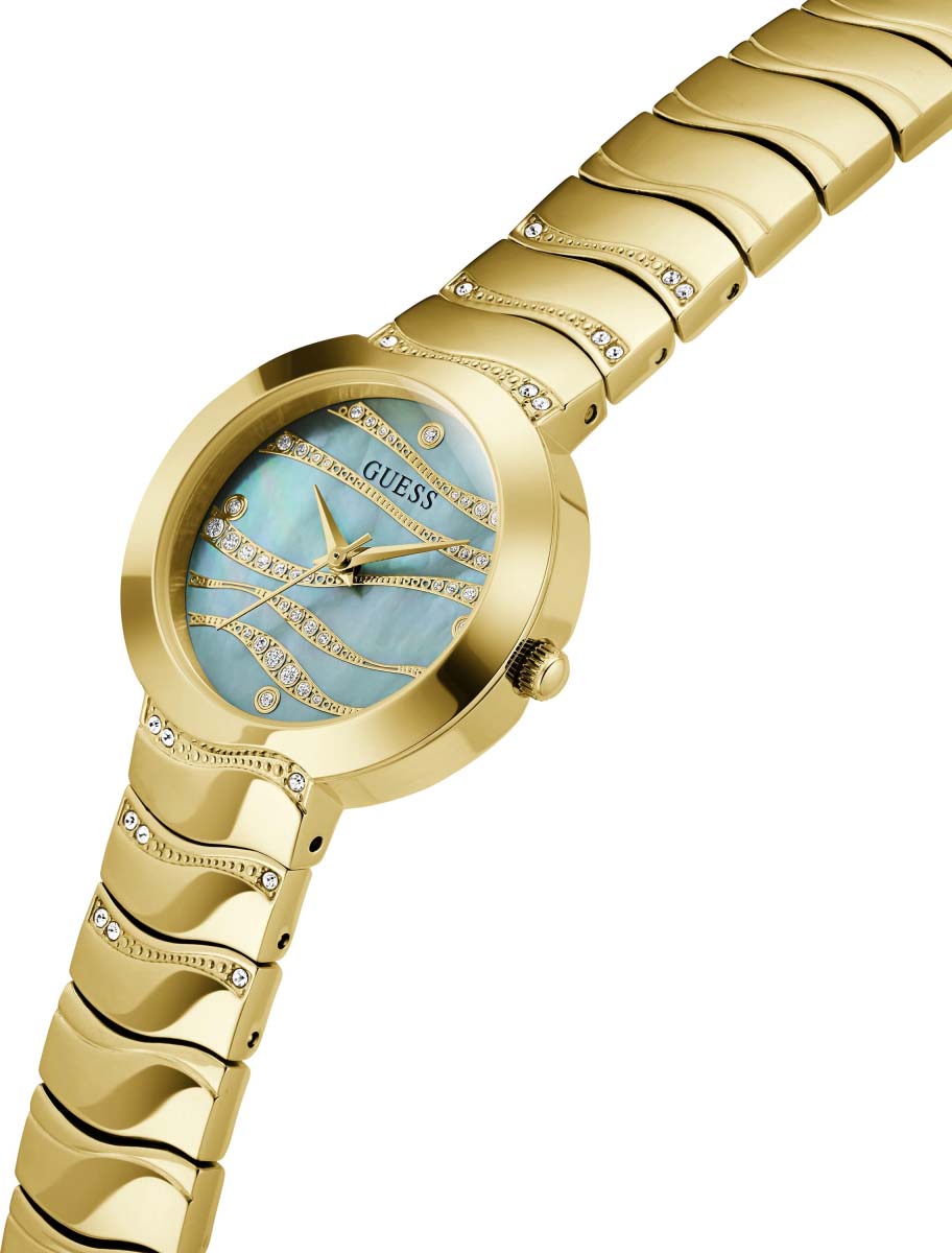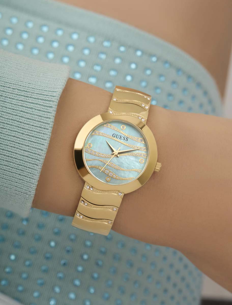 Часы Guess GW0871L1 — это стильный и утонченный аксессуар, который прекрасно дополнит образ современной женщины. Они оснащены надежным кварцевым механизмом. Корпус выполнен золотистой стали PVD-покрытиемPVDУльтратонкое покрытие наносится в технике вакуумного напыления, сочетает в себе нитрид титана особой прочности со слоем золота или оксида хрома. Несёт в себе декоративную или защитную функцию. и украшен кристаллами, что придаёт часам роскошный и элегантный вид. Перламутровый голубой циферблат с волнообразными линиями создаёт эффект глубины и изысканности, а метки в виде точек добавляют утончённости. Часы имеют рифленую заводную головку для удобной настройки времени. Стальной браслет с золотистым PVD-покрытиемPVDУльтратонкое покрытие наносится в технике вакуумного напыления, сочетает в себе нитрид титана особой прочности со слоем золота или оксида хрома. Несёт в себе декоративную или защитную функцию. с волнообразными звеньями и раскладной застежкойРаскладная застёжкаТакой тип застёжки используется только на браслетах из металла. Она никогда не раскрывается полностью, происходит разделение на 2 и более частей. Раскладывающая застёжка снизит вероятность потери часов к минимуму. обеспечивает комфортное и надежное ношение, а также украшен кристаллами, что добавляет блеска и привлекательности. Водозащита 30WR гарантирует защиту от случайных брызг воды. Минеральное стеклоМинеральное стеклоМинеральное стекло представляет собой искусственно выращенный минерал кварца. Такое стекло отличается особой устойчивостью к повреждениям и царапинам. Уступает по некоторым качествам сапфировому стеклу. защищает циферблат от царапин и повреждений.