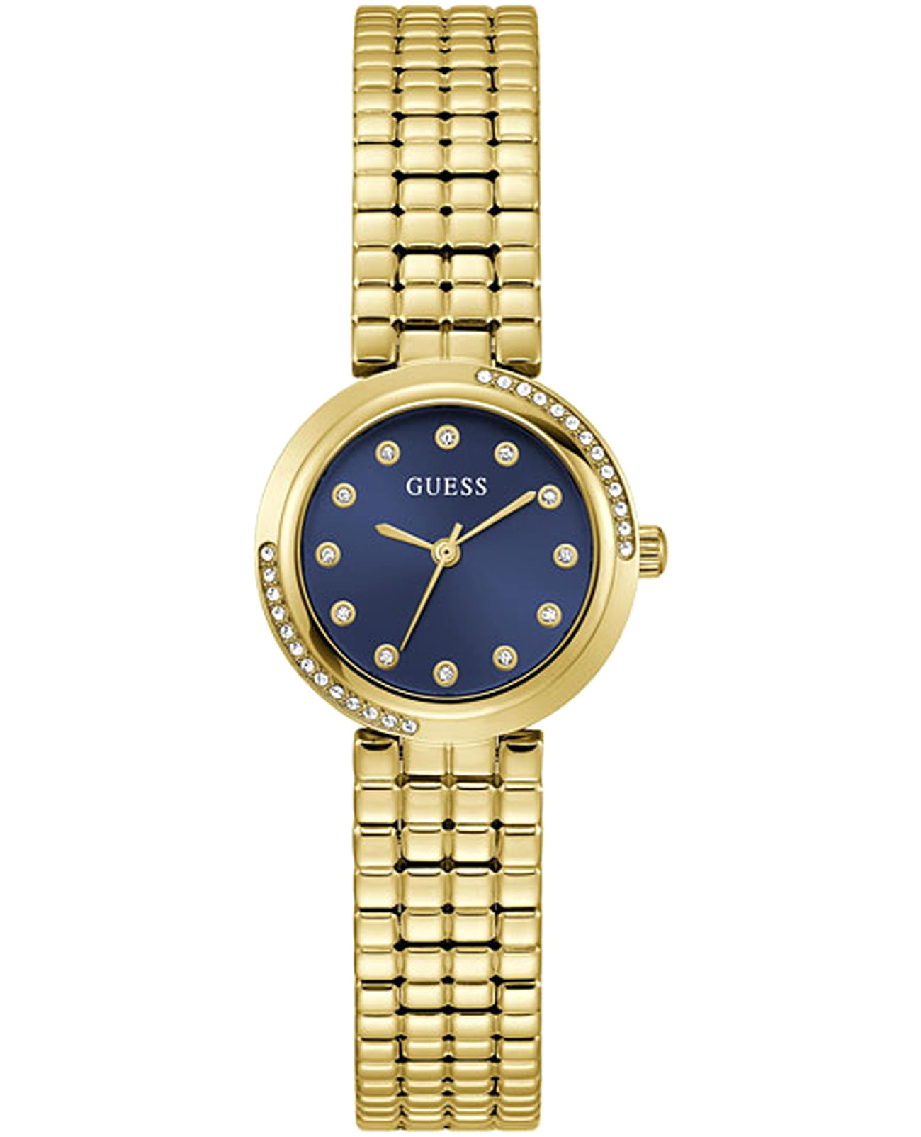Элегантные женские наручные часы Guess GW0930L4 сочетают в себе стиль и функциональность. Эти часы оснащены точным кварцевым механизмом, что гарантирует надежность и долговечность. Корпус часов выполнен из прочной нержавеющей стали с PVD-покрытиемPVDУльтратонкое покрытие наносится в технике вакуумного напыления, сочетает в себе нитрид титана особой прочности со слоем золота или оксида хрома. Несёт в себе декоративную или защитную функцию. золотистого цвета, диаметром 28 мм, а безельБезельВнешний ободок, закрепляющий стекло. В спортивных часах так называется поворотное кольцо с делениями на циферблате, выполняет роль таймера – замеряет отрезки времени на шкале. Неподвижный безель – элемент декора. Однонаправленно вращающийся безель на дайверских часах позволяет фиксировать моменты погружения и выныривания на поверхность. украшен изысканными кристаллами, придающими им роскошный вид. Циферблат добавляет изделию утонченности и особого шарма. Часы оснащены стальным браслетом с PVD-покрытиемPVDУльтратонкое покрытие наносится в технике вакуумного напыления, сочетает в себе нитрид титана особой прочности со слоем золота или оксида хрома. Несёт в себе декоративную или защитную функцию. на раскладной застёжкеРаскладная застёжкаТакой тип застёжки используется только на браслетах из металла. Она никогда не раскрывается полностью, происходит разделение на 2 и более частей. Раскладывающая застёжка снизит вероятность потери часов к минимуму., которая обеспечивает комфортное прилегание к запястью и надежную фиксацию. Минеральное стеклоМинеральное стеклоМинеральное стекло представляет собой искусственно выращенный минерал кварца. Такое стекло отличается особой устойчивостью к повреждениям и царапинам. Уступает по некоторым качествам сапфировому стеклу. защищает циферблат от царапин и повреждений, сохраняя его безупречный вид. Водозащита 30WR гарантирует защиту от случайных брызг и дождя, что делает эти часы практичным аксессуаром для повседневной жизни. Guess – это не просто аксессуар, это заявление о вашем безупречном вкусе и стремлении к совершенству.