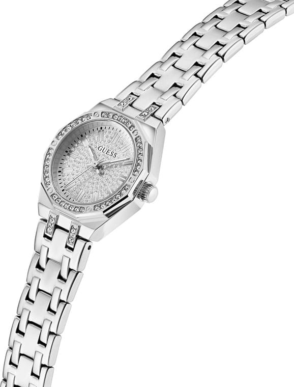 Элегантные женские наручные часы Guess GW0931L1 сочетают в себе стиль и функциональность. Эти часы оснащены точным кварцевым механизмом, что гарантирует надежность и долговечность. Корпус часов выполнен из прочной нержавеющей стали серебристого цвета, диаметром 25 мм, а безельБезельВнешний ободок, закрепляющий стекло. В спортивных часах так называется поворотное кольцо с делениями на циферблате, выполняет роль таймера – замеряет отрезки времени на шкале. Неподвижный безель – элемент декора. Однонаправленно вращающийся безель на дайверских часах позволяет фиксировать моменты погружения и выныривания на поверхность. украшен изысканными кристаллами, придающими им роскошный вид. Циферблат добавляет изделию утонченности и особого шарма. Часы оснащены стальным браслетом на раскладной застёжкеРаскладная застёжкаТакой тип застёжки используется только на браслетах из металла. Она никогда не раскрывается полностью, происходит разделение на 2 и более частей. Раскладывающая застёжка снизит вероятность потери часов к минимуму., которая обеспечивает комфортное прилегание к запястью и надежную фиксацию. Минеральное стеклоМинеральное стеклоМинеральное стекло представляет собой искусственно выращенный минерал кварца. Такое стекло отличается особой устойчивостью к повреждениям и царапинам. Уступает по некоторым качествам сапфировому стеклу. защищает циферблат от царапин и повреждений, сохраняя его безупречный вид. Водозащита 30WR гарантирует защиту от случайных брызг и дождя, что делает эти часы практичным аксессуаром для повседневной жизни. Люминесцентное покрытиеЛюминесцентное покрытиеПозволяет считывать показания времени в темноте. Производители наносят на стрелки, часовые индексы, безель или поверхность циферблата светонакопительный состав, дающий холодное свечение. на стрелках обеспечивает отличную видимость в темноте. Guess – это не просто аксессуар, это заявление о вашем безупречном вкусе и стремлении к совершенству.