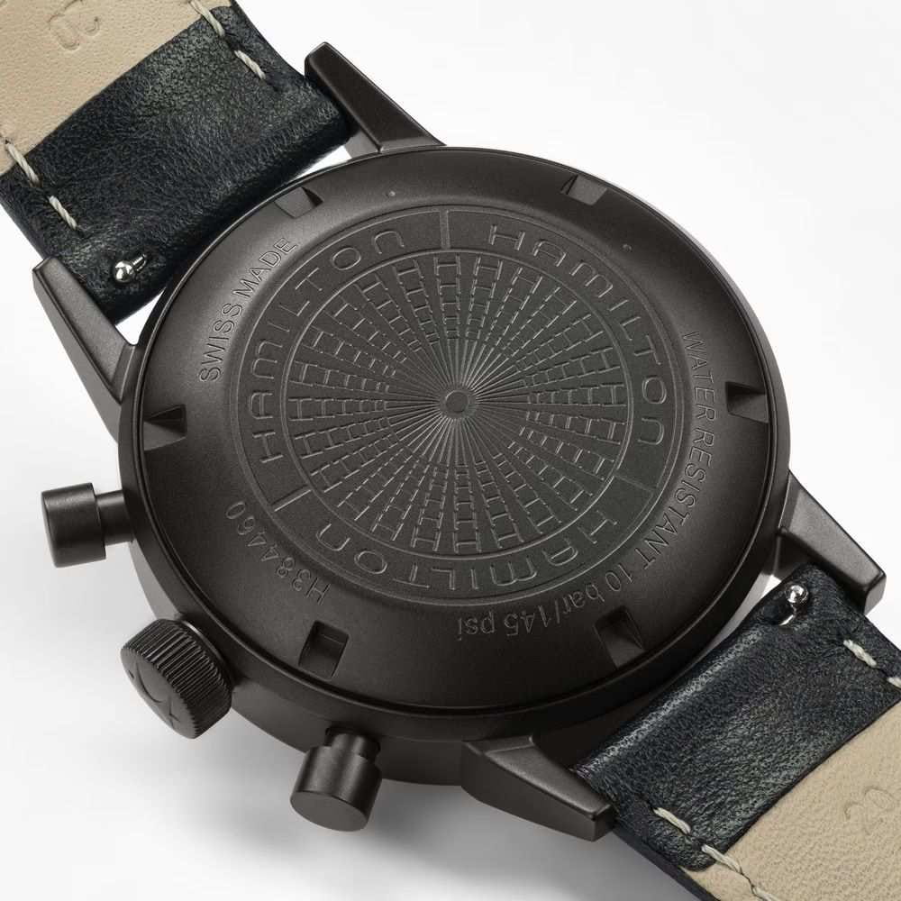 Hamilton Intra-Matic Auto Chrono H38446730 — выразительный хронограф с насыщенной винтажной эстетикой и современным техническим исполнением. Корпус диаметром 40 мм выполнен из нержавеющей стали с PVD-покрытиемPVDУльтратонкое покрытие наносится в технике вакуумного напыления, сочетает в себе нитрид титана особой прочности со слоем золота или оксида хрома. Несёт в себе декоративную или защитную функцию. чёрного цвета, придающим часам элегантность и строгость. Циферблат защищён выпуклым сапфировым стекломСапфировое стеклоПрочный и надёжный материал из кристалла сапфира синтетического происхождения, характеризующийся особой твёрдостью и устойчивостью к царапинам и повреждениям. с антибликовым покрытиемАнтибликовое покрытиеСлой оксида металла в 0,13-0,3 микрон, благодаря которому стекло часов не бликует и не отражает свет. Антибликовое покрытие уменьшает отражение света в 10 раз, обеспечивая отличную читаемость показателей циферблата., устойчивым к царапинам и бликам. Чёрный матовый циферблат оформлен в стиле «панда» с двумя белыми субциферблатами: малой секундной стрелкой и 30-минутным счётчиком. Указатели и стрелки покрыты люминесцентным покрытиемЛюминесцентное покрытиеПозволяет считывать показания времени в темноте. Производители наносят на стрелки, часовые индексы, безель или поверхность циферблата светонакопительный состав, дающий холодное свечение. для хорошей читаемости в тёмное время. Также присутствует тахиметрическая шкала и окно даты на «6 часах». Модель оснащена автоматическим хронографомХронографФункция позволяет измерять отрезки времени с особой точностью: часы, минуты, секунды. Верным признаком хронографа является наличие на циферблате 3 дополнительных окошек-счётчиков. калибра H-31 (на базе ETA/Valjoux 7753) с запасом хода до 60 часов. Часы комплектуются перфорированным чёрным кожаным ремешком в спортивном стиле с классической застёжкой-пряжкой. Водонепроницаемость 100 метров делает модель подходящей как для повседневного ношения, так и для активного образа жизни. Intra-Matic Auto Chrono — идеальный выбор для тех, кто ценит винтажный стиль, функциональность и швейцарскую механику.